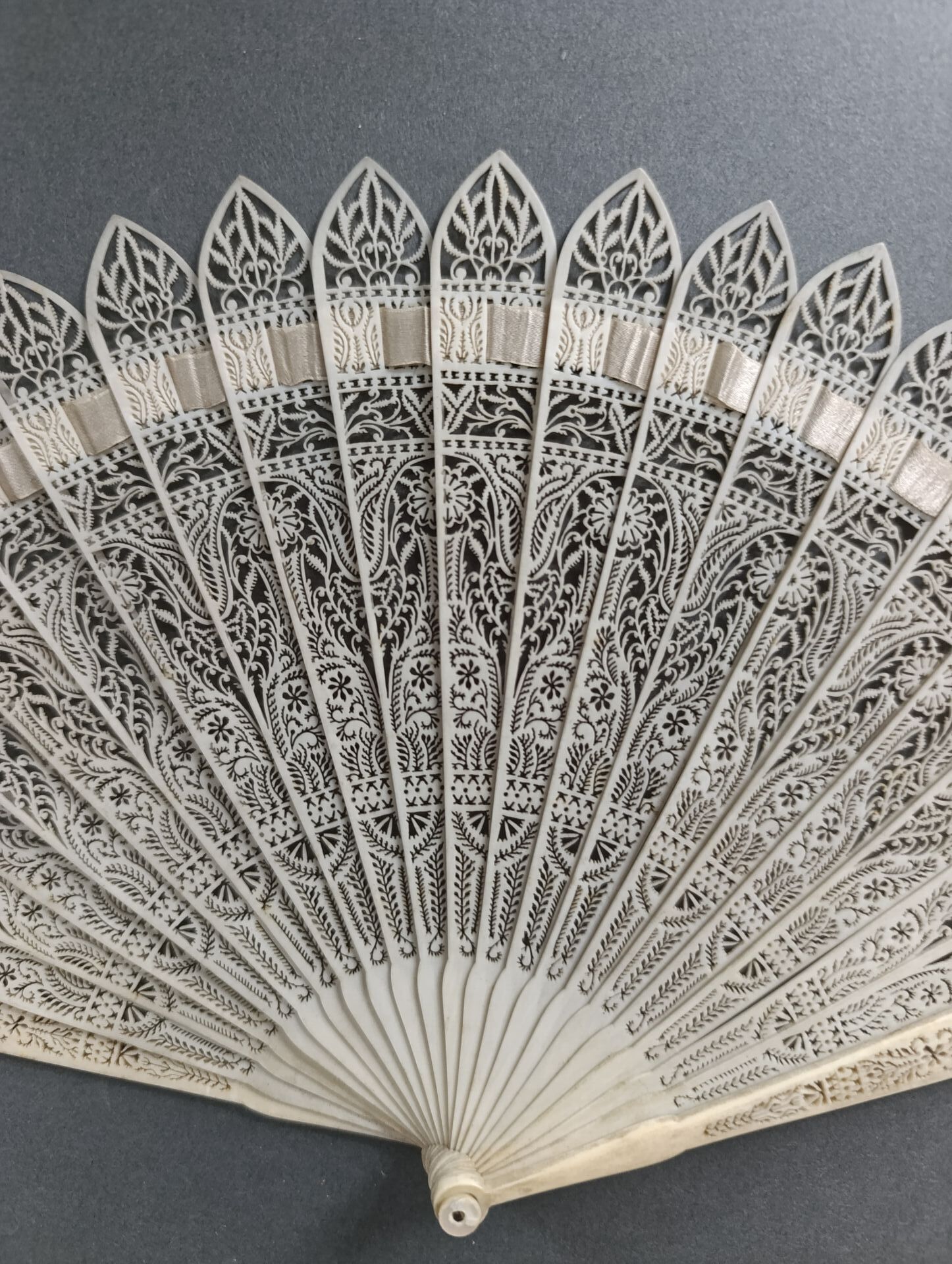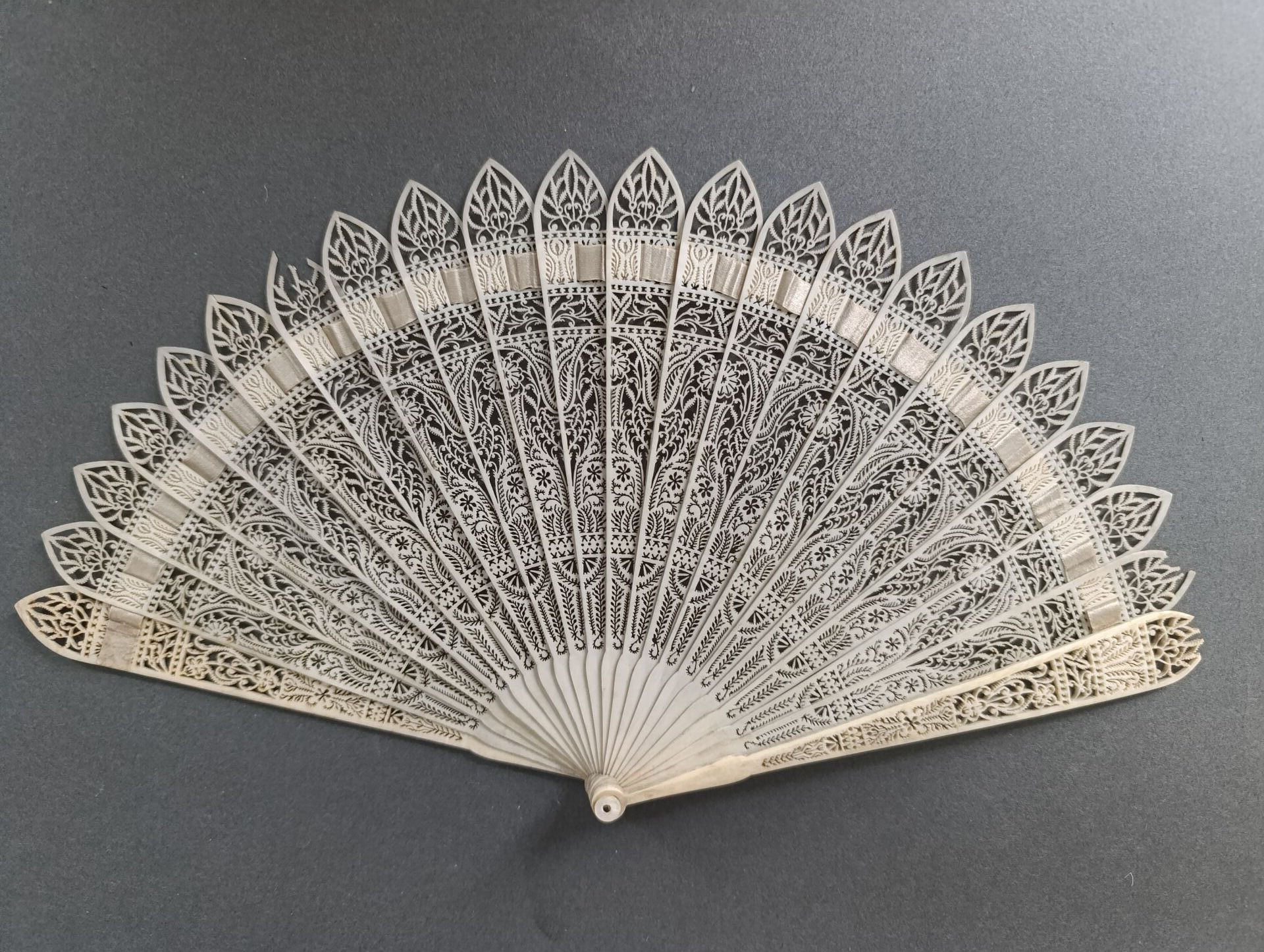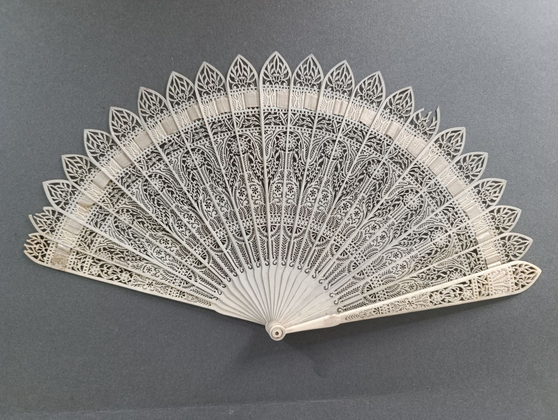 Éventail de type brisé en os finement repercé de roses et rinceaux. Le haut des brins terminés en ogives, dans le goût néo-gothique.