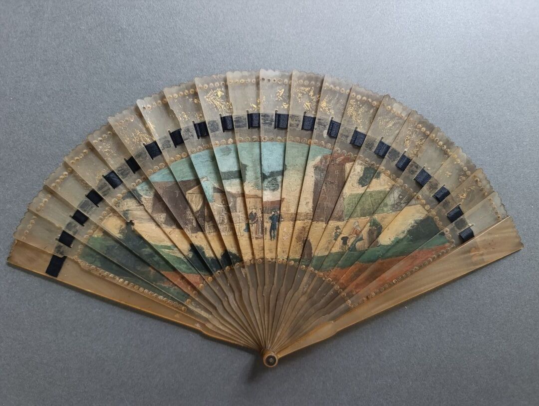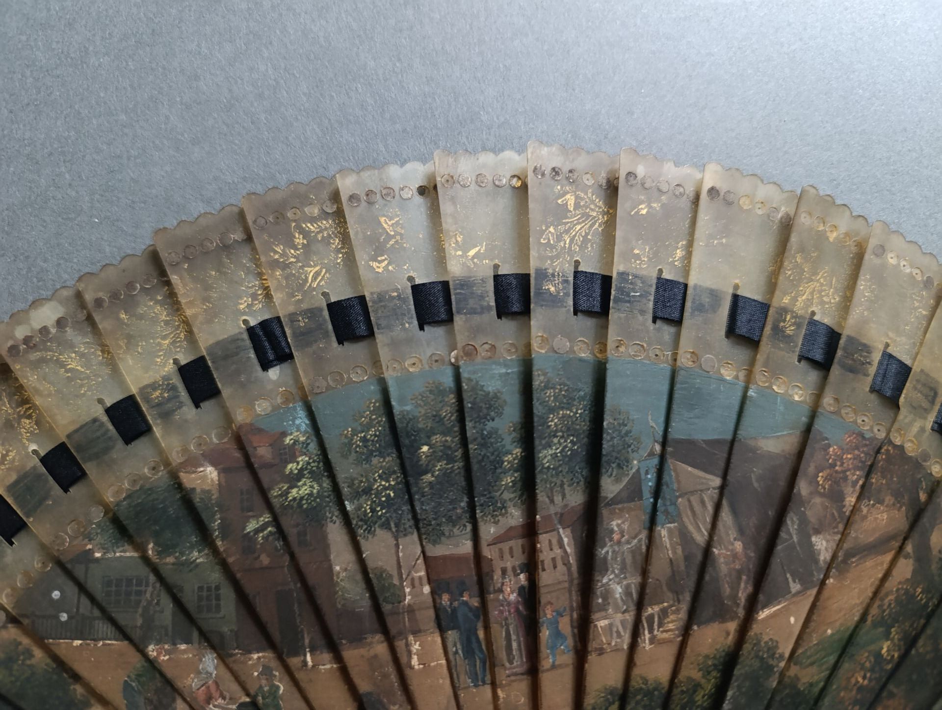 Éventail de type brisé en corne blonde peinte d'une vue de promenade plantée peut-être à Paris, sur le futur "boulevard du crime ", avec des curieux arrêtés devant les tréteaux d'un théâtre en plein air. Un comédien se produit sur les planches.