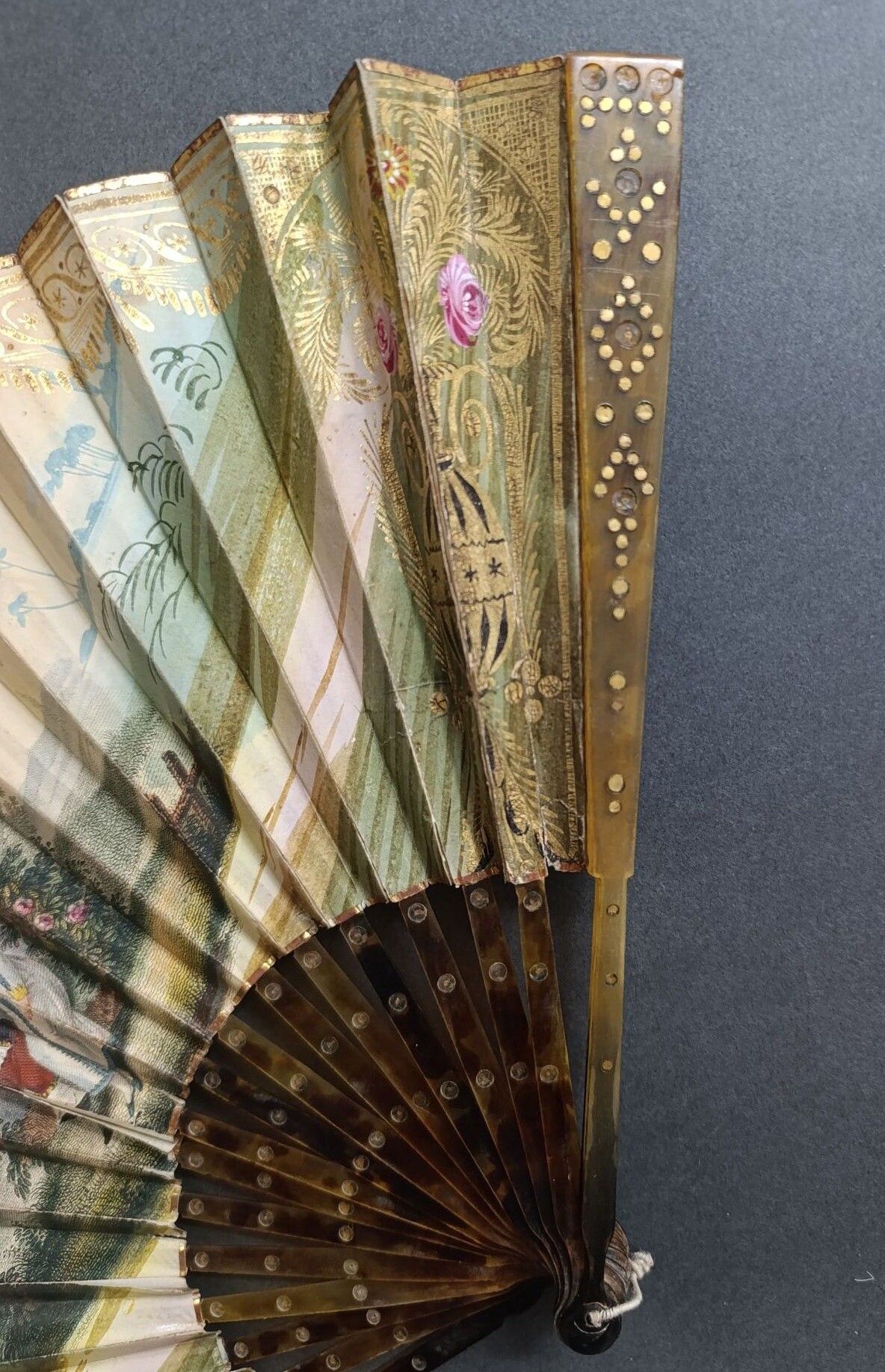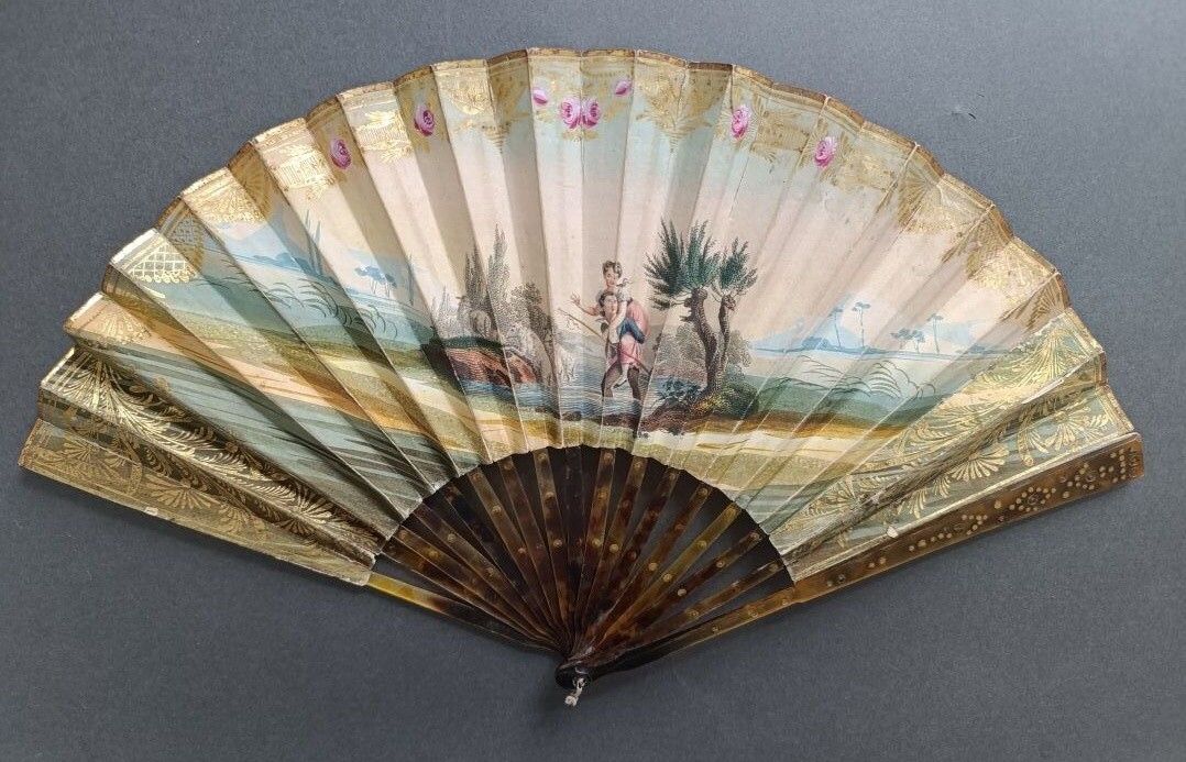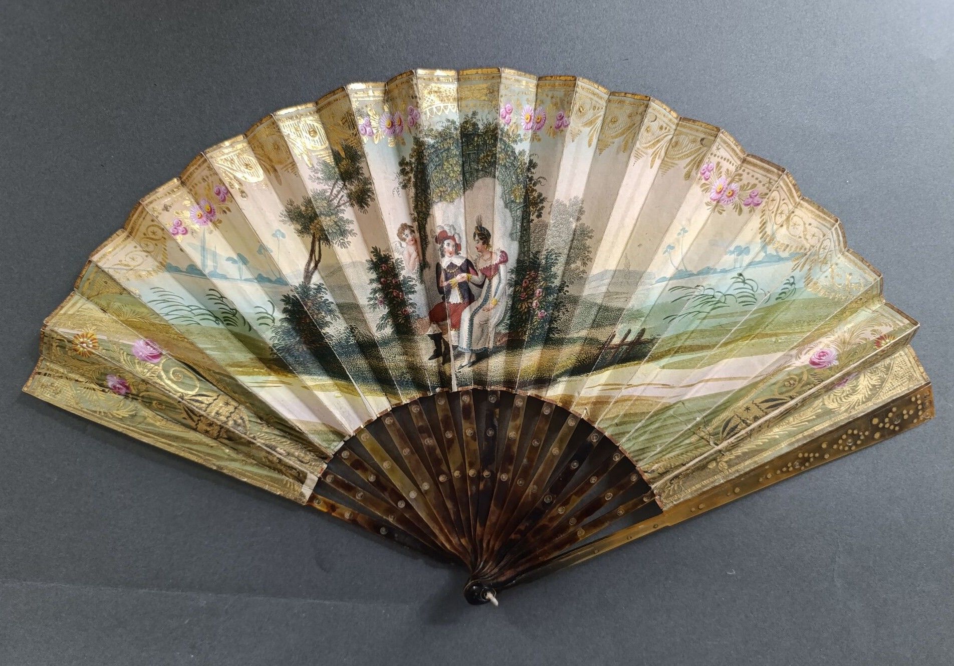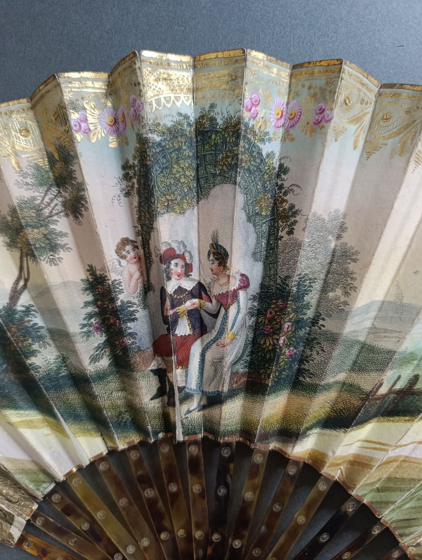 Éventail plié, la feuille en papier gravé d'une scène galante dans le goût médiéval, sous le regard de l'Amour.