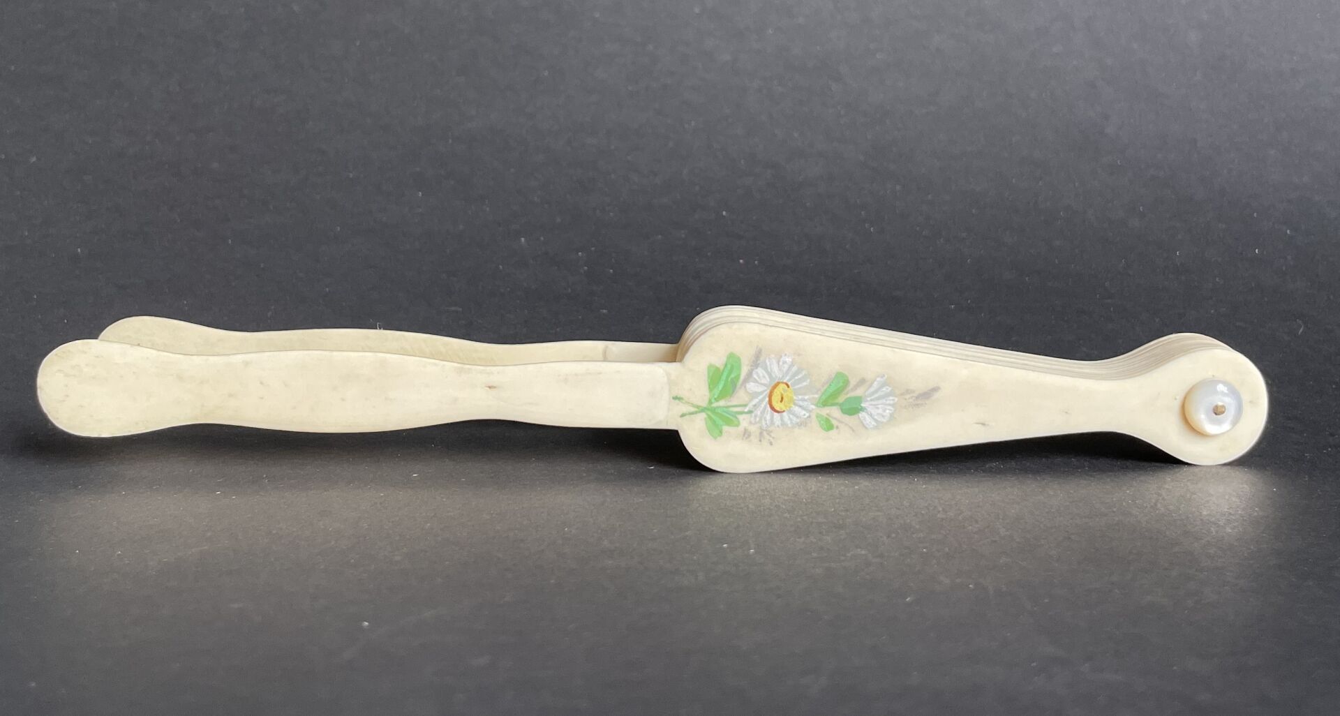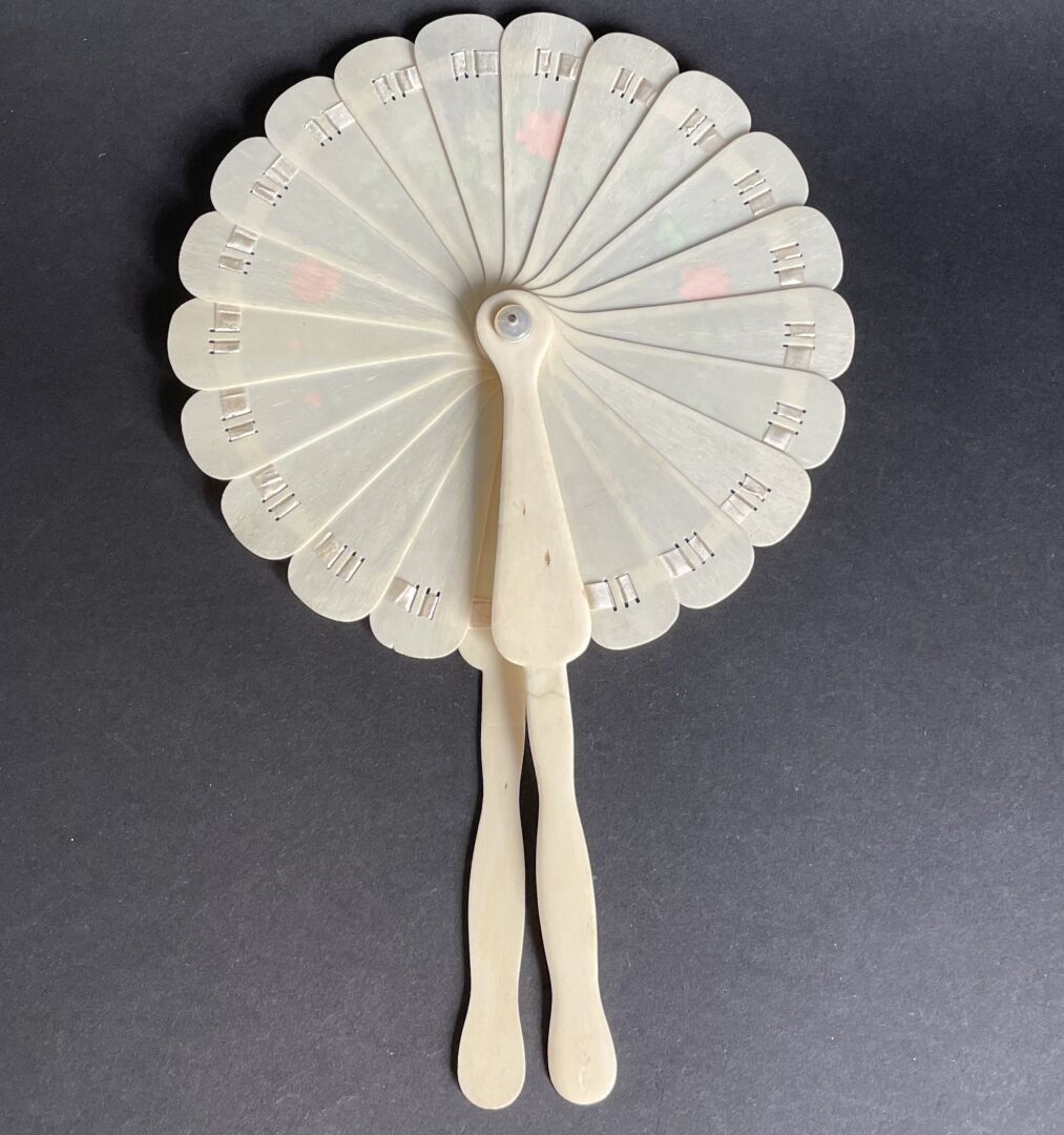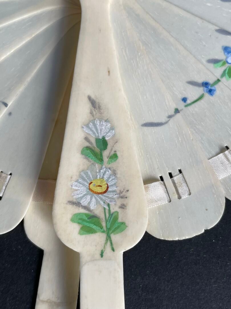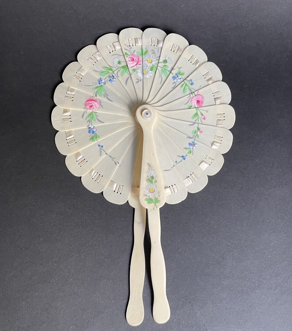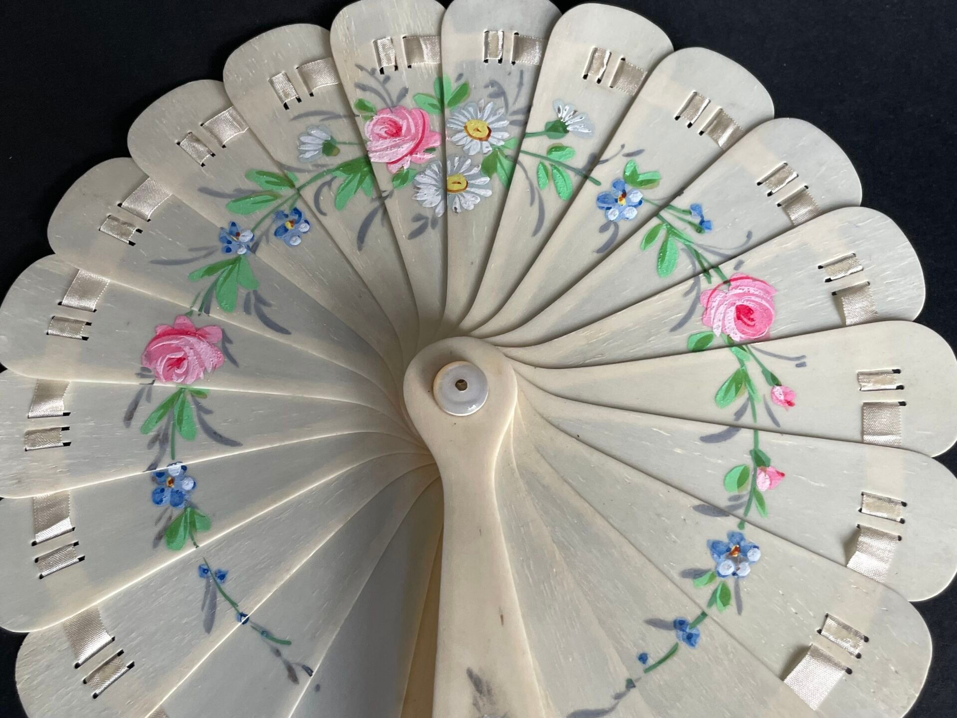 Éventail de type cocarde en os peint d'une guirlande de roses, myosotis et pâquerettes.