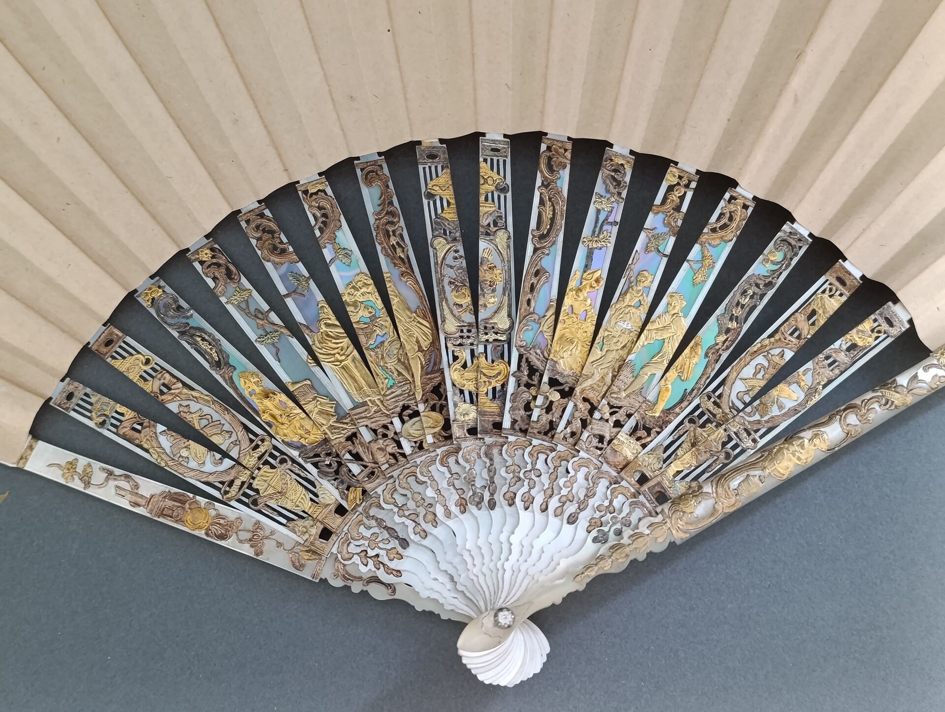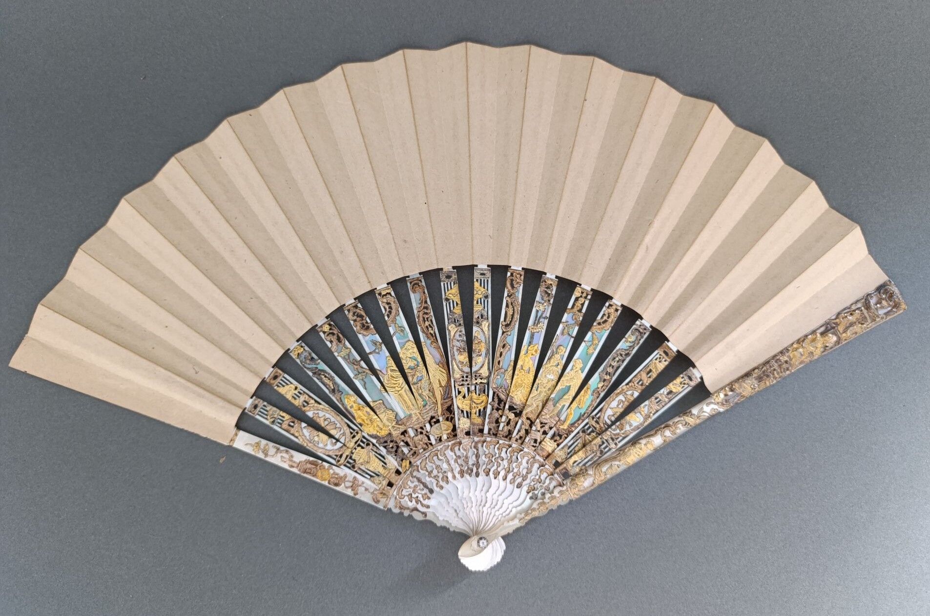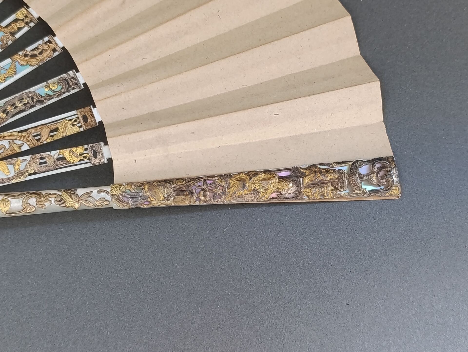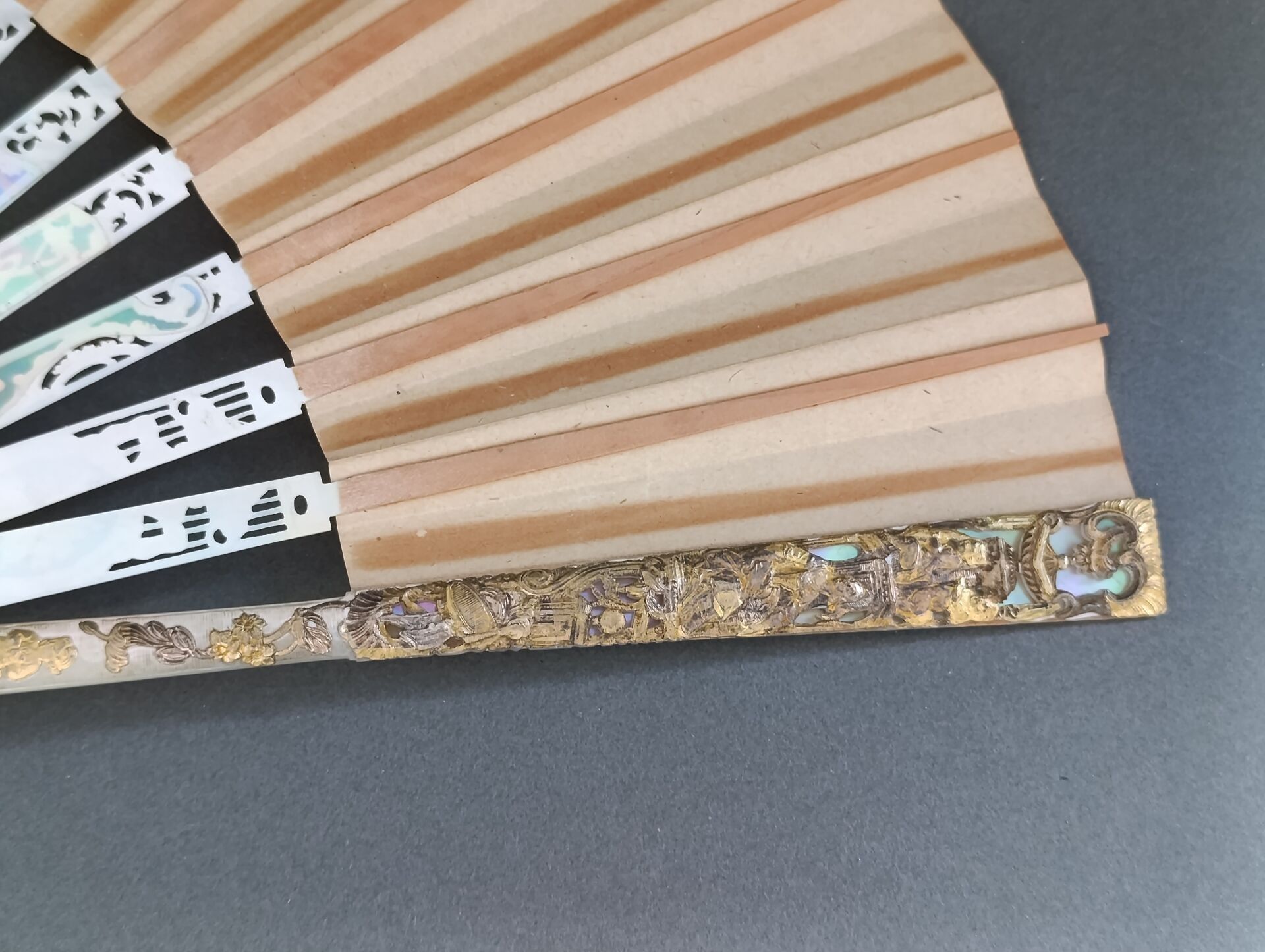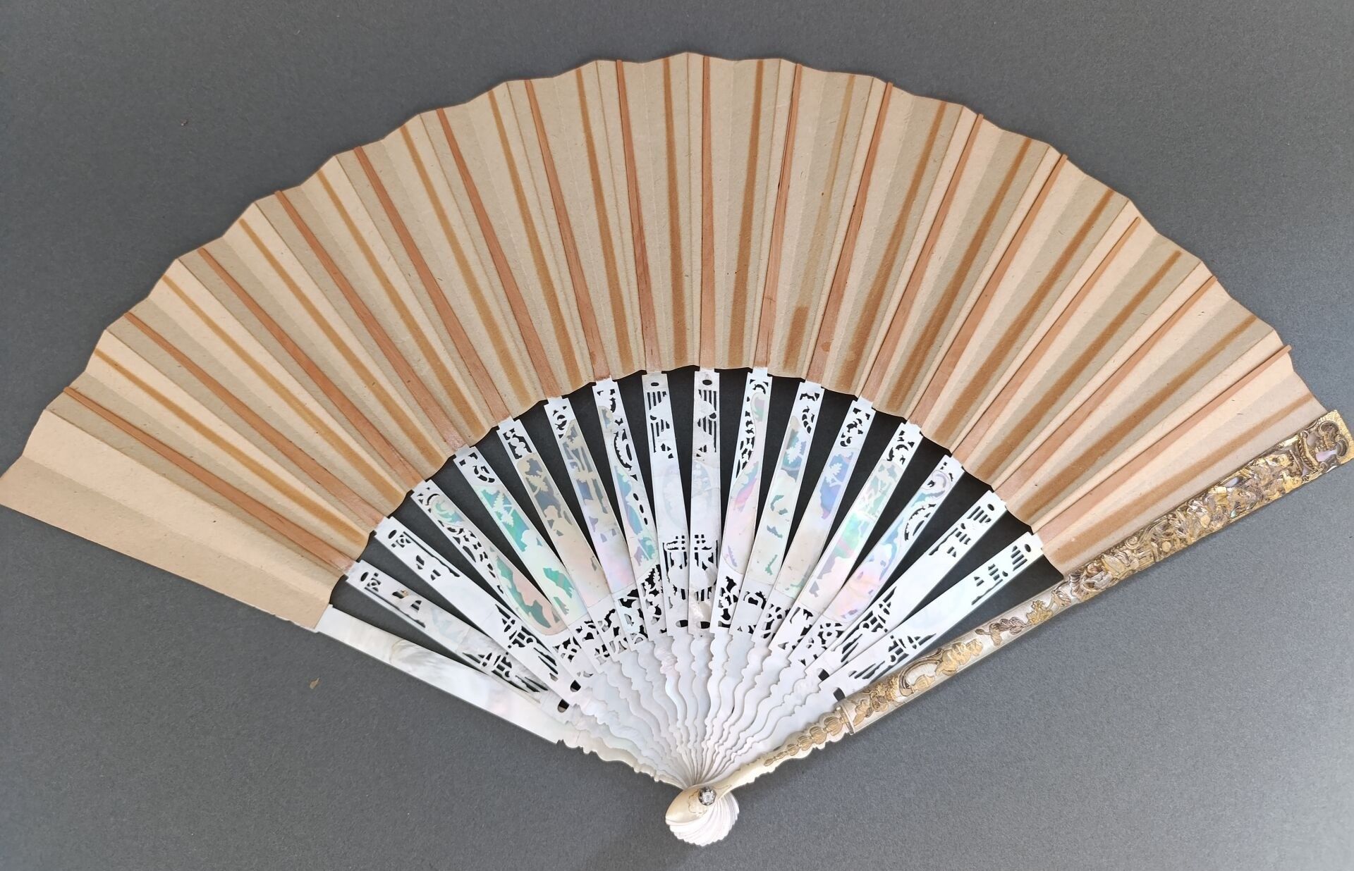 Monture en nacre blanche finement repercée, sculptée, gravée, burgautée et dorée.