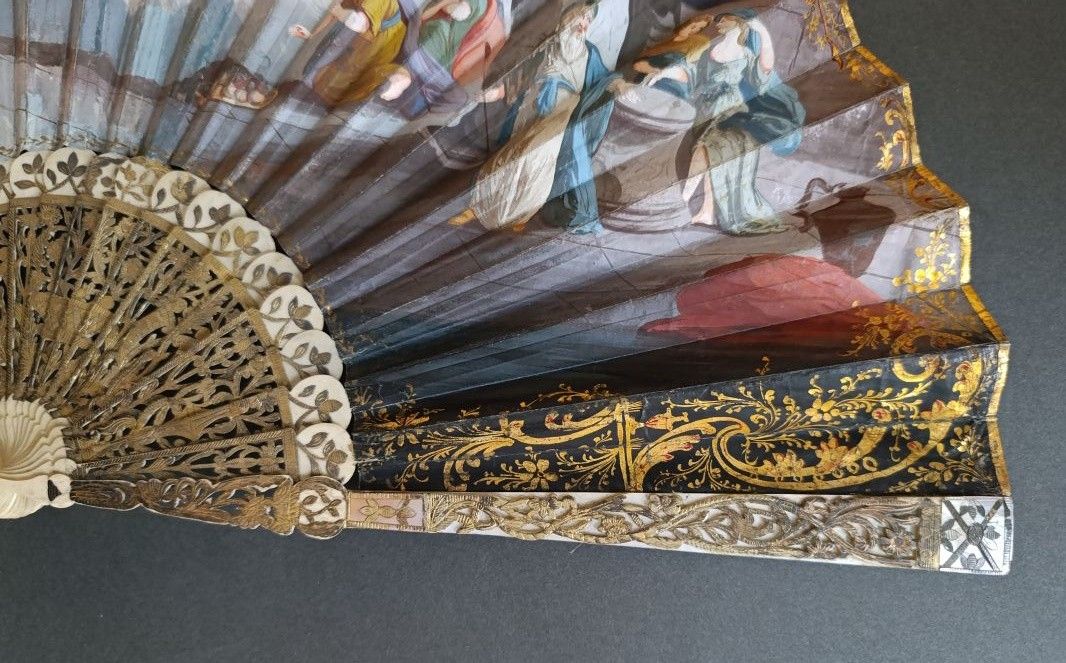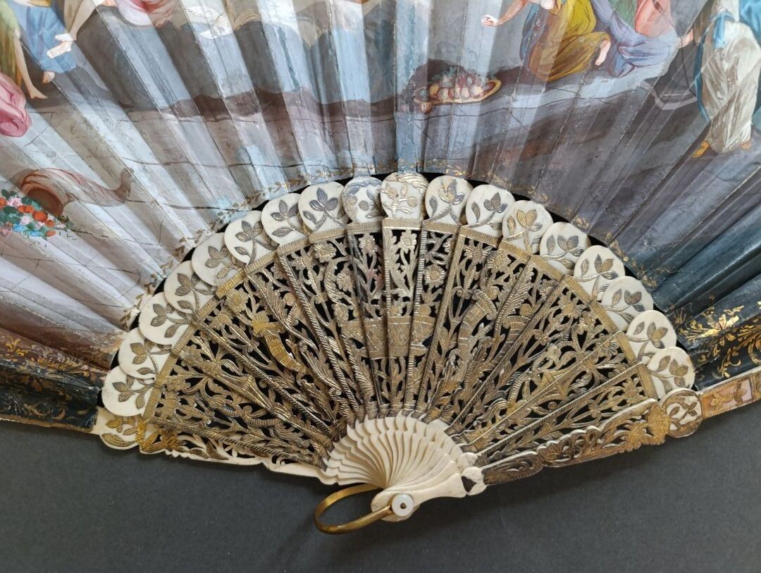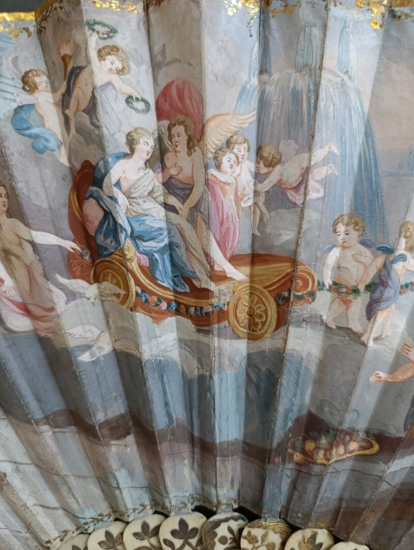 Éventail plié, la feuille en papier doublé de peau et peint à la gouache de l'union de Zéphyr et Flore, entourés par les amours.