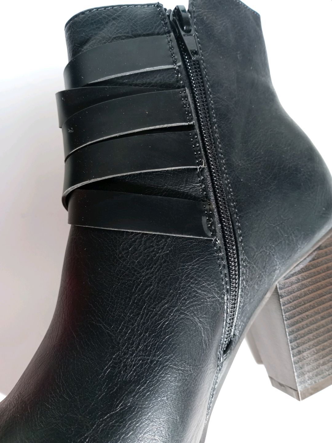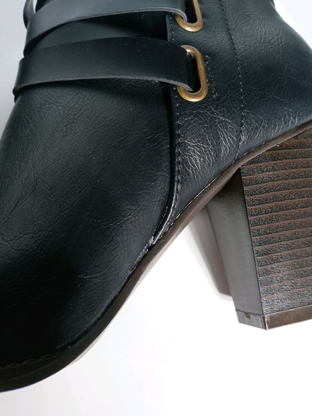 Bottines à talons en similicuir noir boucle dorée - JUSTFAB - pointure 42 - petits défauts de fabrication visible sur les photos - Neuf - TVA Récupérable - Ce lot chez vous partout en France métropolitaine à partir de 12,24 € - Ce lot chez vous partout en Europe à partir de 18,00 €