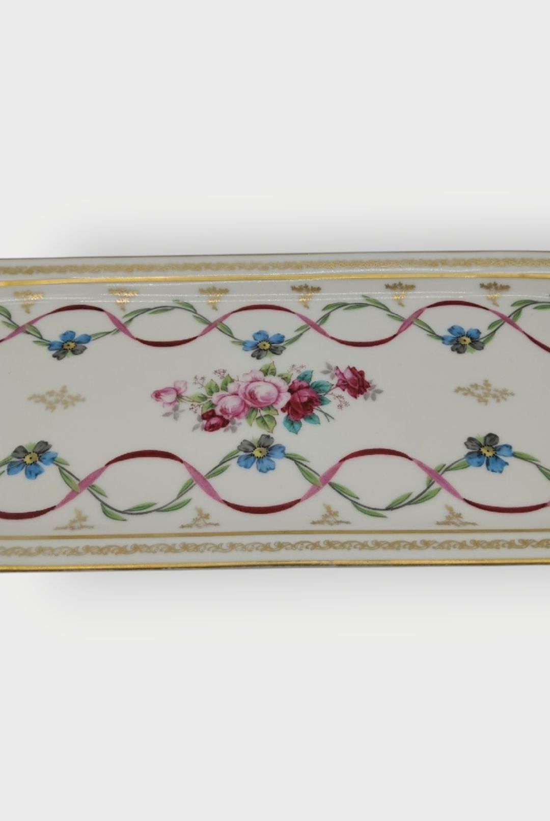LIMOGES FRANCE - Plat en porcelaine à décor peint à la main de guirlandes de fleurs, de rubans et de liserés dorés. Signé au revers "Charles Ahrenfeldt - Limoges France - Peint à la main". L.41 cm - Ce lot chez vous partout en France métropolitaine à partir de 12,24 € - Ce lot chez vous partout en Europe à partir de 18,00 €