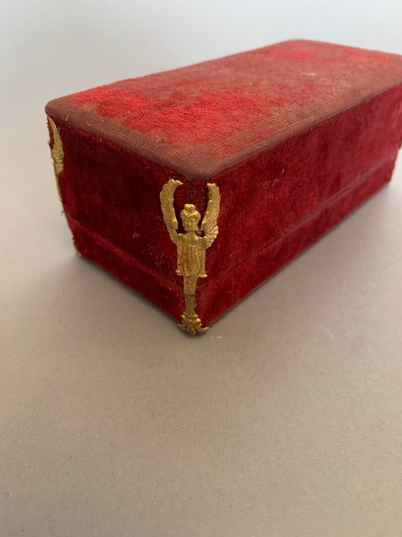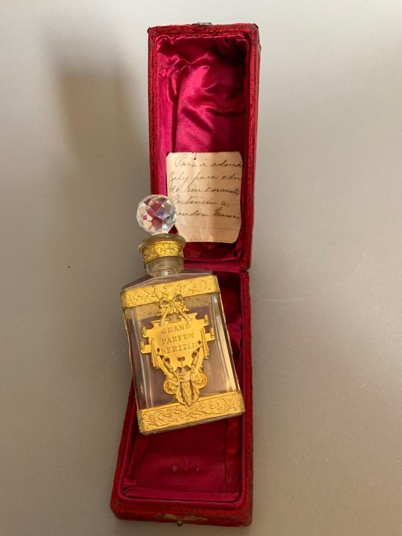 Très rare flacon-carafon en cristal incolore pressé moulé de section rectangulaire, sa panse cubique habillée de sa monture en laiton ajouré figurant un brûle parfum sur une face, de deux caryatides ailées sur deux faces, d'un blason ouvragé faisant office d'étiquette titrée, ornés de deux frises gréco-antique, col à carnette bagué de laiton à décor de chevaux ailés, coiffé de son bouchon boule facettée, présenté dans son coffret en peuplier gainé de velours (usures) intérieur satin rouge, agrémenté d'écoinçons en laiton estampé figurant quatre caryatides ailées (manques), avec une dédicace en portugais "Para a adorable Zely para o dia de seu casamento , perteneceu a saudosa mama " (Pour l'adorable Zely pour son mariage, il appartenait à sa défunte mère) - Provenance : Rio de Janeiro - Brésil .
