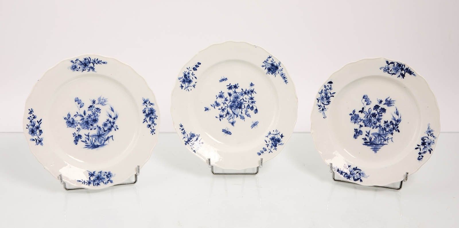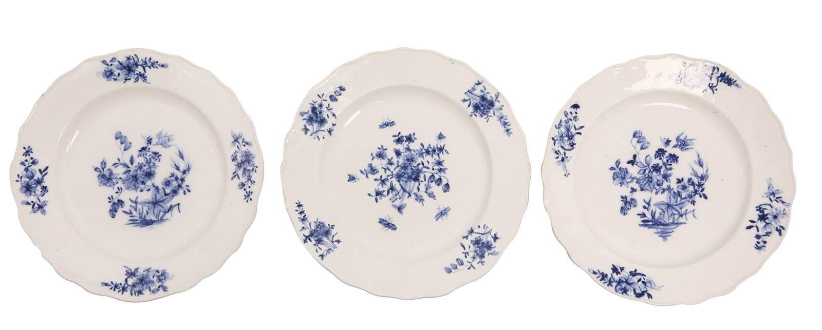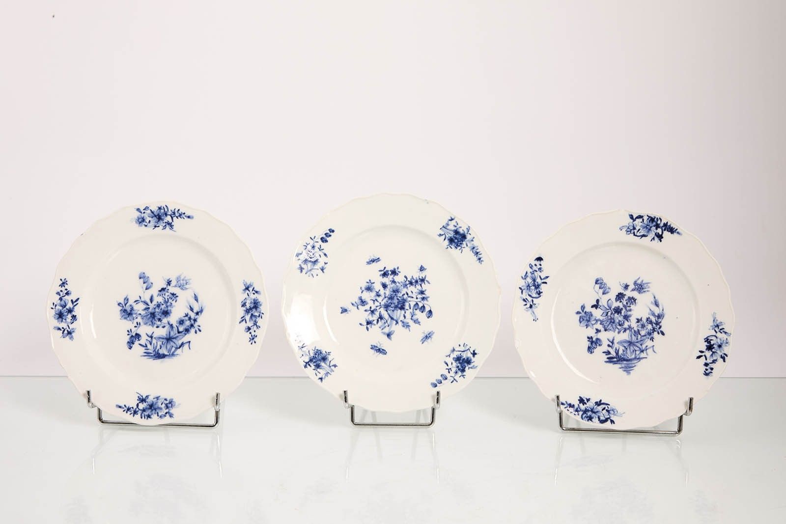 95 Tournai : trois assiettes en porcelaine tendre à décors de fleurs peints en camaïeu bleu de grand feu. Epoque : vers 1755. Etat : petits éclats. Diam : 21.8 cm