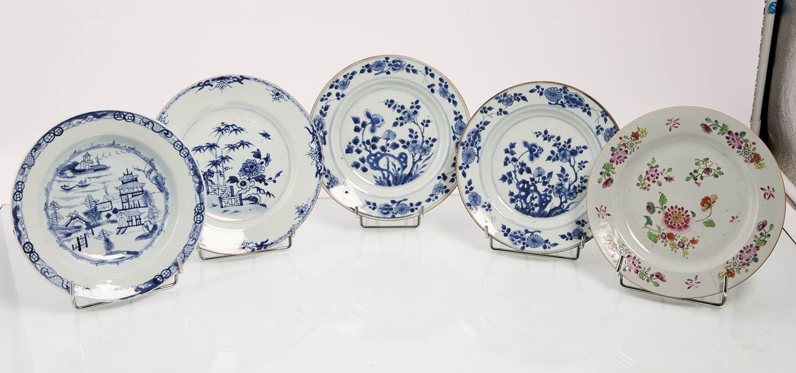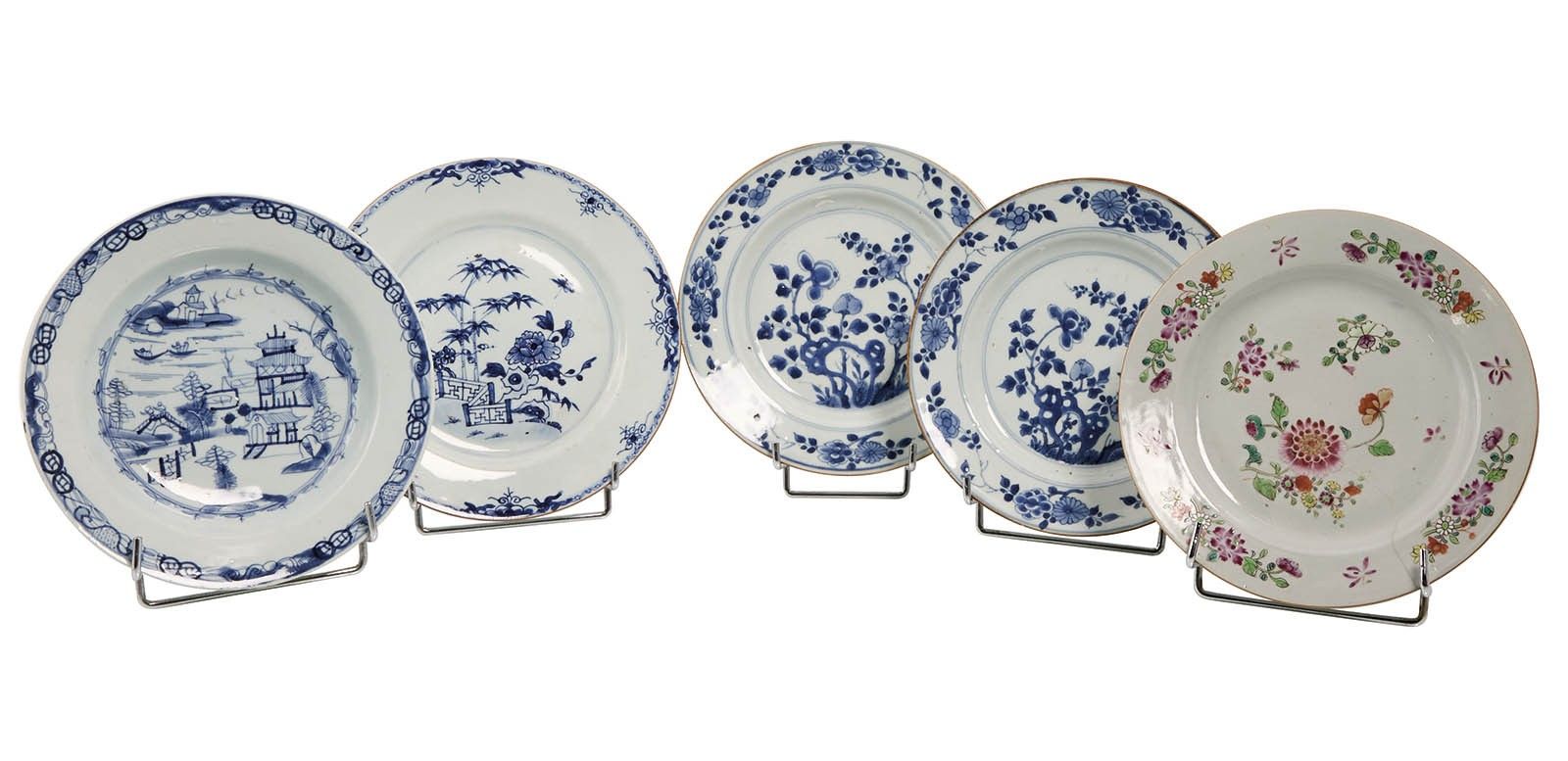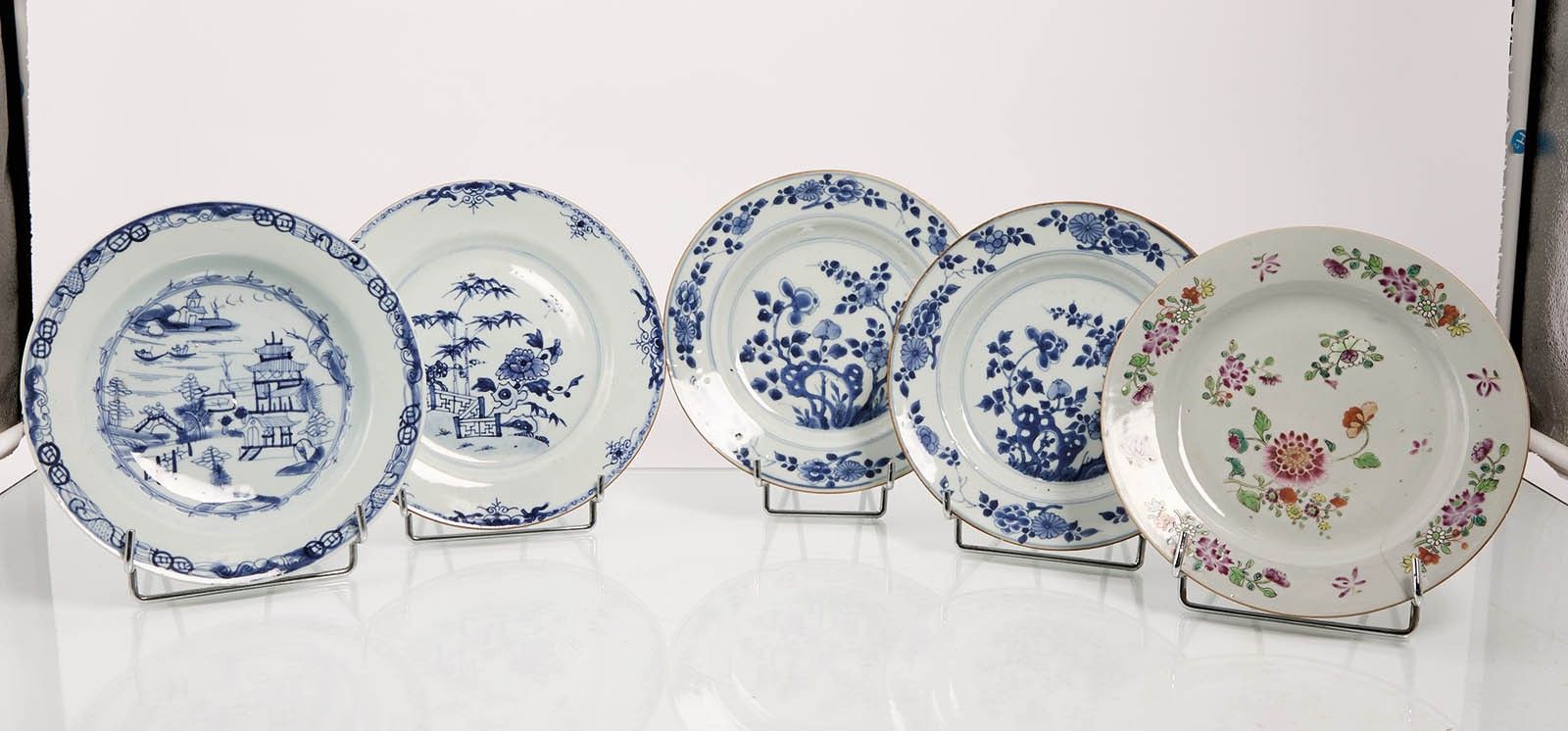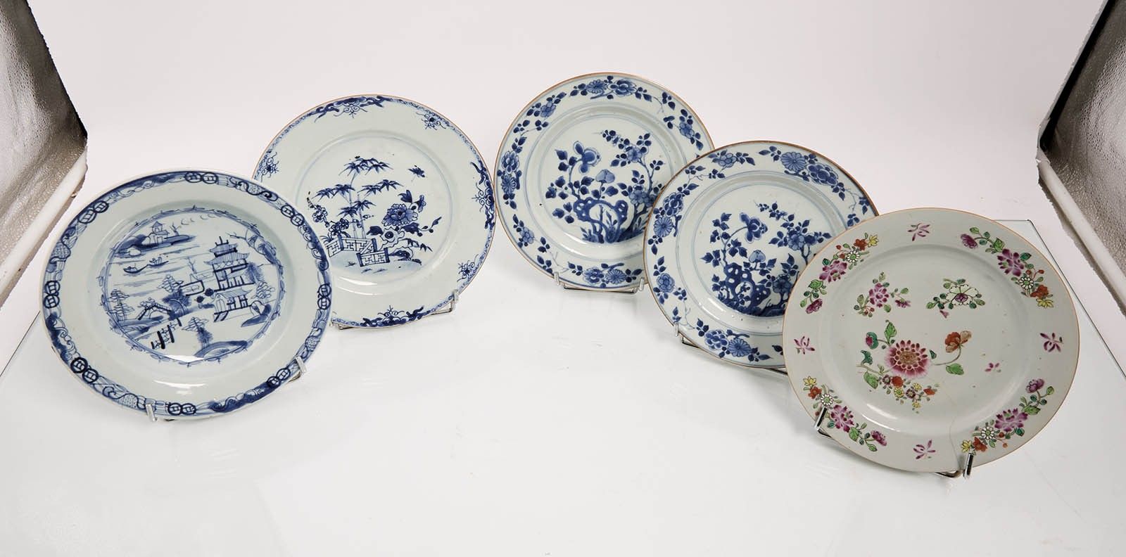 107 Chine : lot de 3 assiettes plates et 1 assiette creuse en porcelaine kaolinique à décor bleu de grand feu. On y joint une assiette plate en porcelaine de chine à décor de fleurs polychrome fêlée. Epoque : Qianlong 1736-1795. Etat : fêles à l'une. Egrenures. Diam : 23 cm.