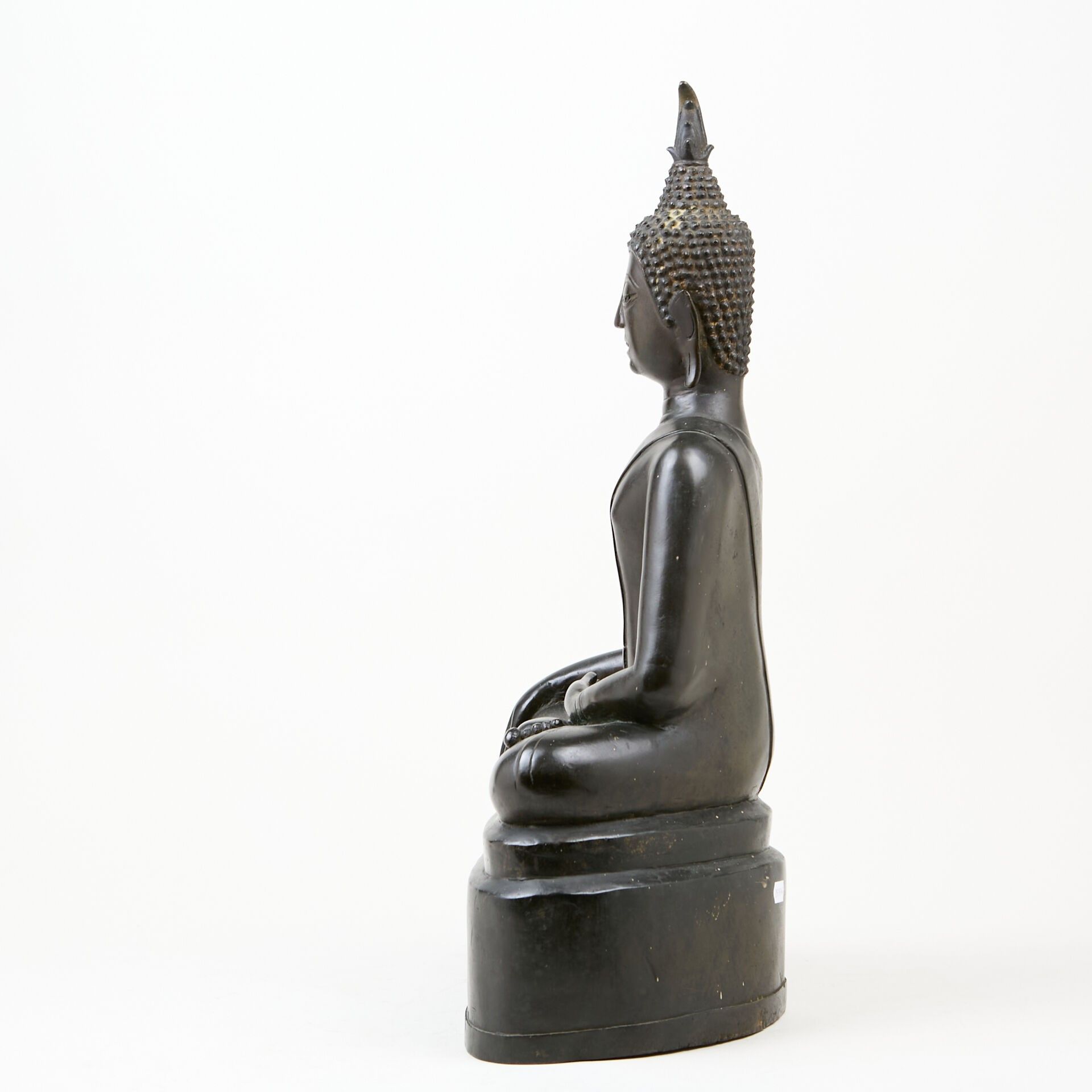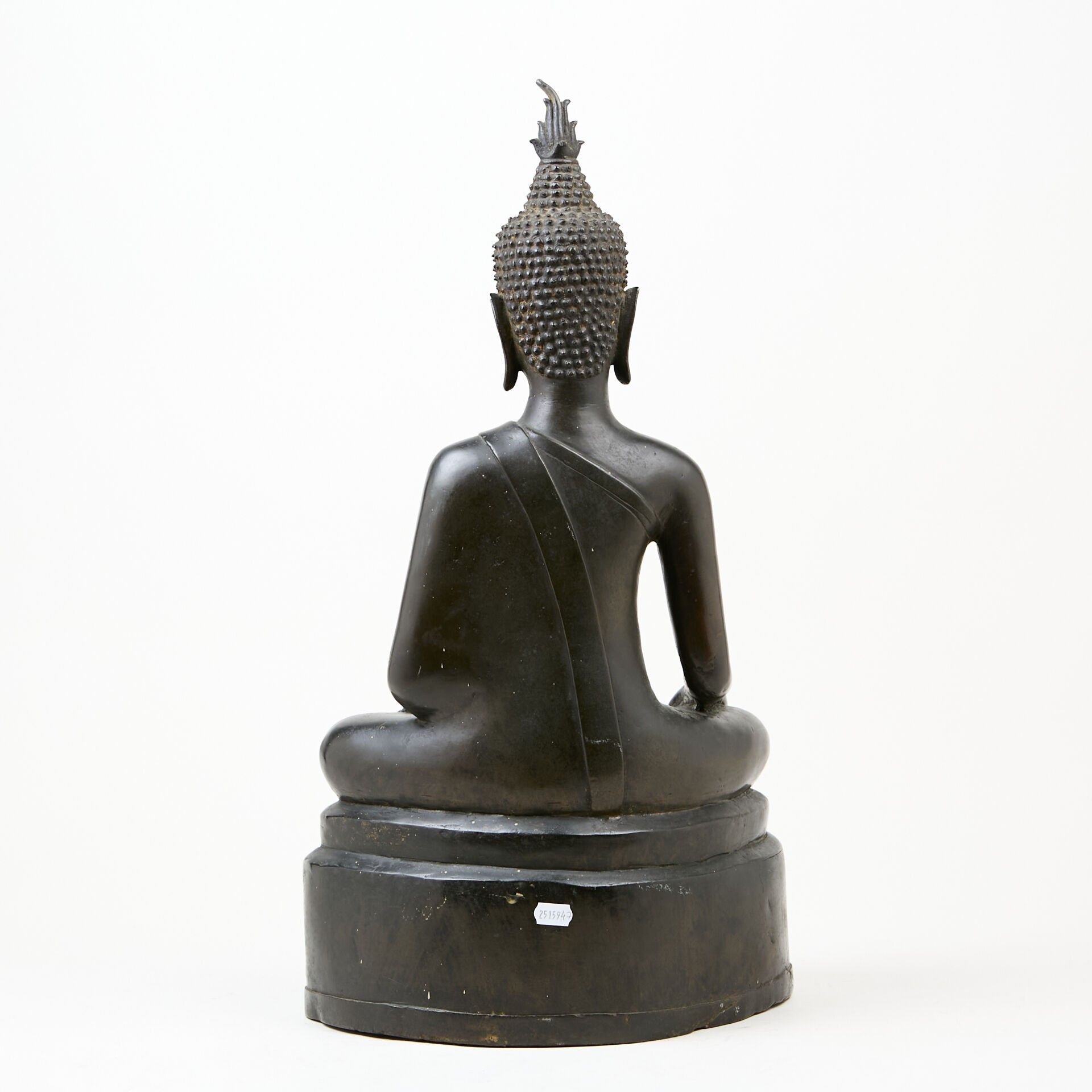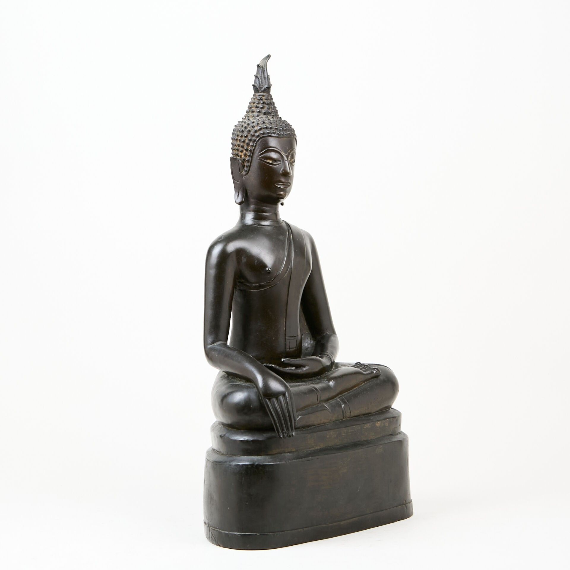Important bouddha en bronze de belle patine brune représenté assis en prise de la terre à témoin « bhumisparsha mudra ».