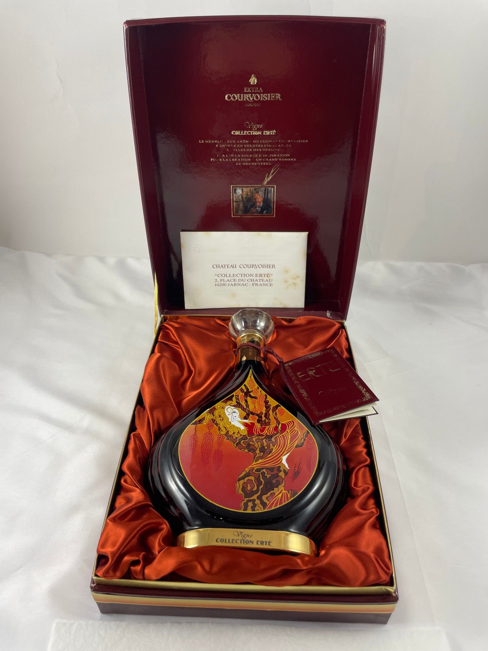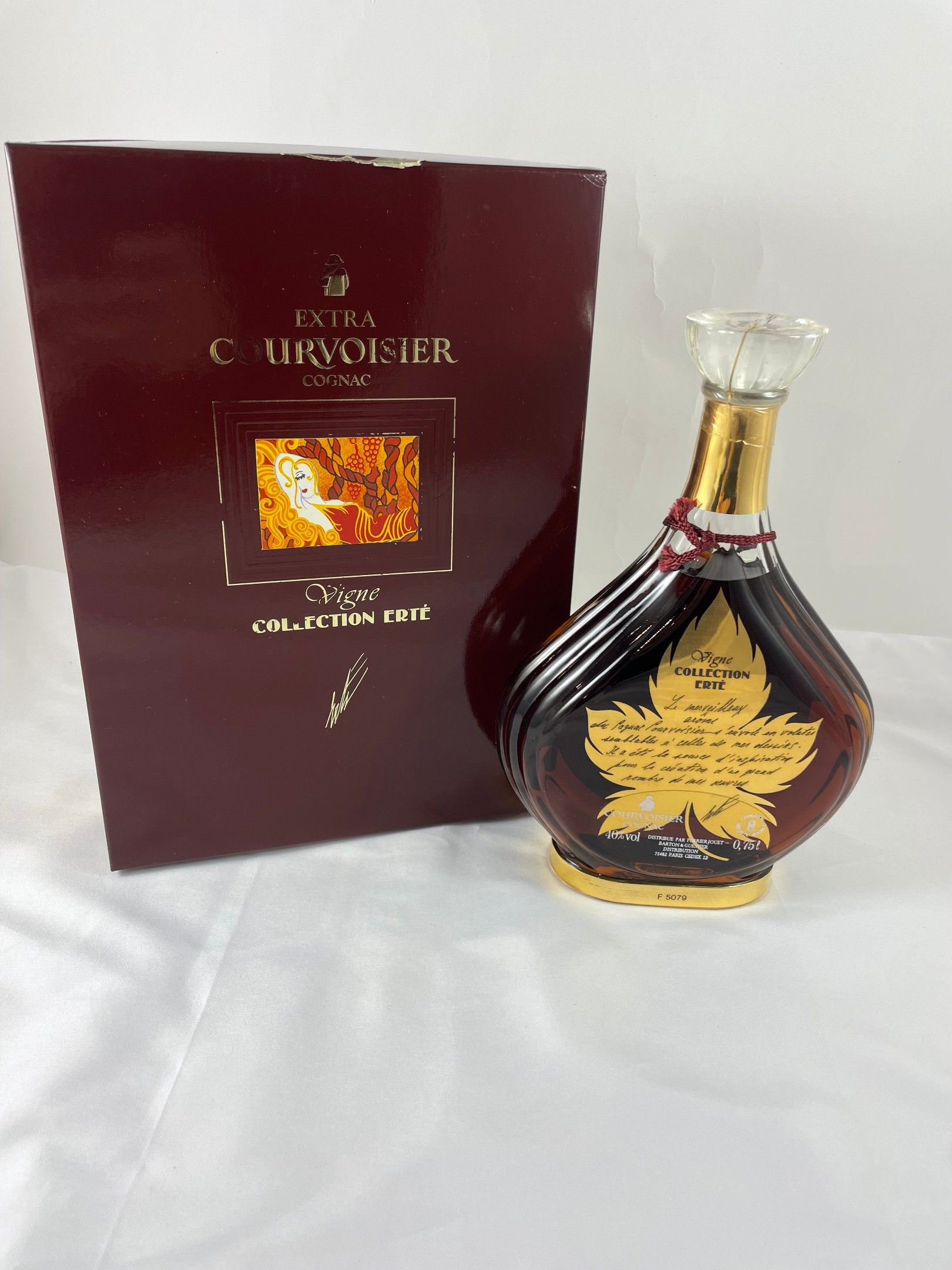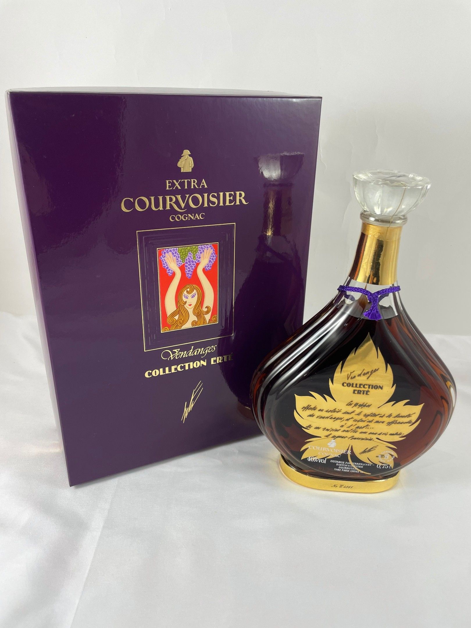 8 btls de Cognac Courvoisier - Collection ERTE - Chaque bouteille est accompagnée de son coffret d'origine, lui-même protégé par un suremboitage en plastique - 1. Vigne 2. Vendanges 3. Distillation 4. Vieillissement 5. Dégustation 6. L'Esprit du Cognac 7. La Part des Anges 8. Inédit