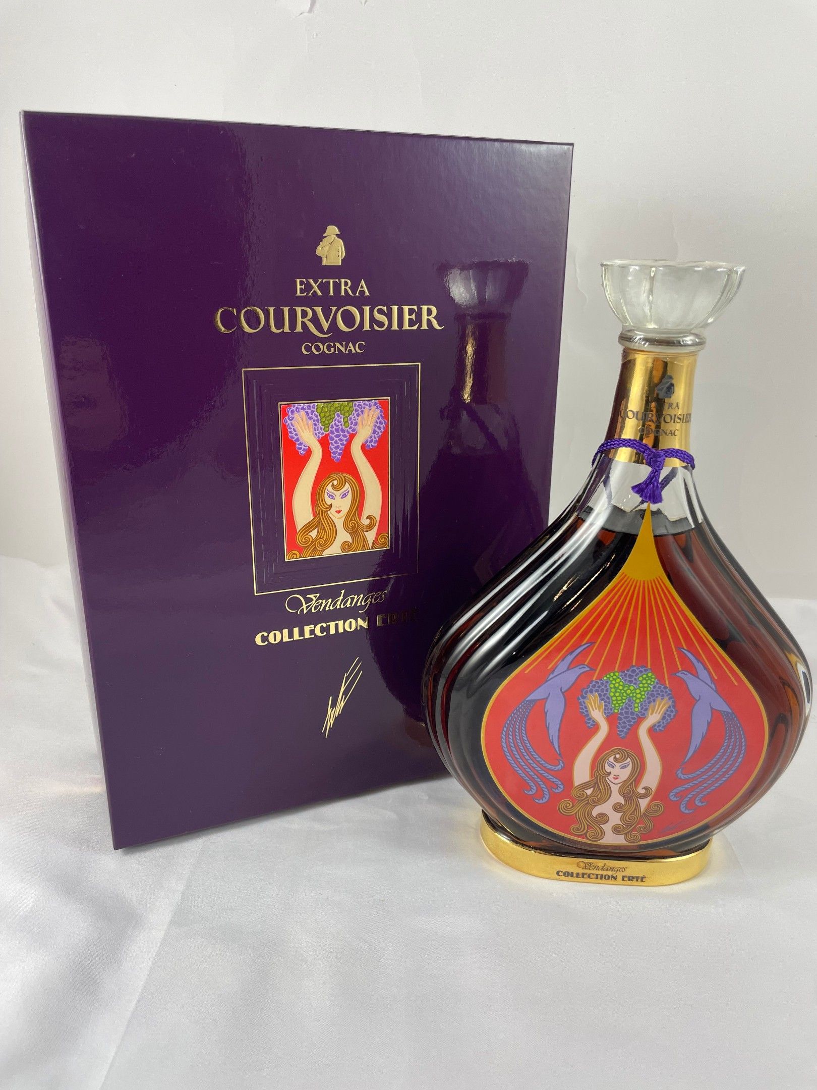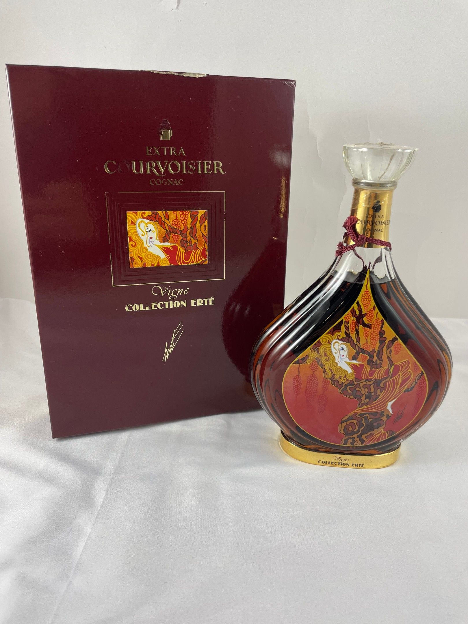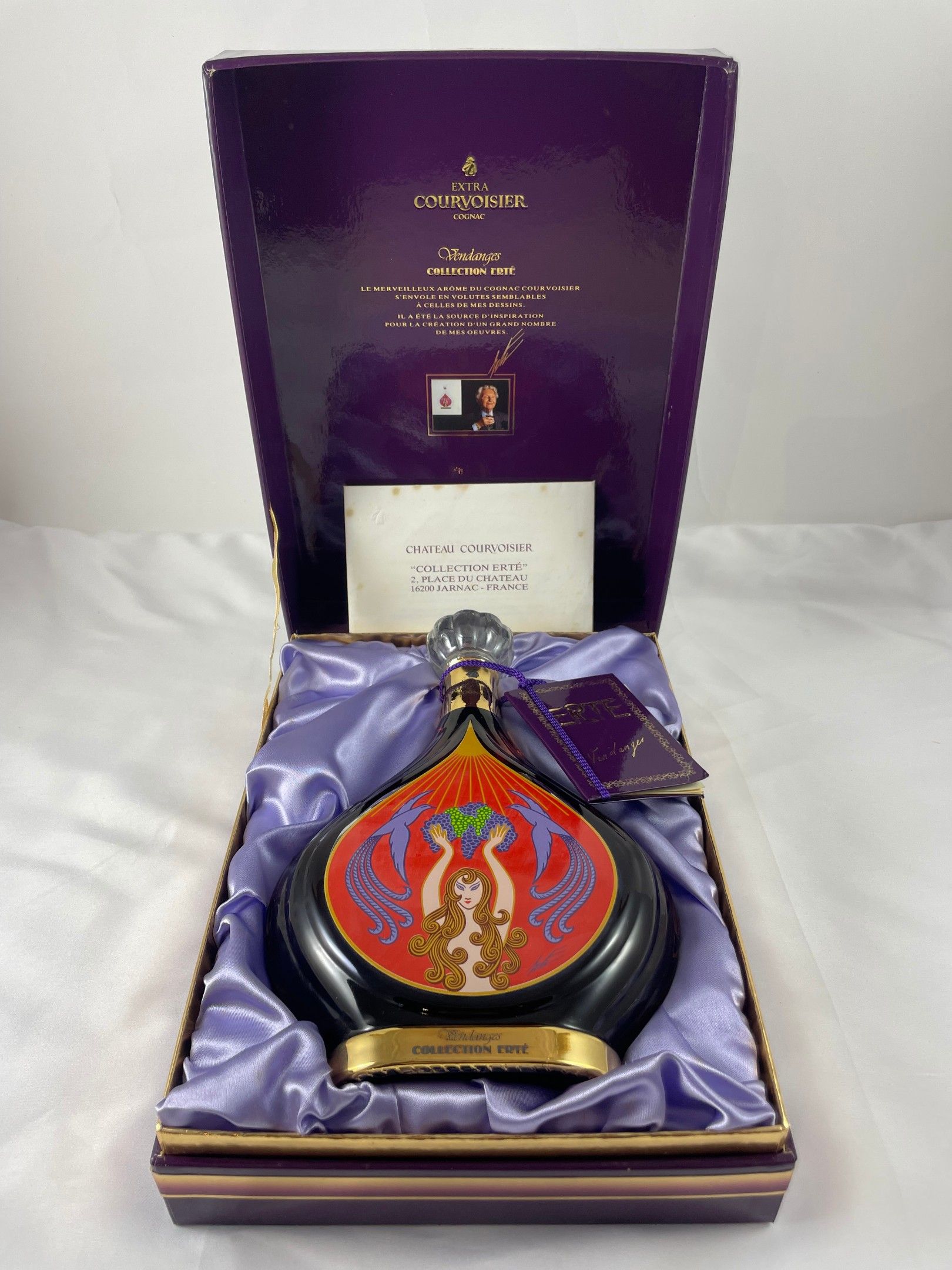 8 btls de Cognac Courvoisier - Collection ERTE - Chaque bouteille est accompagnée de son coffret d'origine, lui-même protégé par un suremboitage en plastique - 1. Vigne 2. Vendanges 3. Distillation 4. Vieillissement 5. Dégustation 6. L'Esprit du Cognac 7. La Part des Anges 8. Inédit