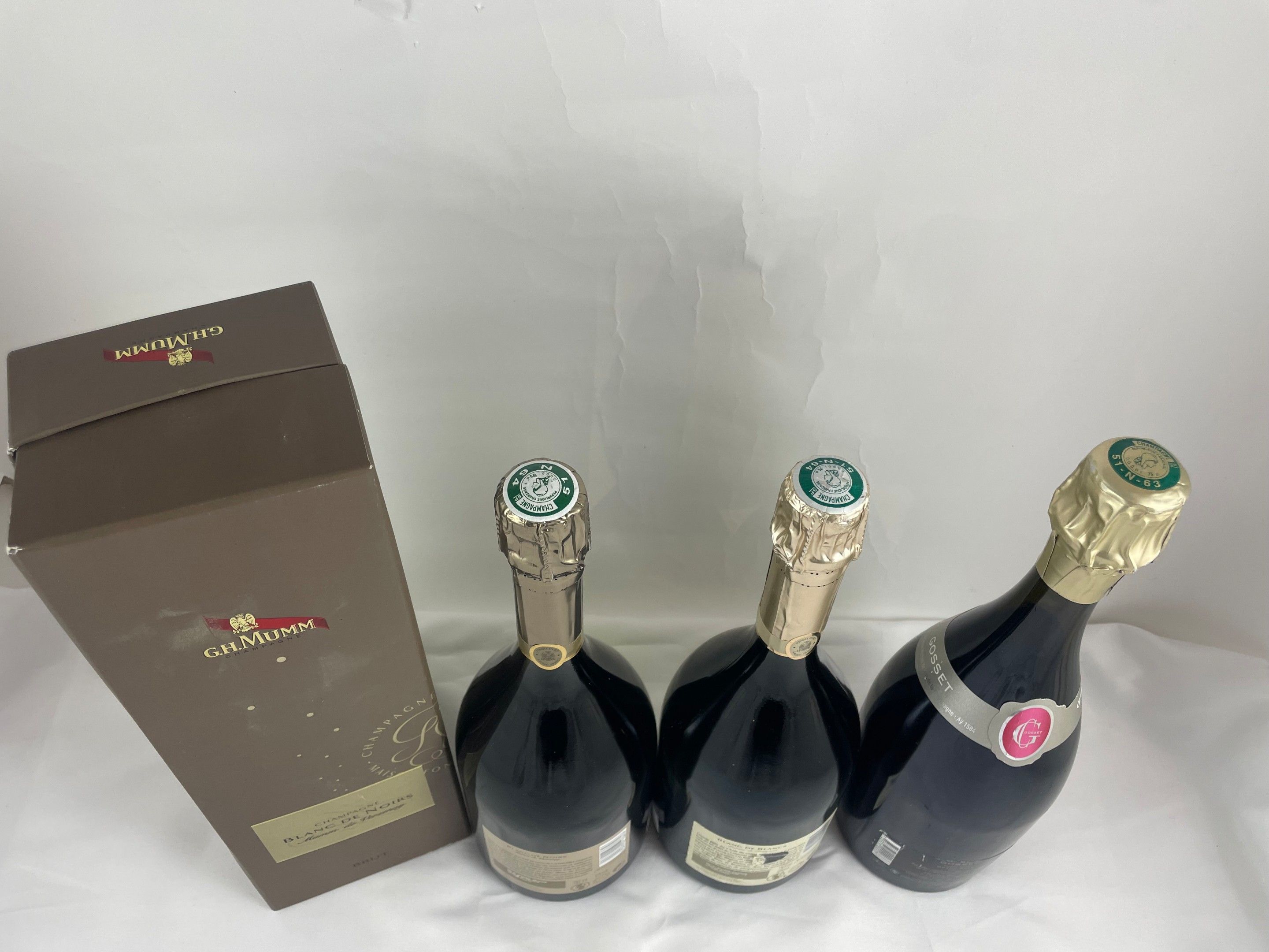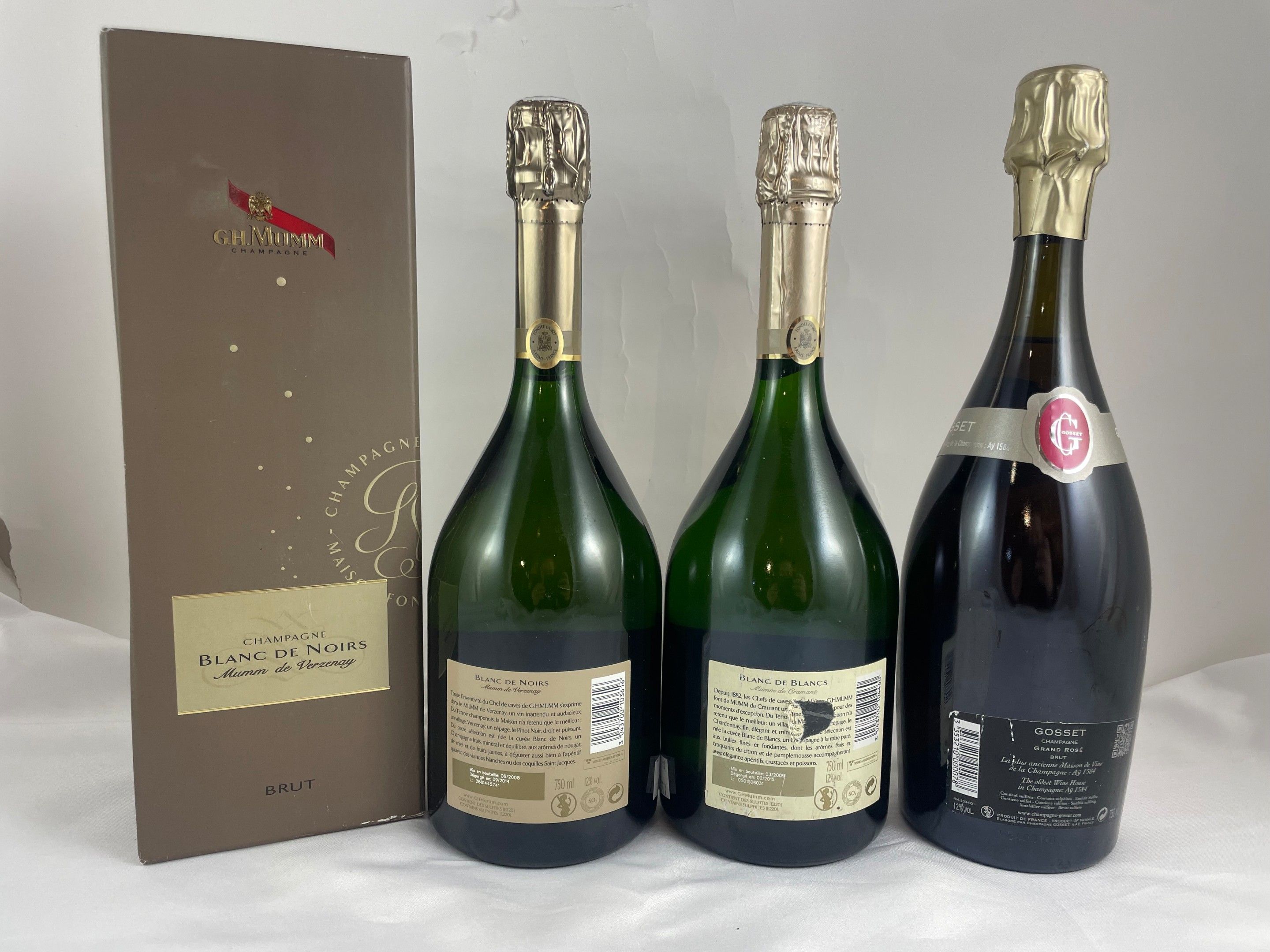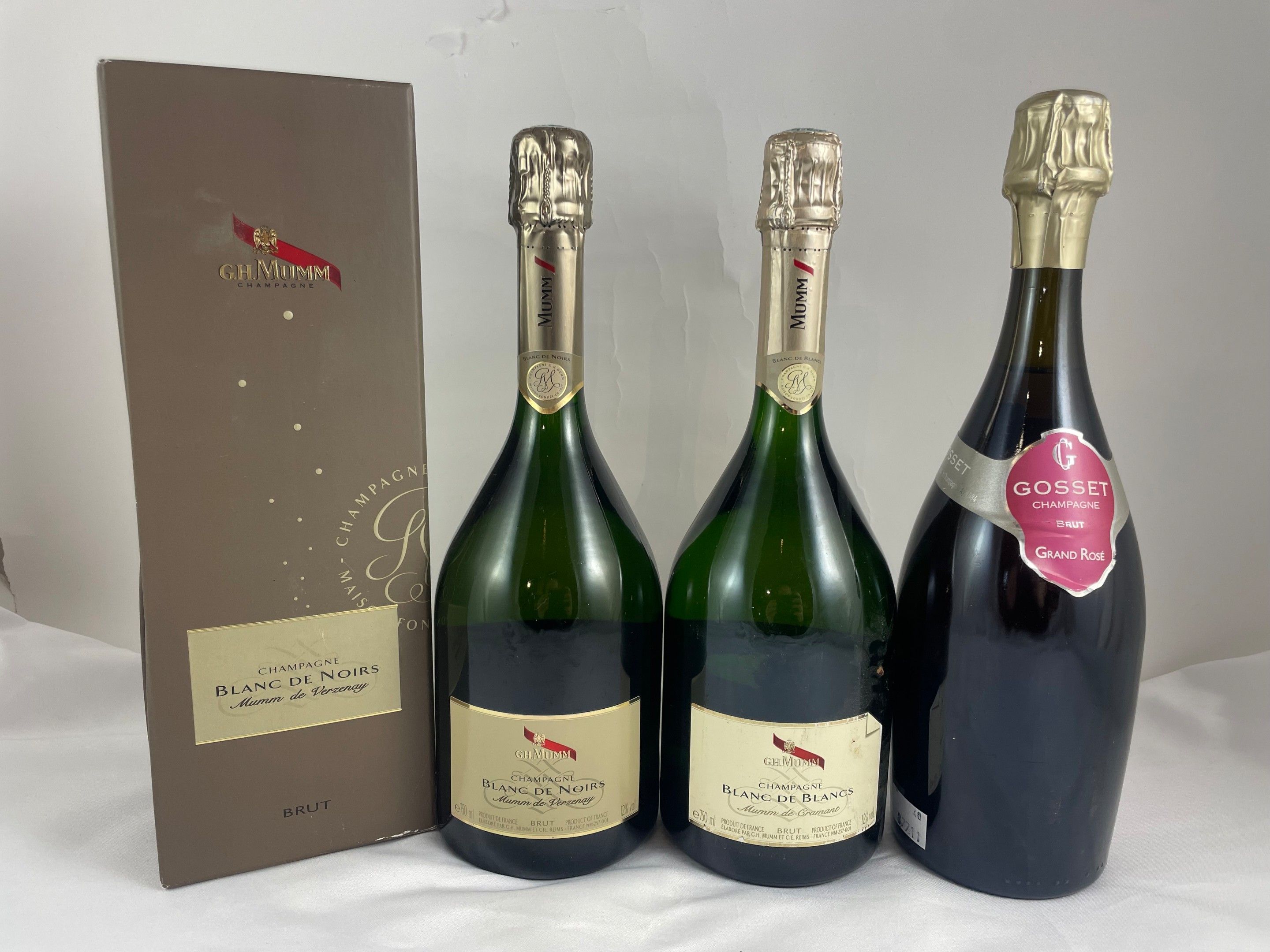 3 btls dont 1 btl Champagne NM - Blanc de Noirs - MUMM (coffret), 1 btl Champagne NM - Blanc de Blancs - MUMM, 1 btl Champagne NM - Grand Rosé - Gosset