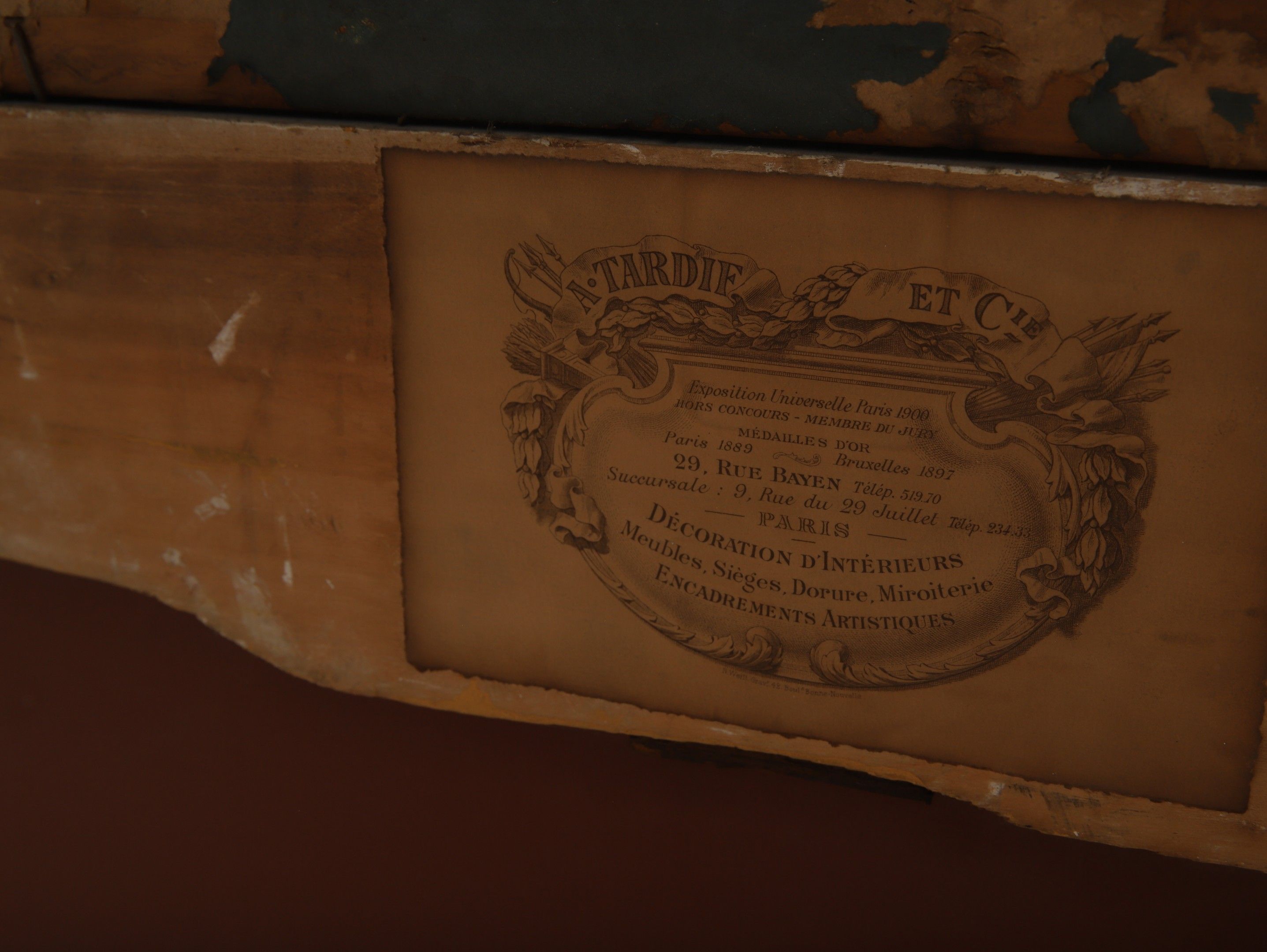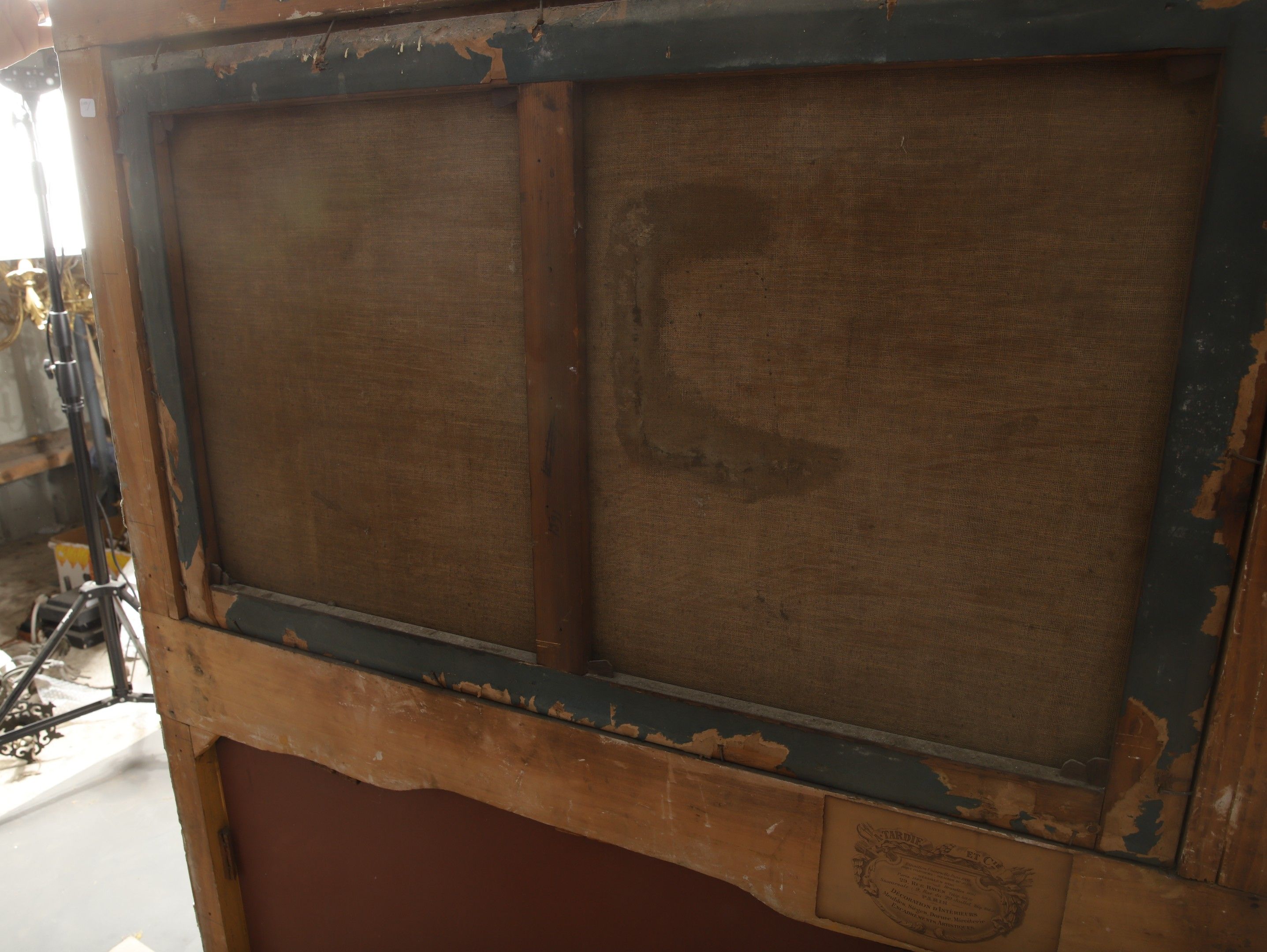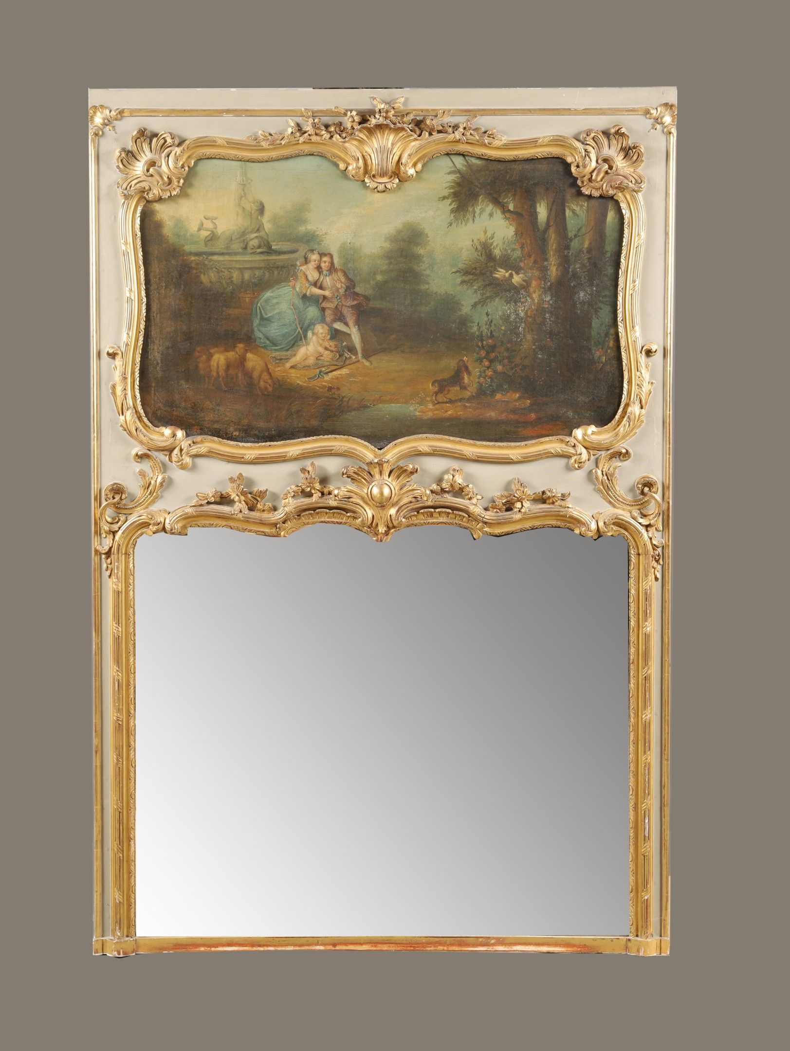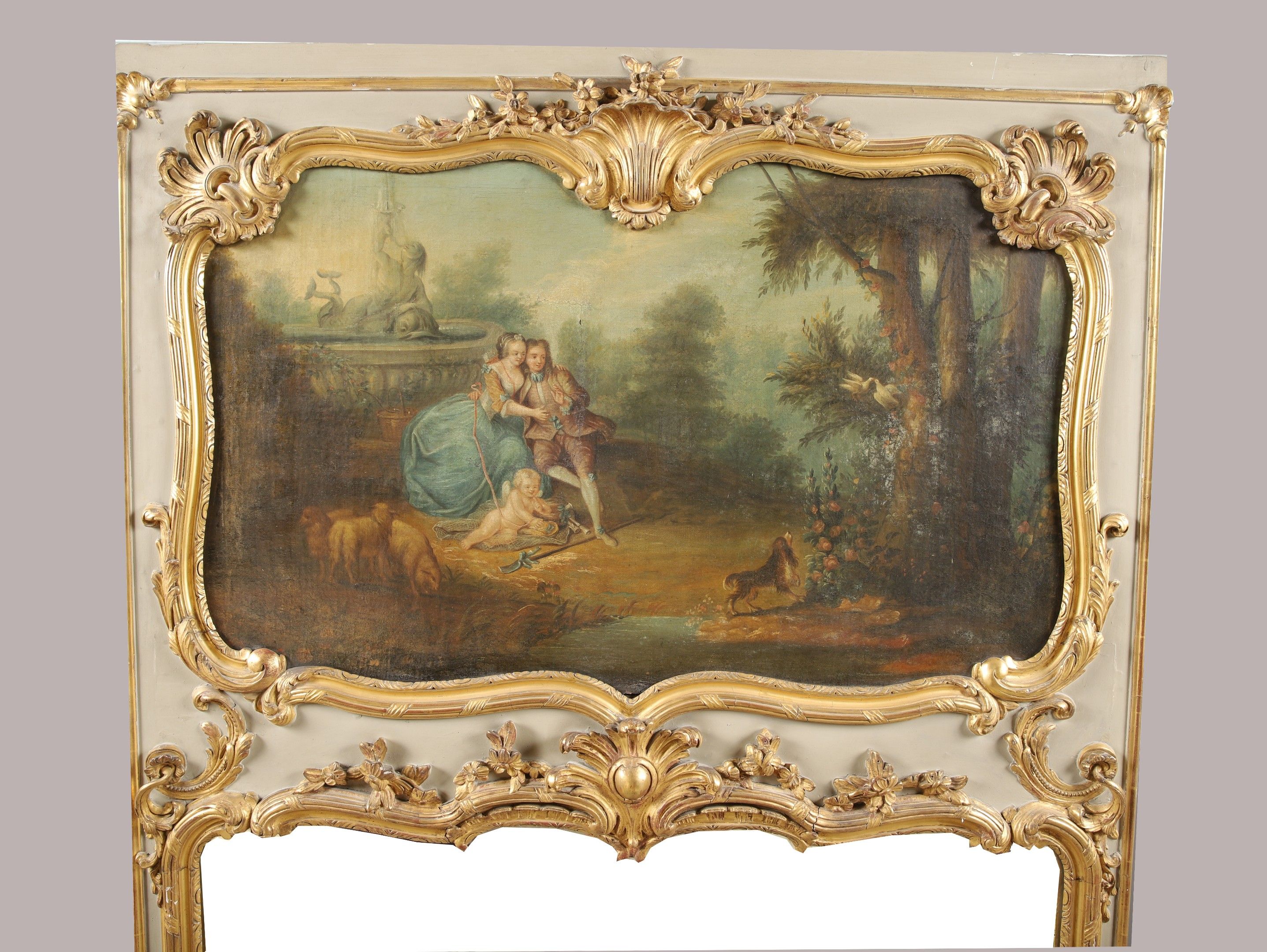 TRUMEAU en bois et stuc laqués et dorés de style Louis XV d'époque vers 1900 agrémenté d'une huile sur toile d'époque XVIIIème figurant une scène galante. Au dos, étiquette de la maison A. TARDIF & Cie. 161 x 107 cm