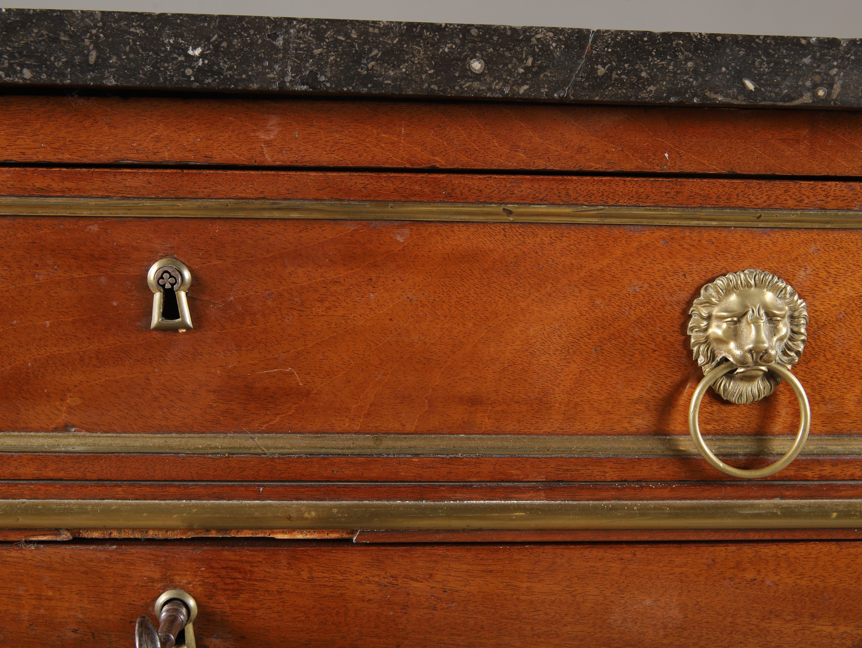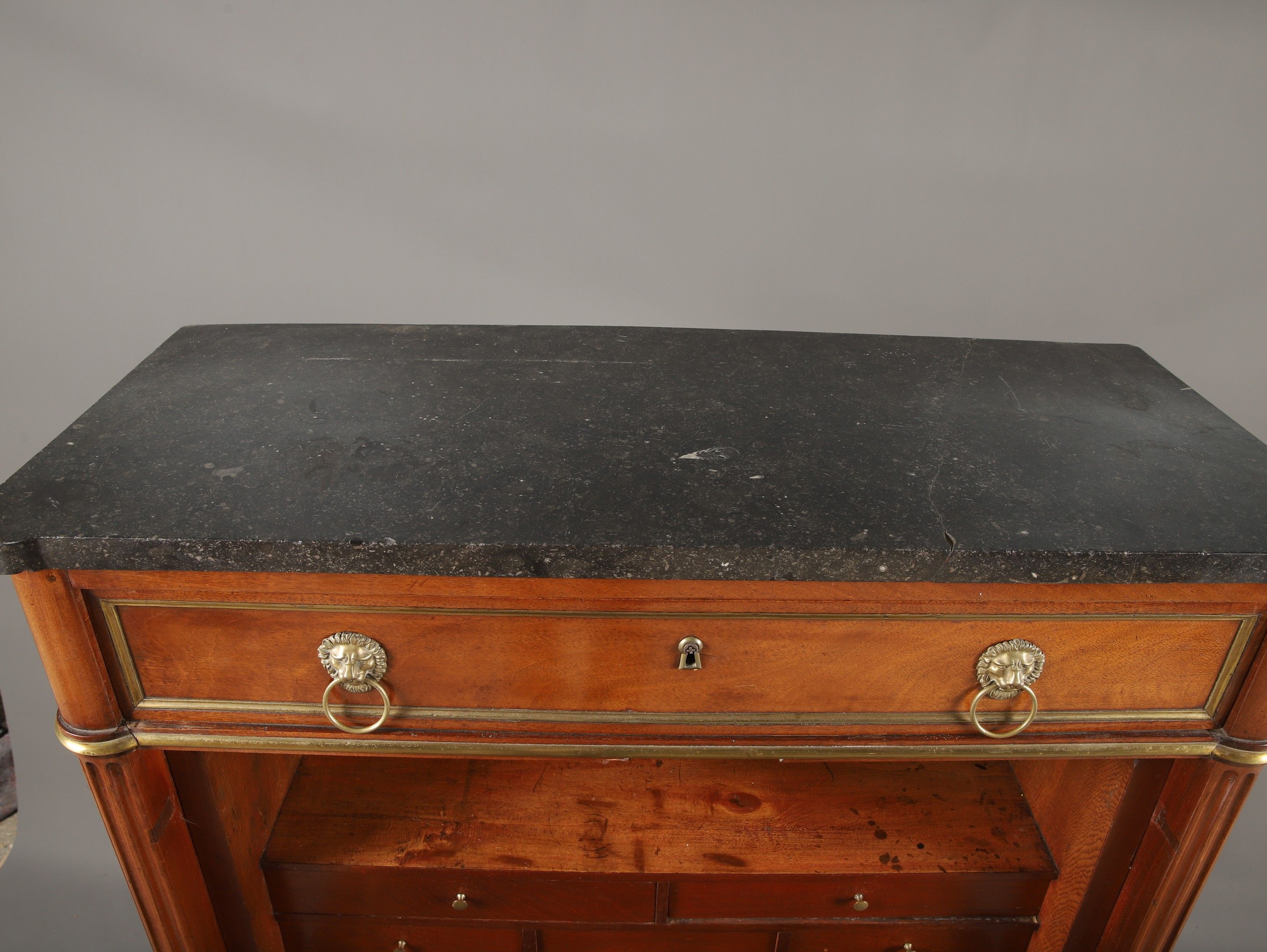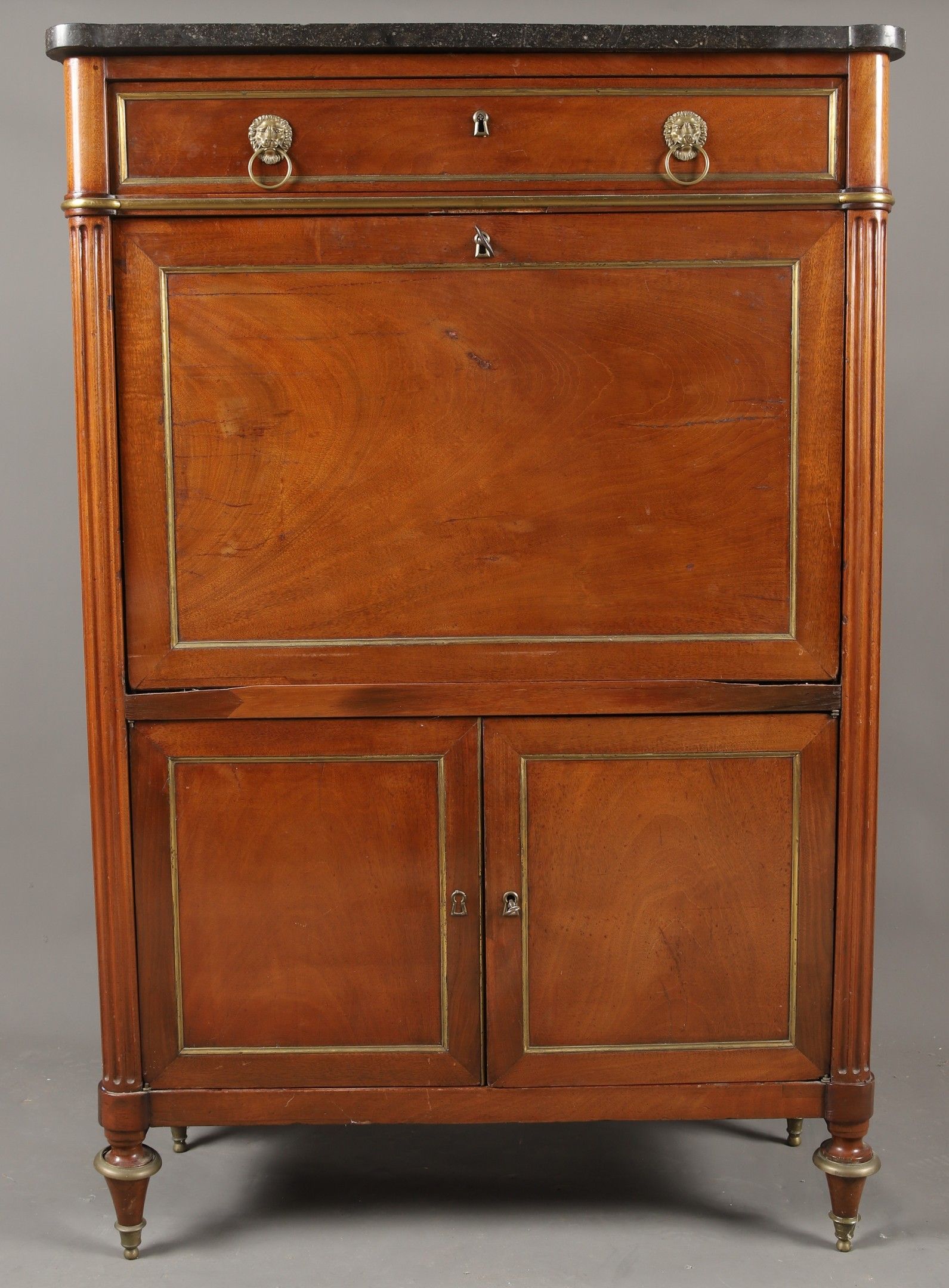 SECRETAIRE RECTANGULAIRE à montants arrondis d'époque Louis XVI en acajou et placage d'acajou orné de baguettes de laiton et cannelures. Il ouvre à un tiroir en ceinture, un abattant foncé de cuir vert orné à chaud (rapporté) découvrant un intérieur à 7 tiroirs et un casier, et à deux tiroirs en partie basse découvrant un tiroir à l'anglaise, pieds toupie, plateau de petit granit noir belge (restauré). Clé tréflée. 142 x 94 x 39 cm