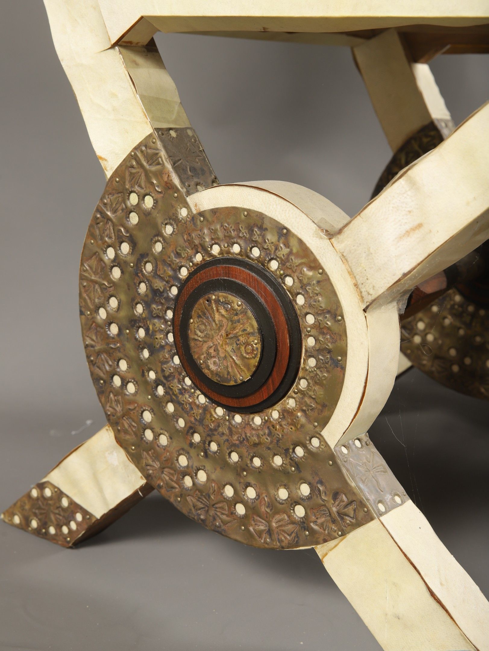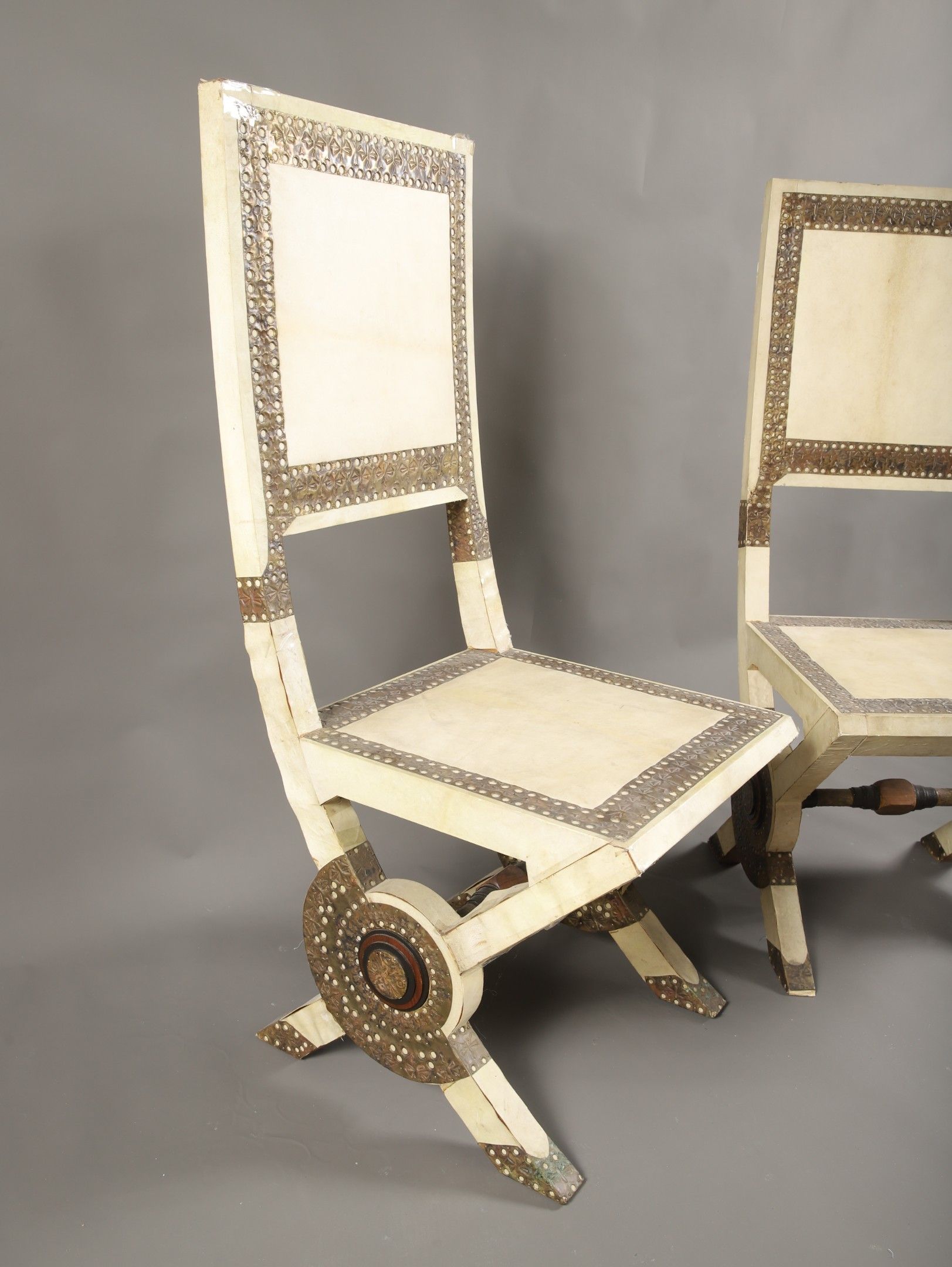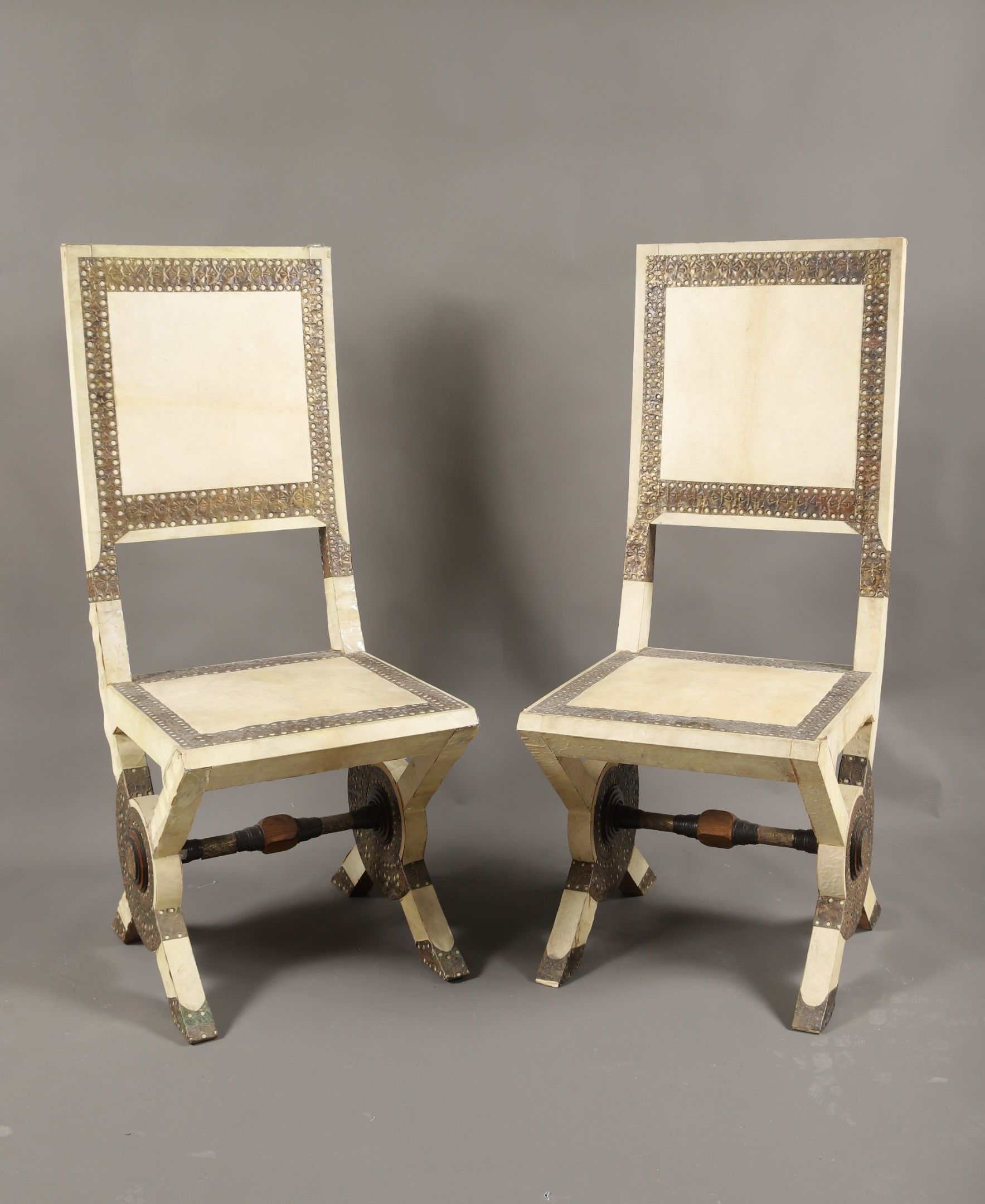 PAIRE de CHAISES dans le goût de Carlo Bugatti en bois gainé de parchemin blanc, piétement en X orné de demi-bobines à entretoise, applications de laiton à décor repercé et repoussé. 115 x 45 x 48,5 cm