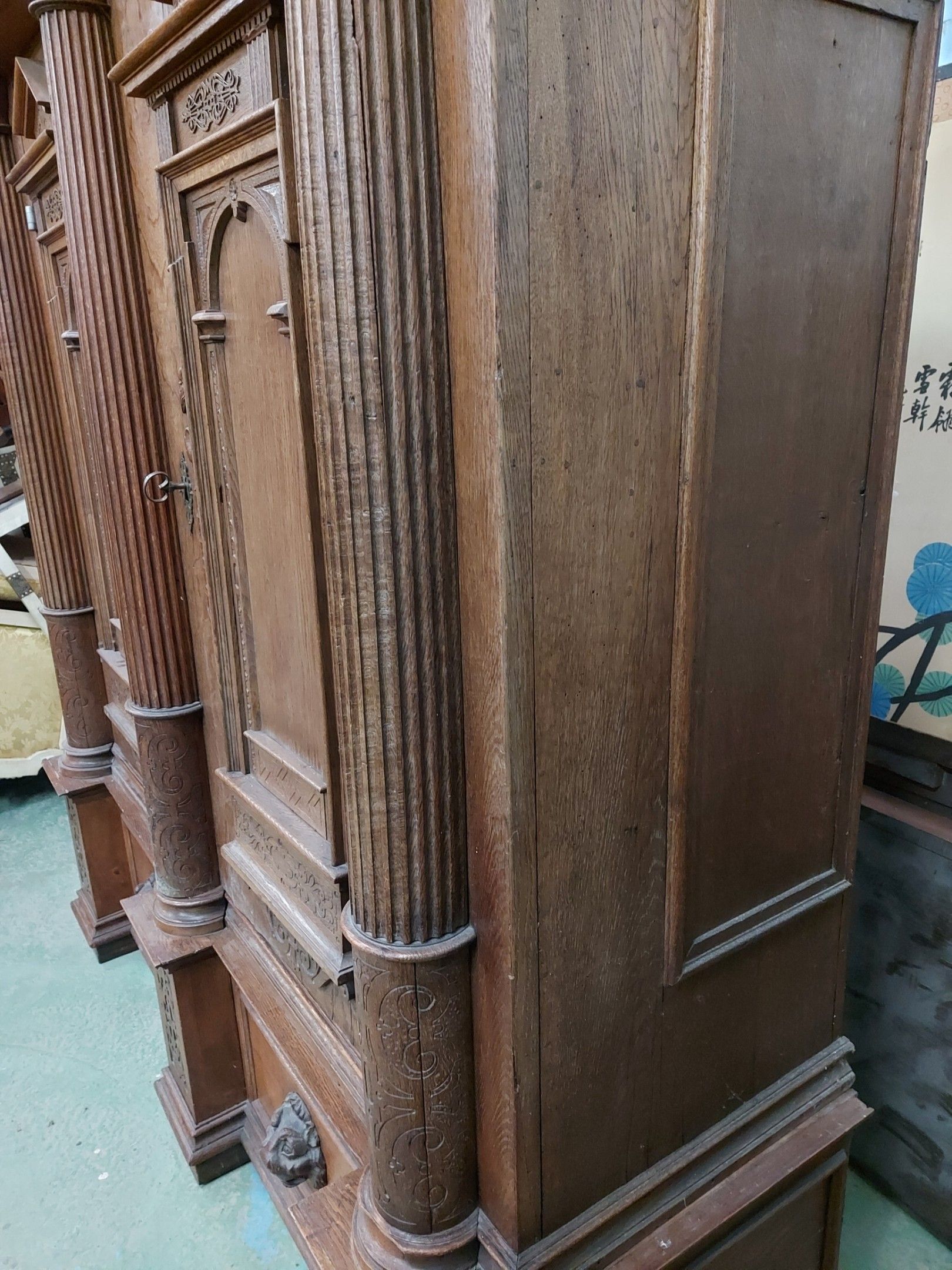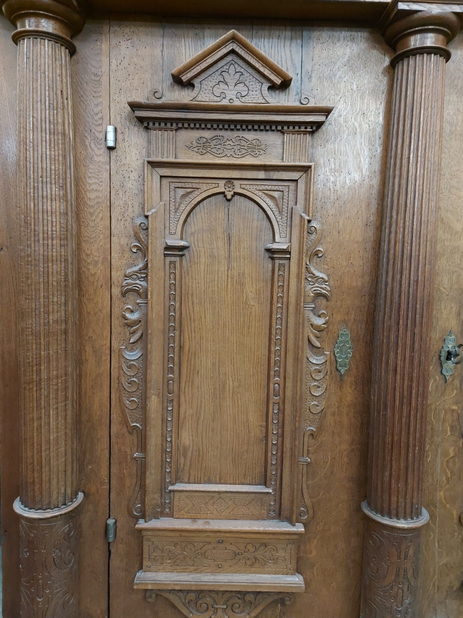 ARMOIRE FLAMANDE en chêne d'époque XVII-XVIIIème en chêne mouluré et sculpté à décor architecturé de demi-colonnes cannelées et de niches à frontons agrémenté de rinceaux en méplart de mufles de lion. Elle ouvre à deux vantaux à faux dormant, serrure et pentures en fer forgé gravées de têtes et rinceaux. 225 x 200 x 70 cm