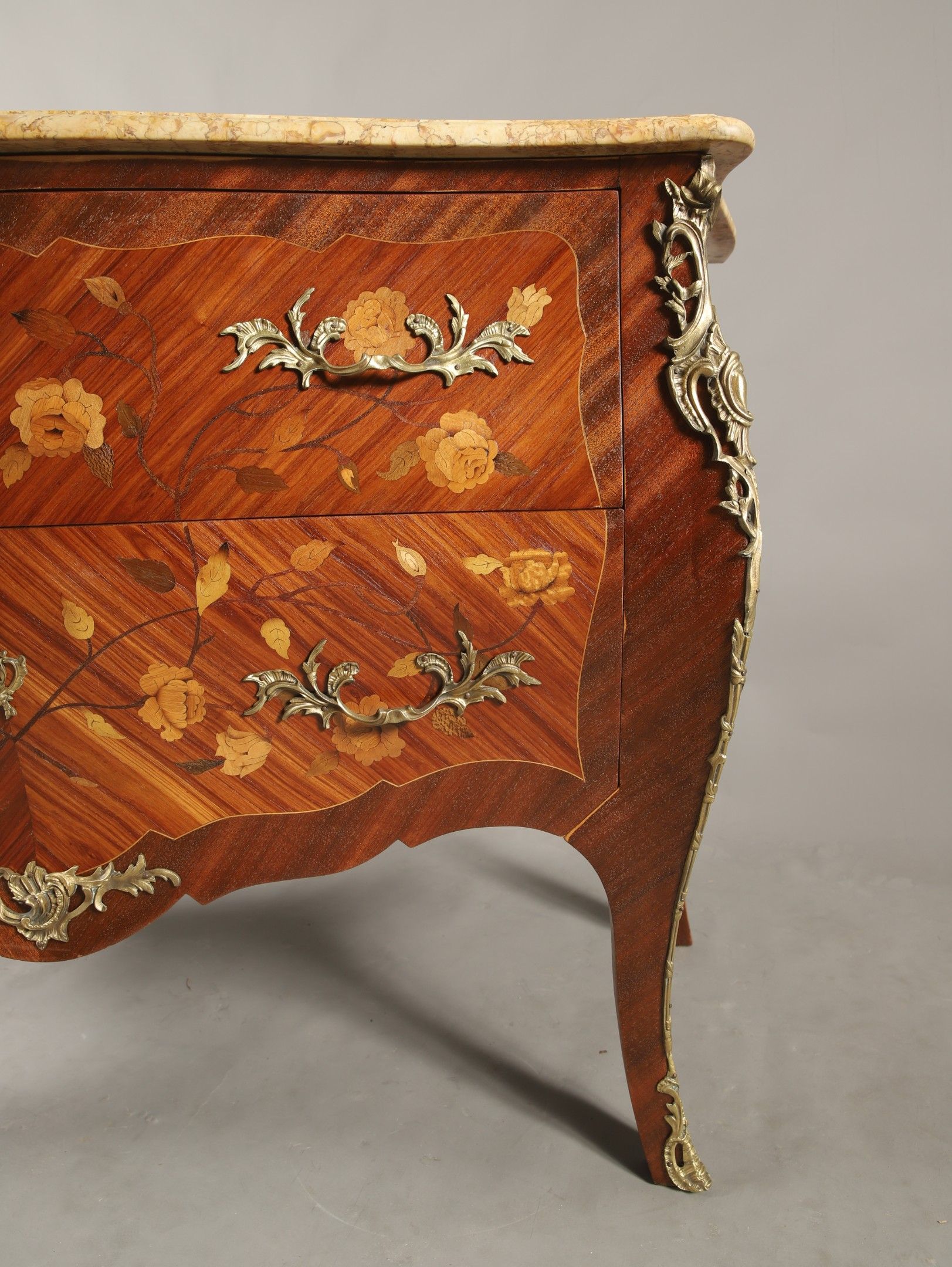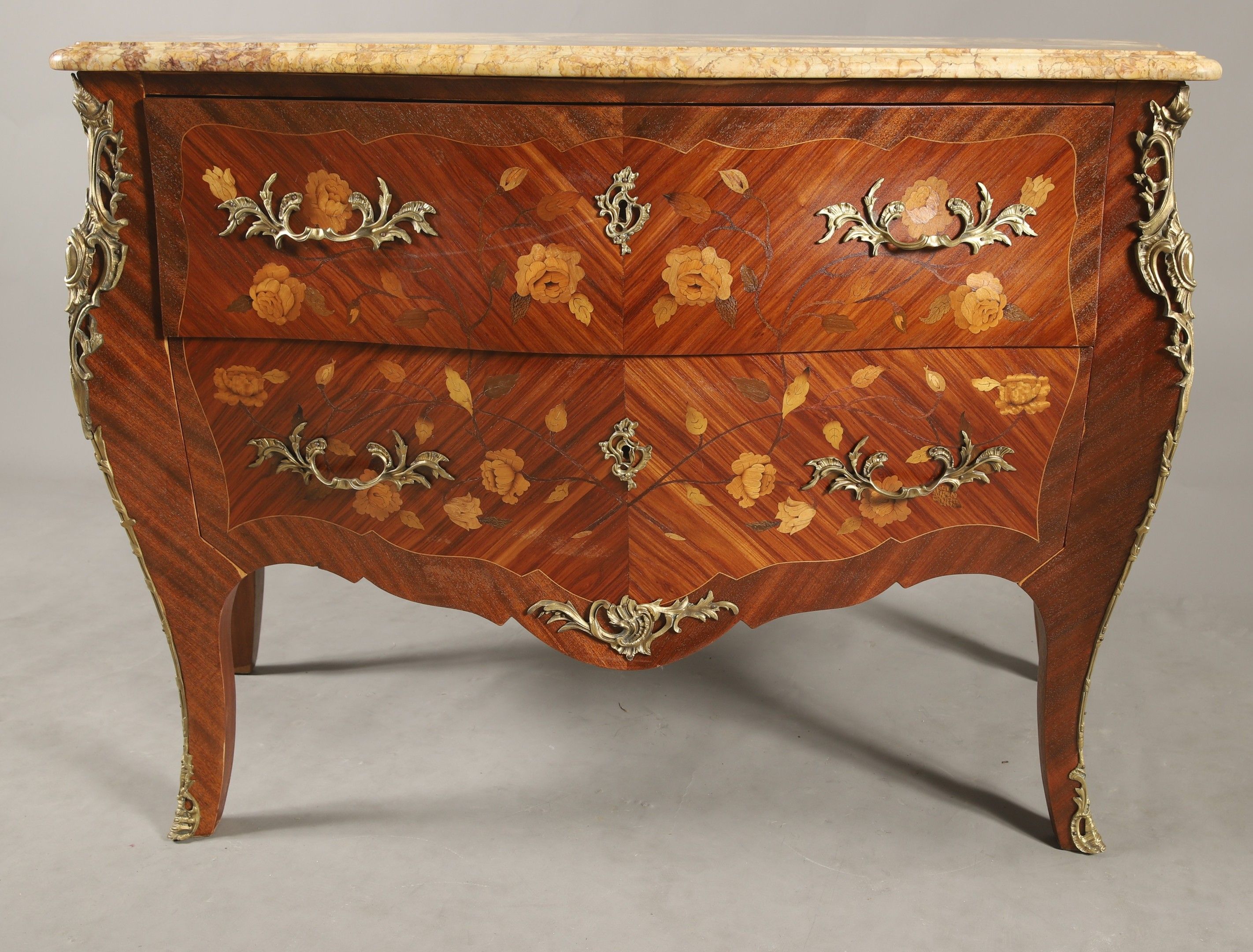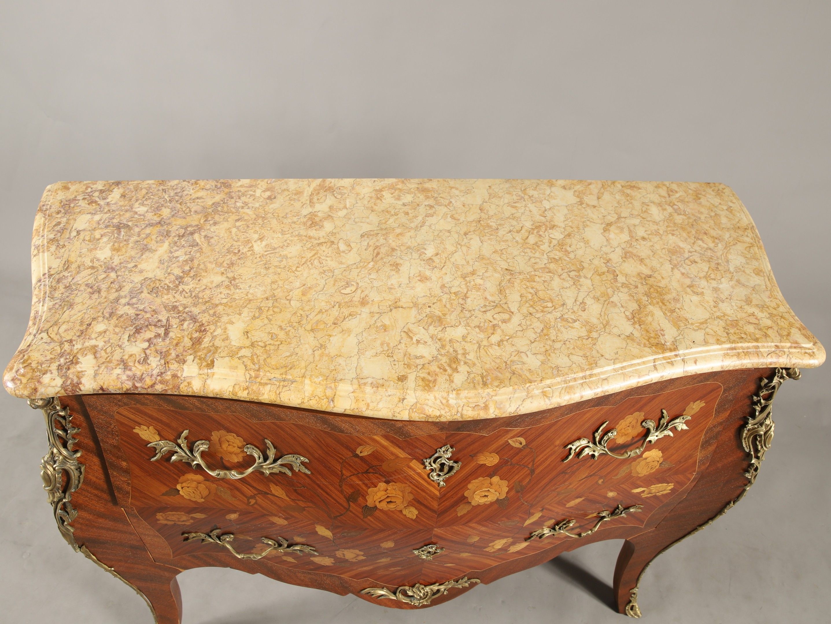 COMMODE SAUTEUSE ouvrant à deux tiroirs sans traverse de style Louis XV en frisage de bois de rose dans des encadrements de bois de violette et marqueterie de fleurs en houx, érable et bois teinté, plateau de marbre jaune brocatelle du Jura, ornementation de bronzes rocailles. 86 x 123 x 52 cm