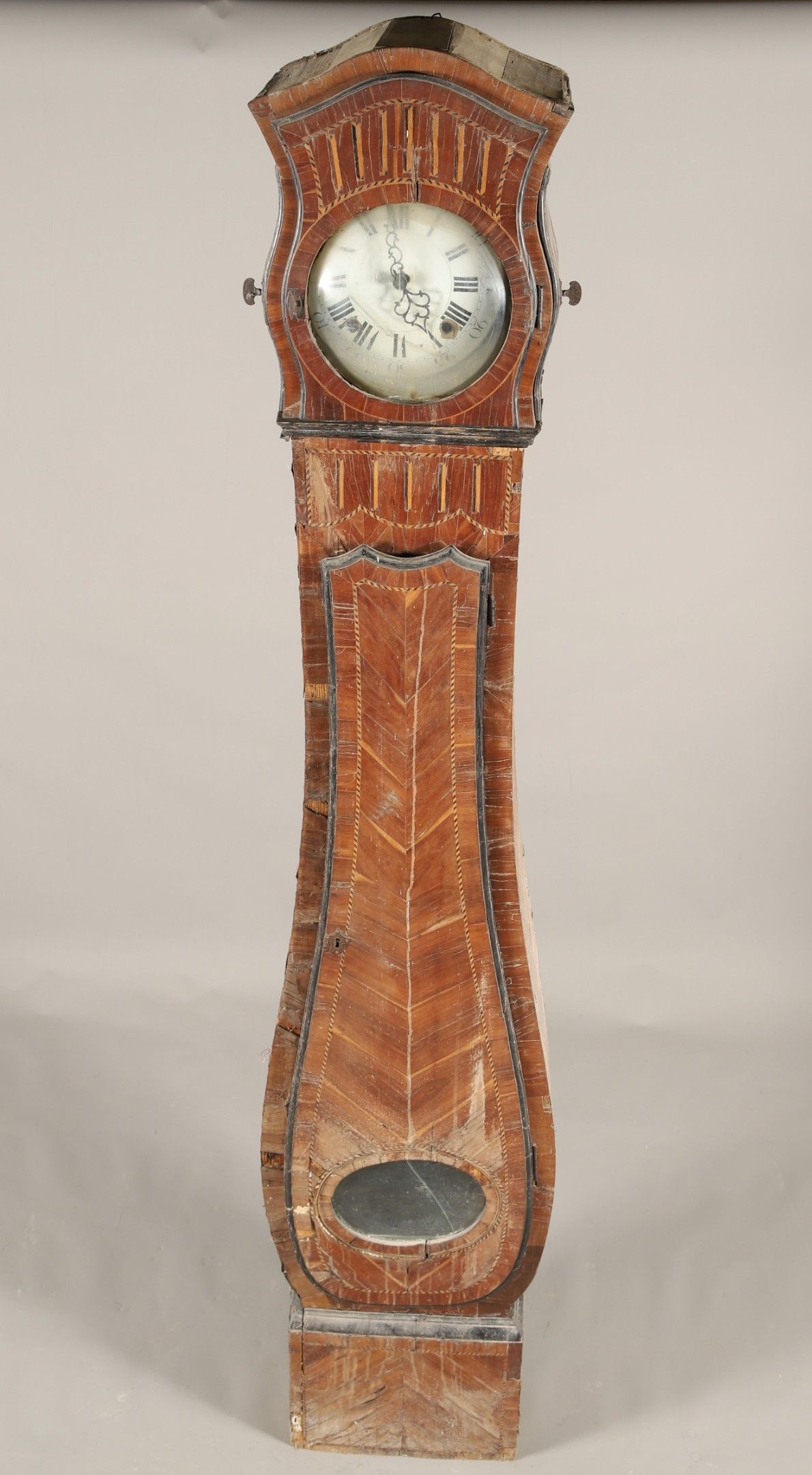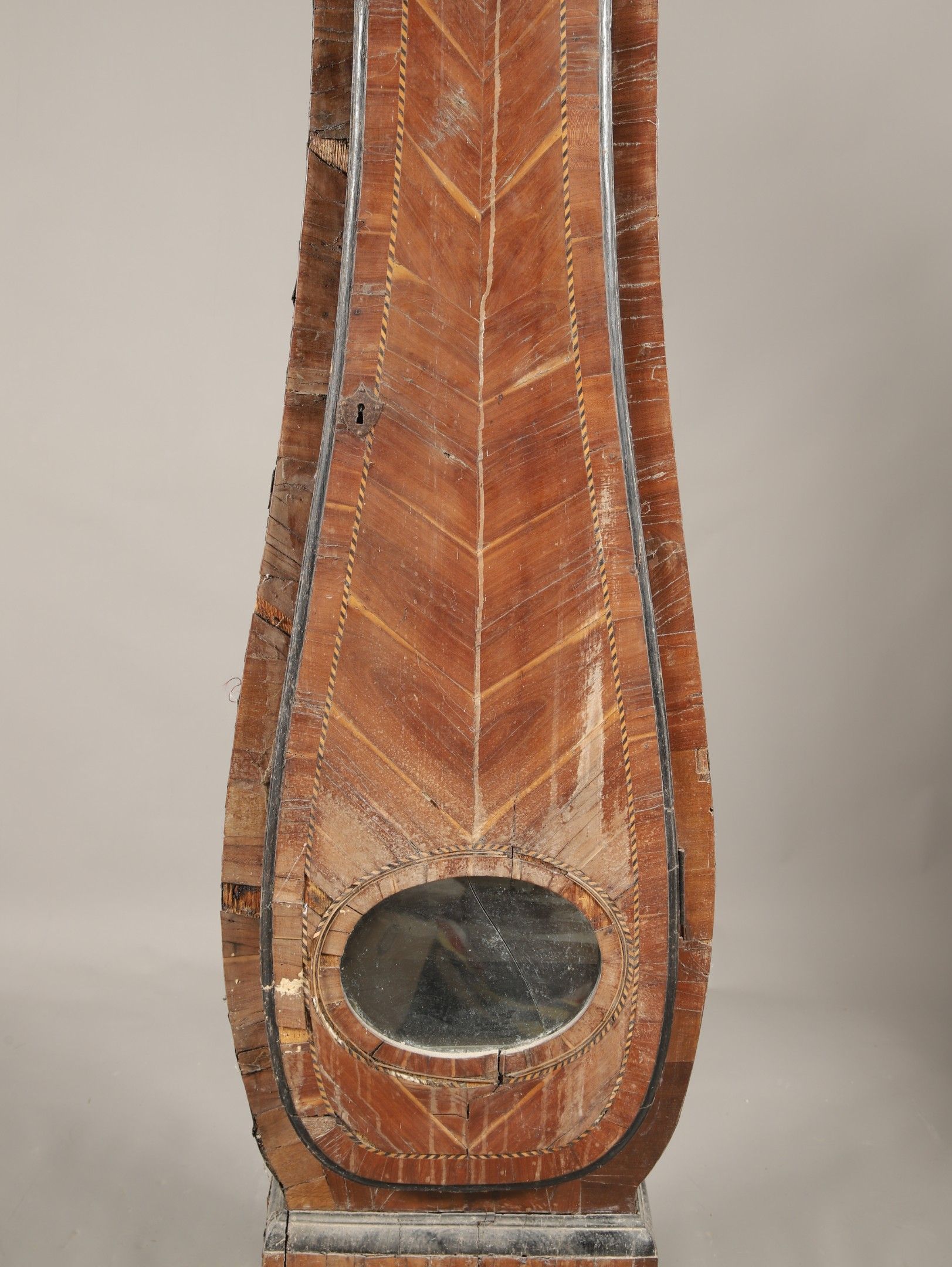 GRANDE HORLOGE de PARQUET à tête et corps violonnés en frisage de prunier et marqueterie de cannelures simulées et filets de bâtons rompus en érable et bois noirci d'époque Louis XVI. Travail de l'Est. H: 228 cm (marqueterie à reprendre, base découpée en partie arrière)