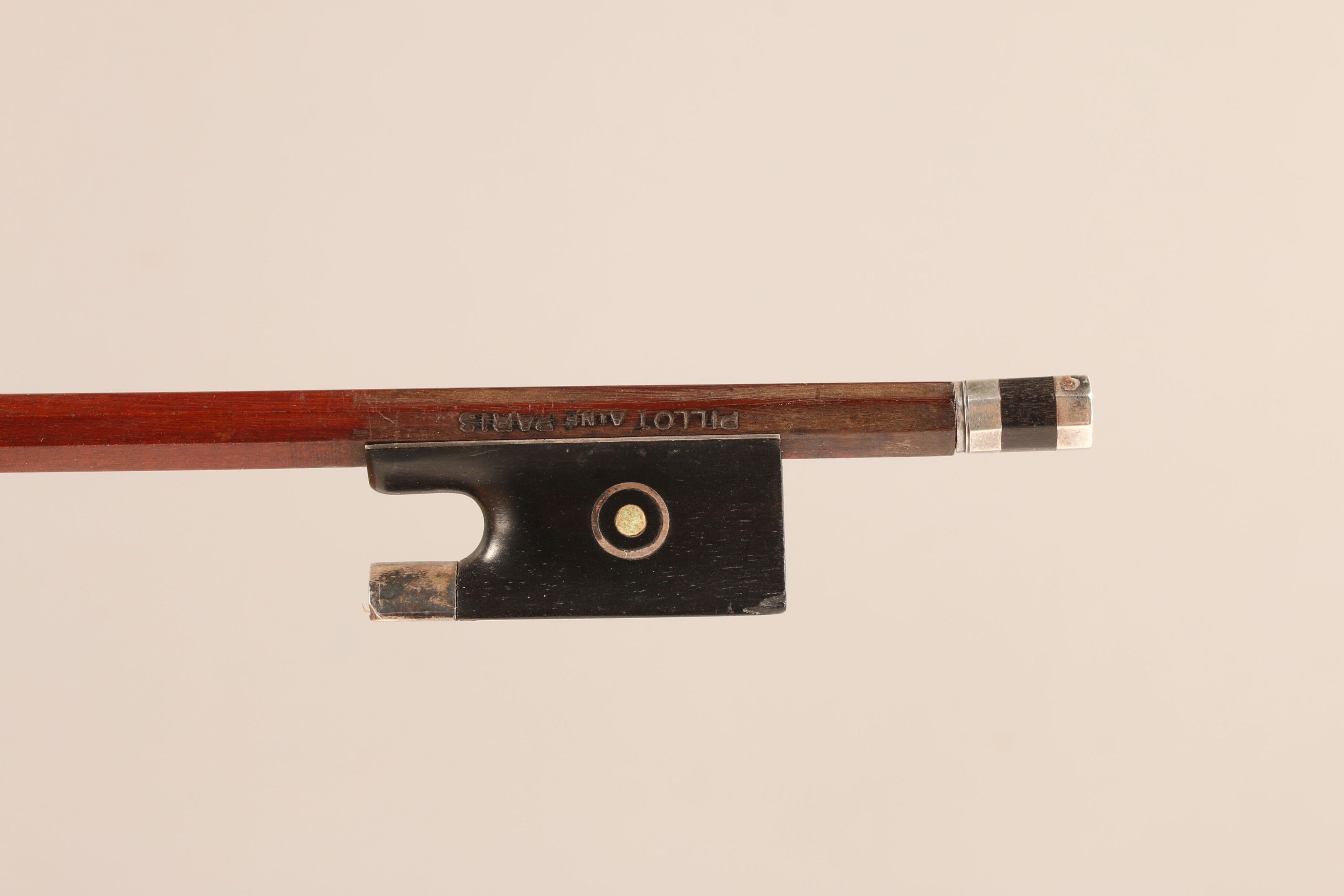 Archet de violon JÉRÔME THIBOUVILLE-LAMY , signé "Pillot Ainé Paris", monté argent. Petit éclat à la hausse. 57g sans mèche ni garniture