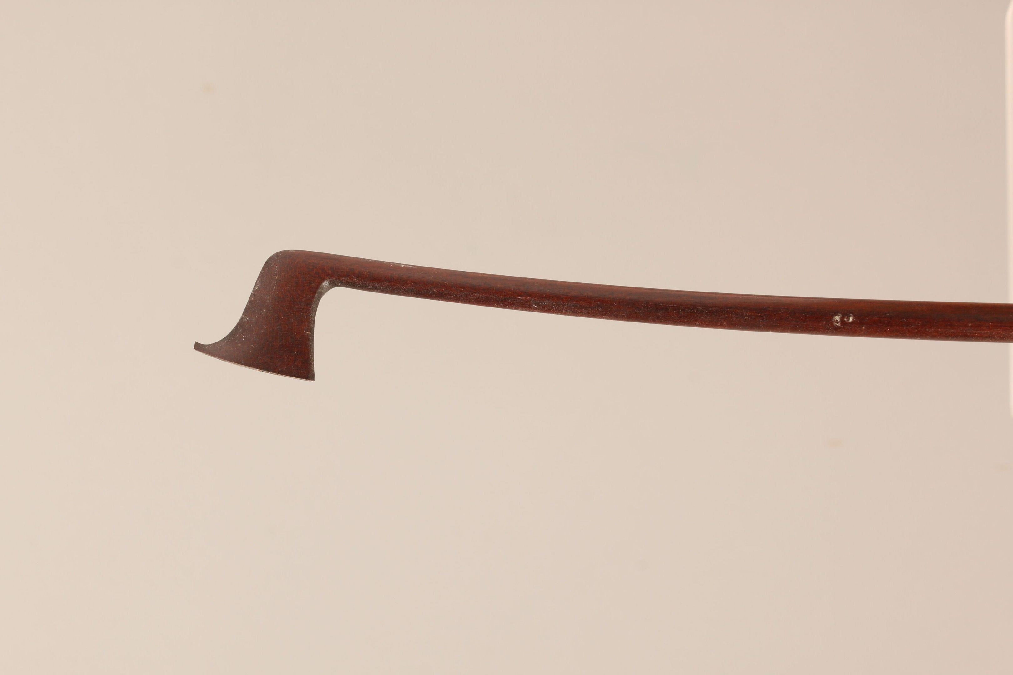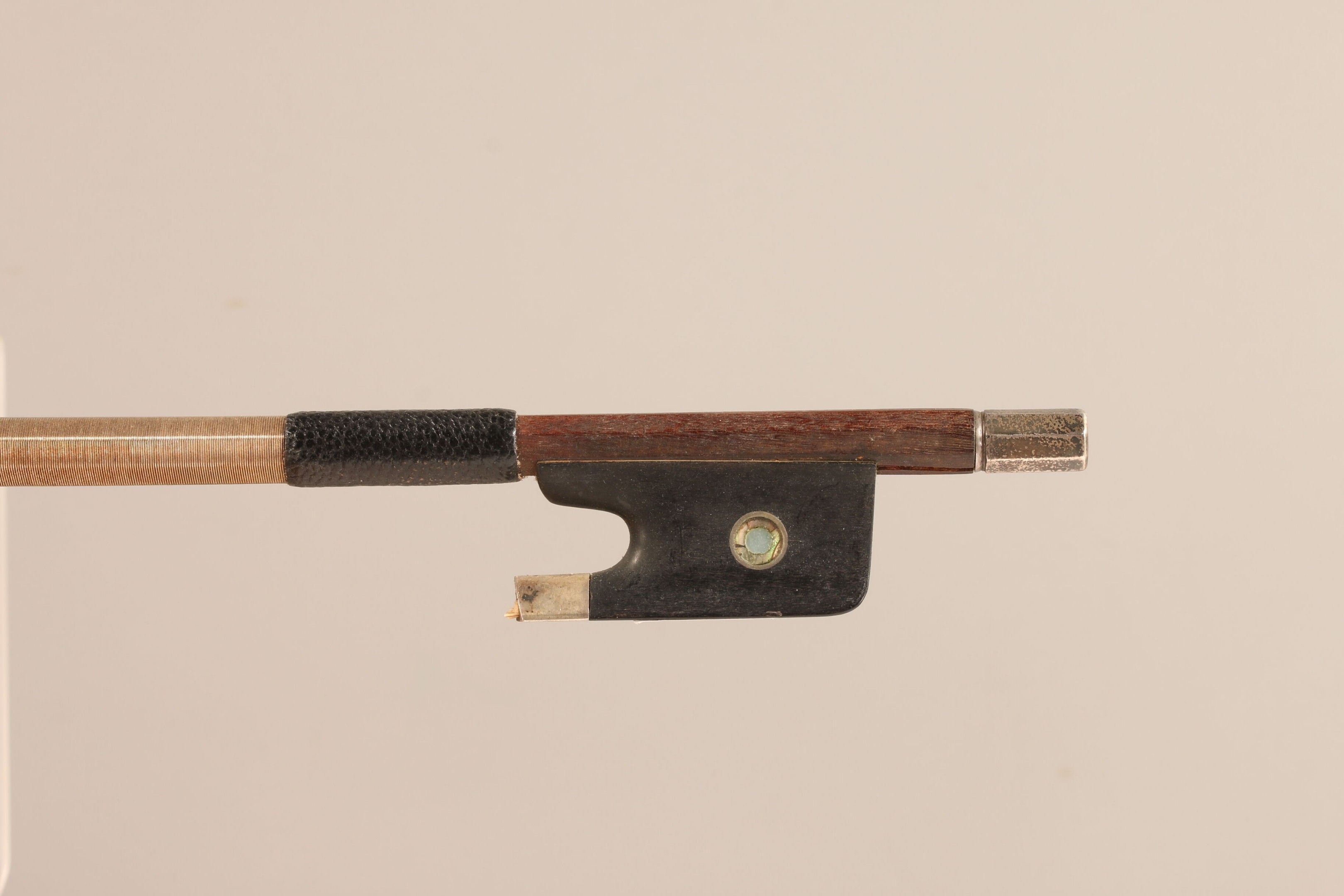 Baguette d'archet de violon de MORIZOT Frères, hausse et bouton de l'école allemande, monté argent à l'exclusion du passant monté maillechort. Fente arrière baguette, bouton bloqué. 61g5.