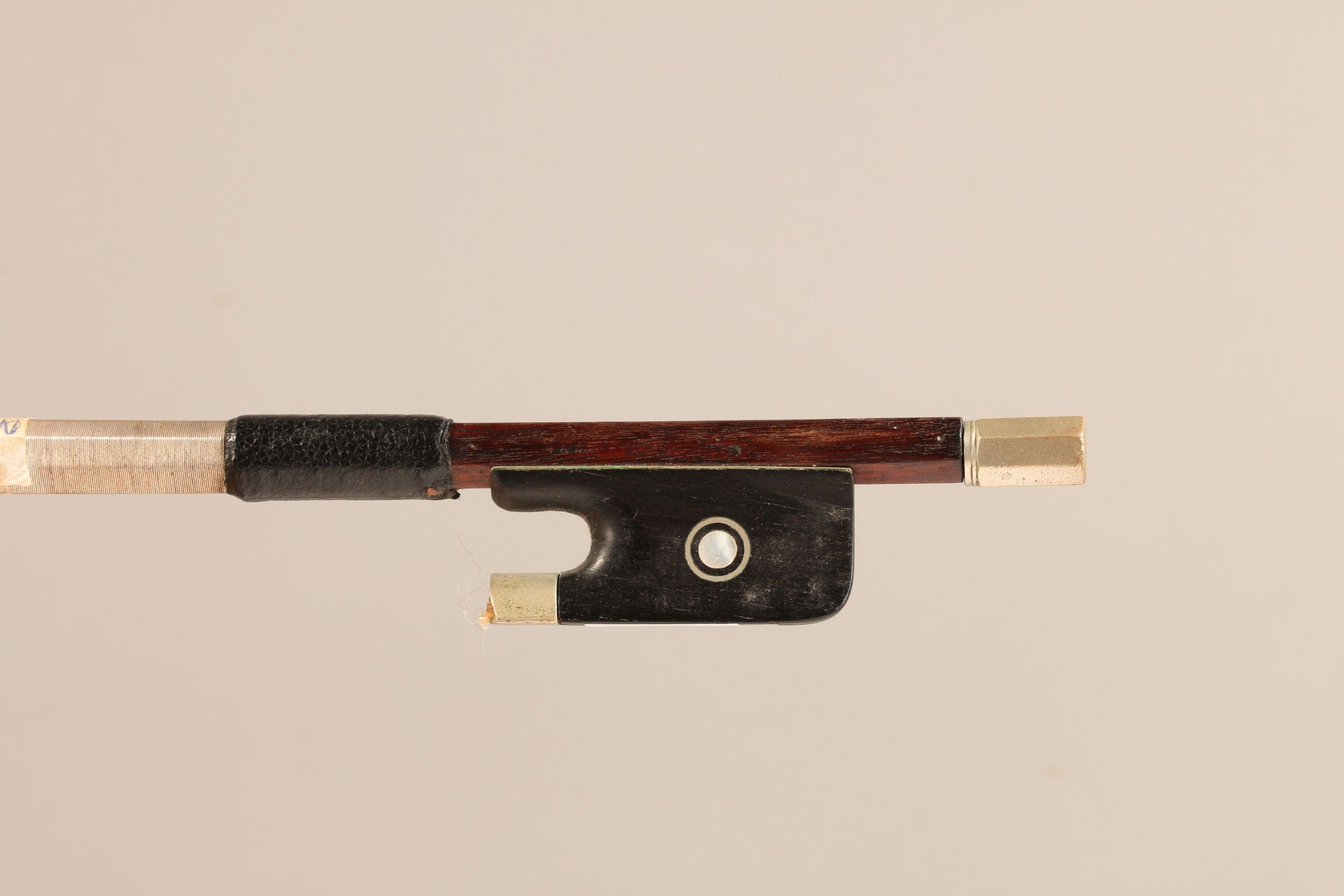 Archet d'alto Français, fait à Mirecourt, XXème, signé "Gérôme Devoivre", monté maillechort. 57g9, sans mèche. Petit éclat à la hausse. (EBBD-BNJ-4102)