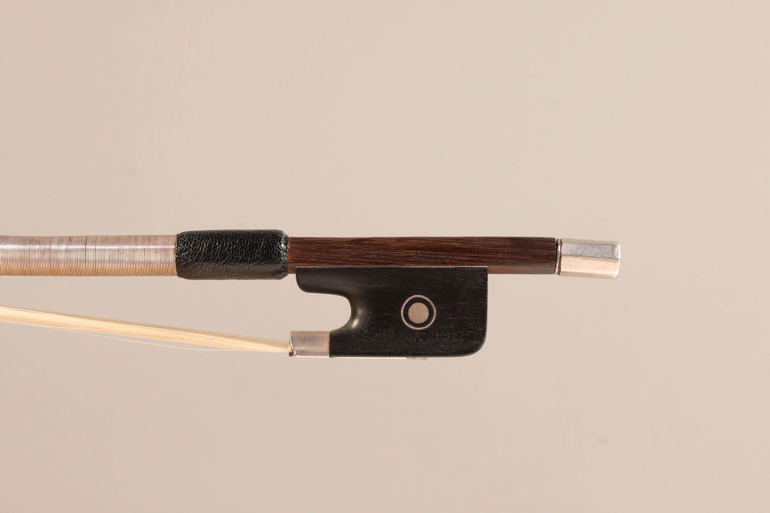 Archet de violon en bois satiné de Auguste HUSSON, dit "Husson-Mariet", fait vers 1915-1920, signé "Husson-Mariet", monté argent. 59g8. Bon état. (DMCN-CKT-5906)