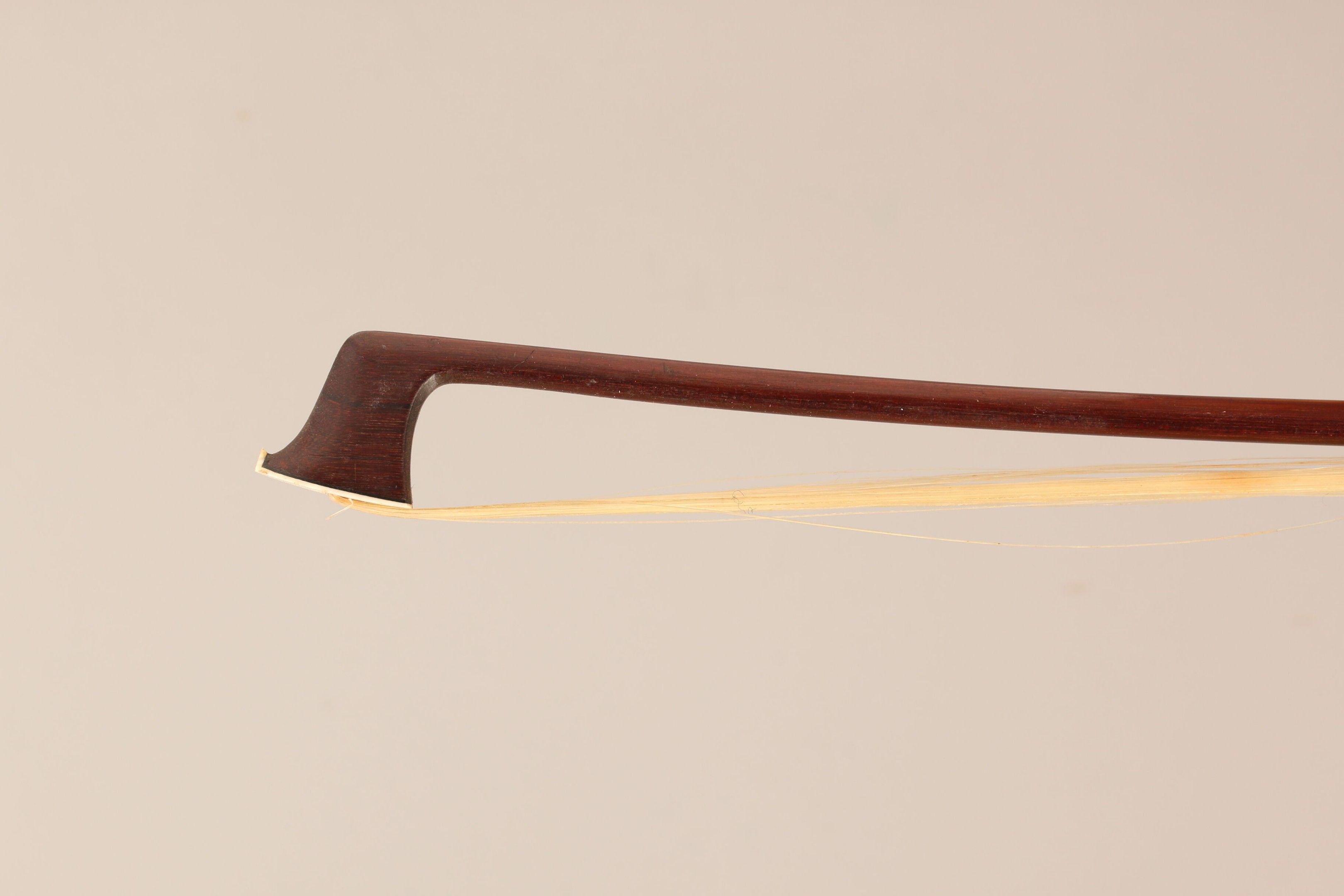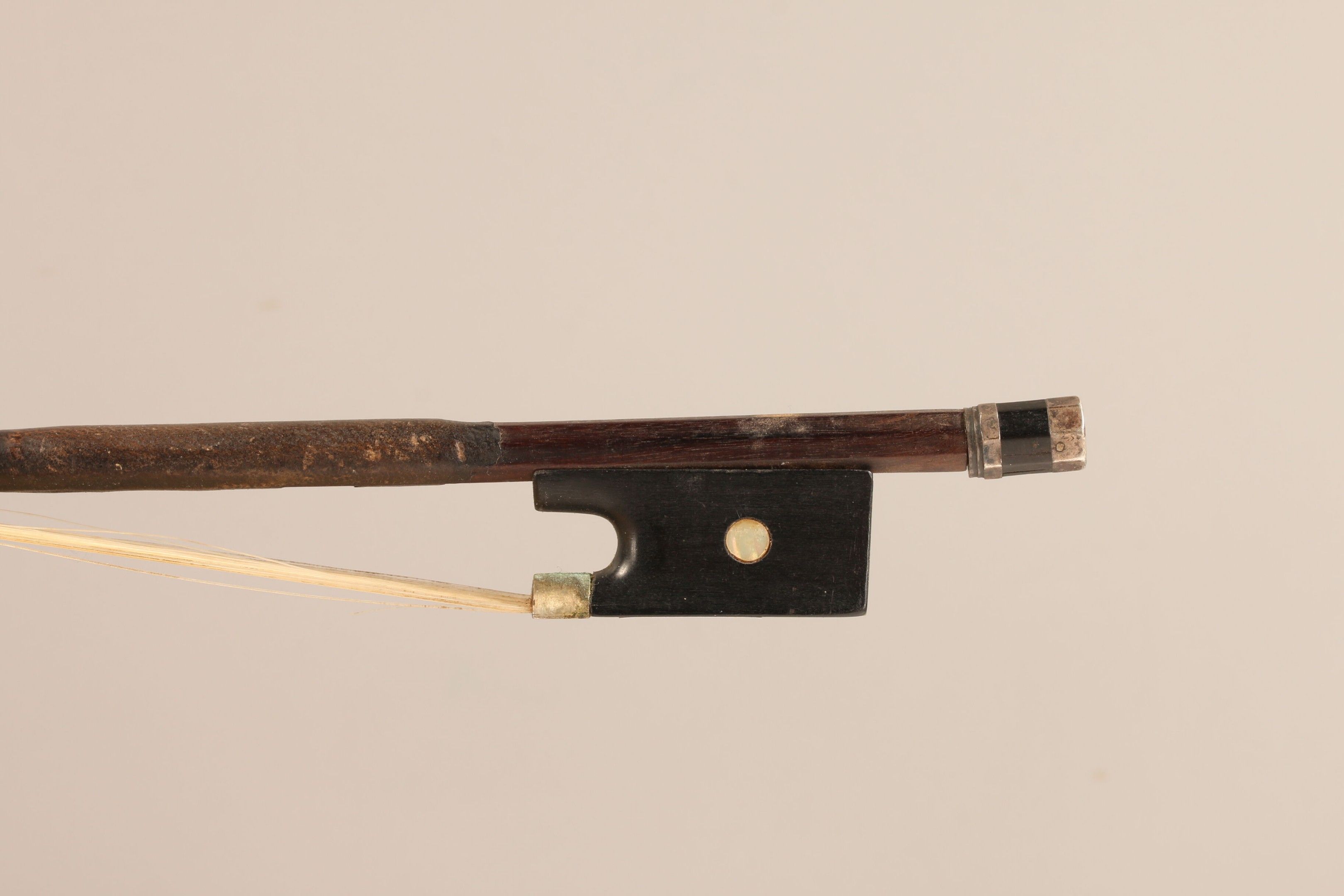 Archet de violon 1/2 de l'école de MAIRE, bouton de MAIRE en argent, monté maillechort. Traces d'usages. 48g5, long. 64,3cm