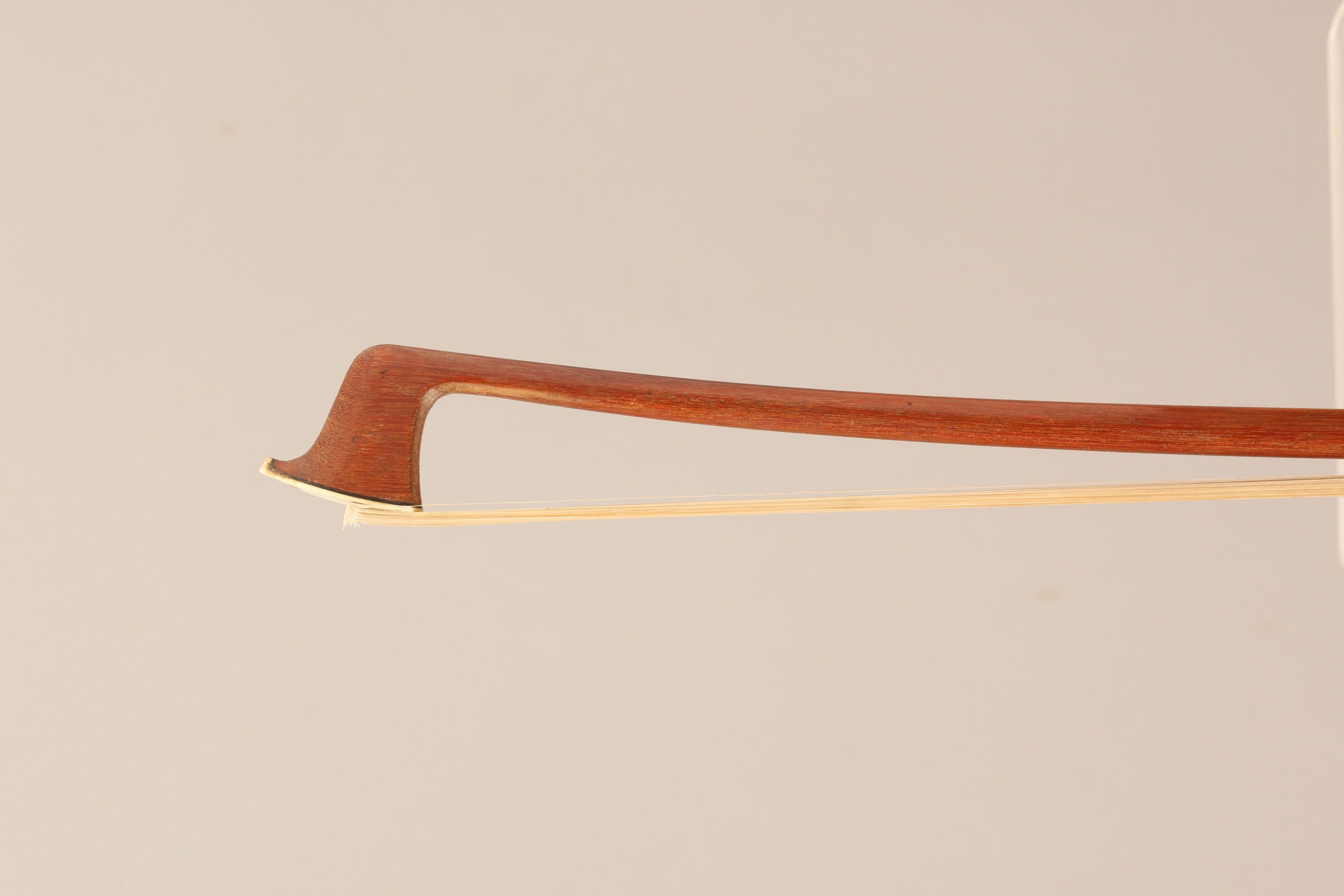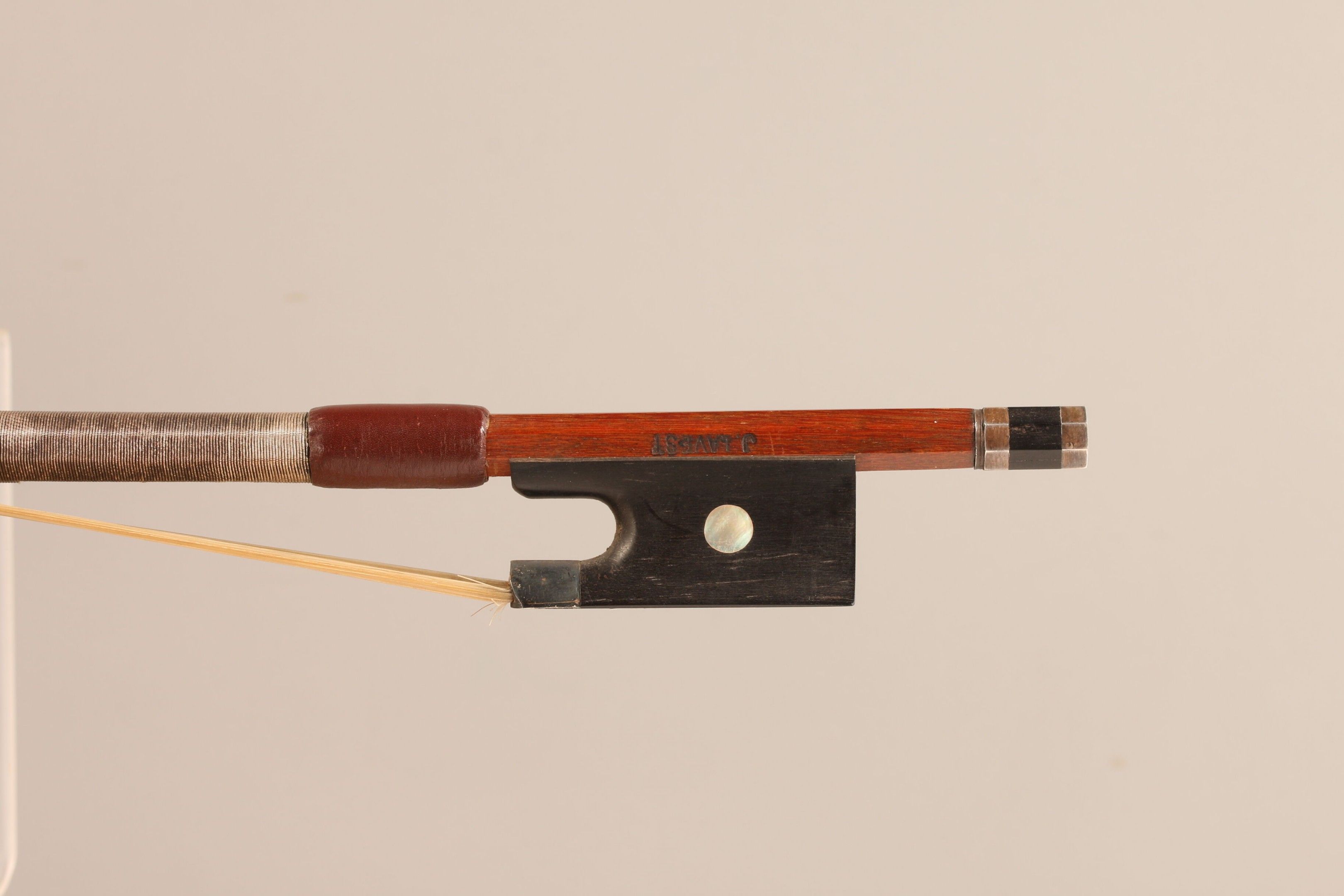 Archet de violon de LABERTE, signé "J. Lavest", bouton maillechort et passant argent. 53g4. Petite gerce milieu baguette.
