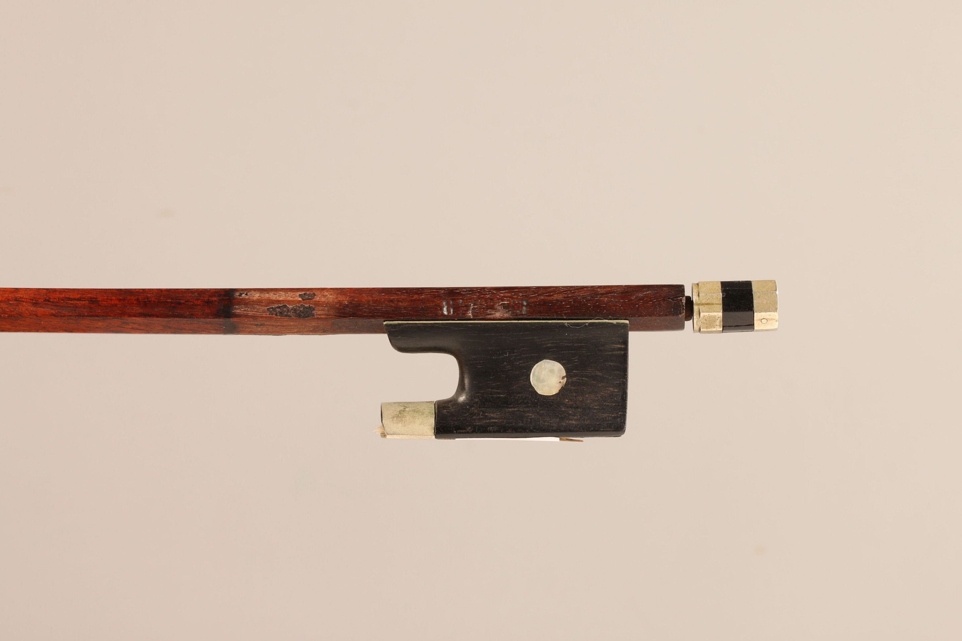 Baguette d'archet de violon de Louis BAZIN, portant signature "Simon Fr", hausse et bouton antérieurs monté maillechort. Assez bon état. 49g5 sans mèche ni garniture.