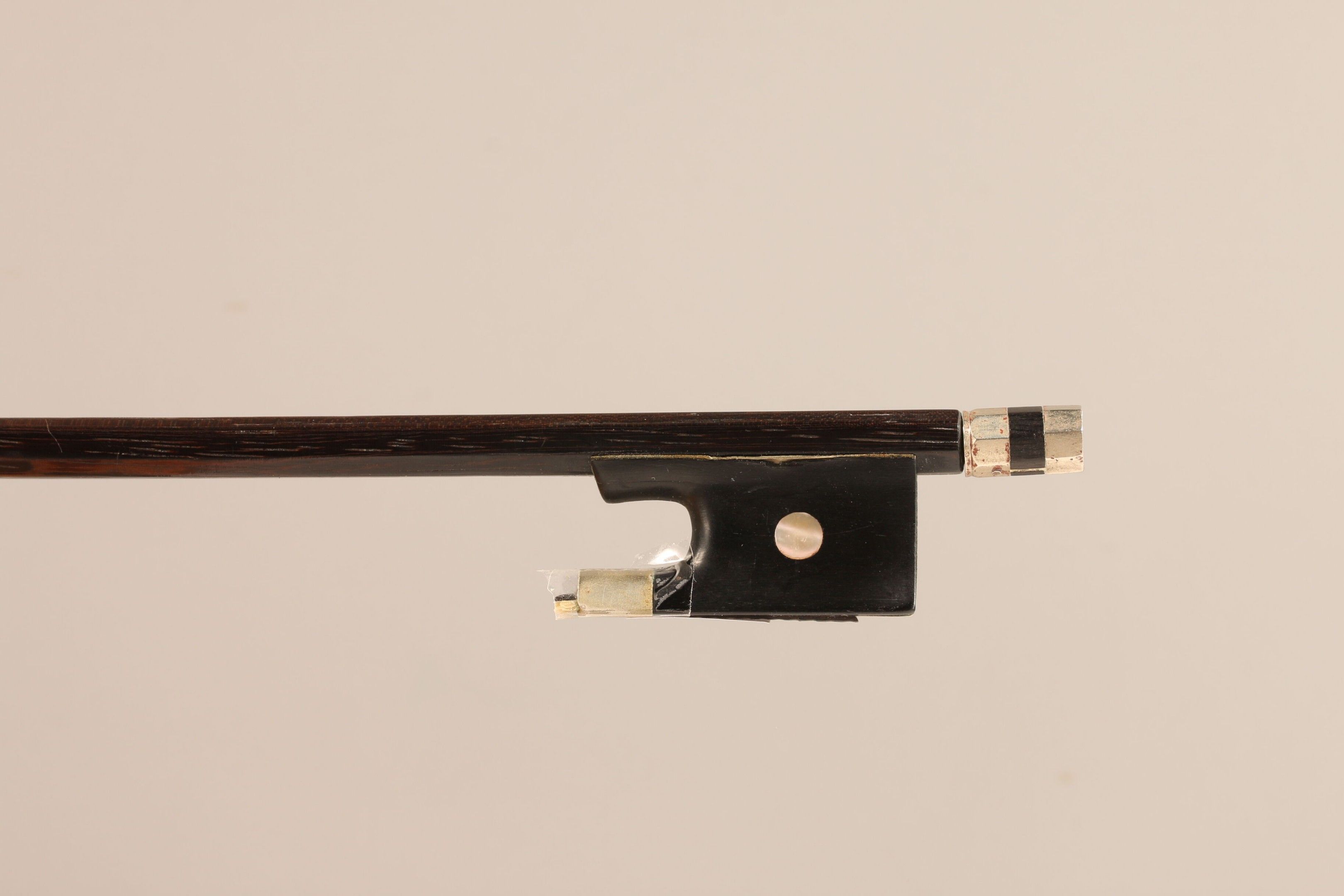 Baguette d'archet de violon de l'école de PECCATTE, en bois de fer, avec hausse et bouton de même époque, montés maillechort. 52g1, sans mèche ni garniture.