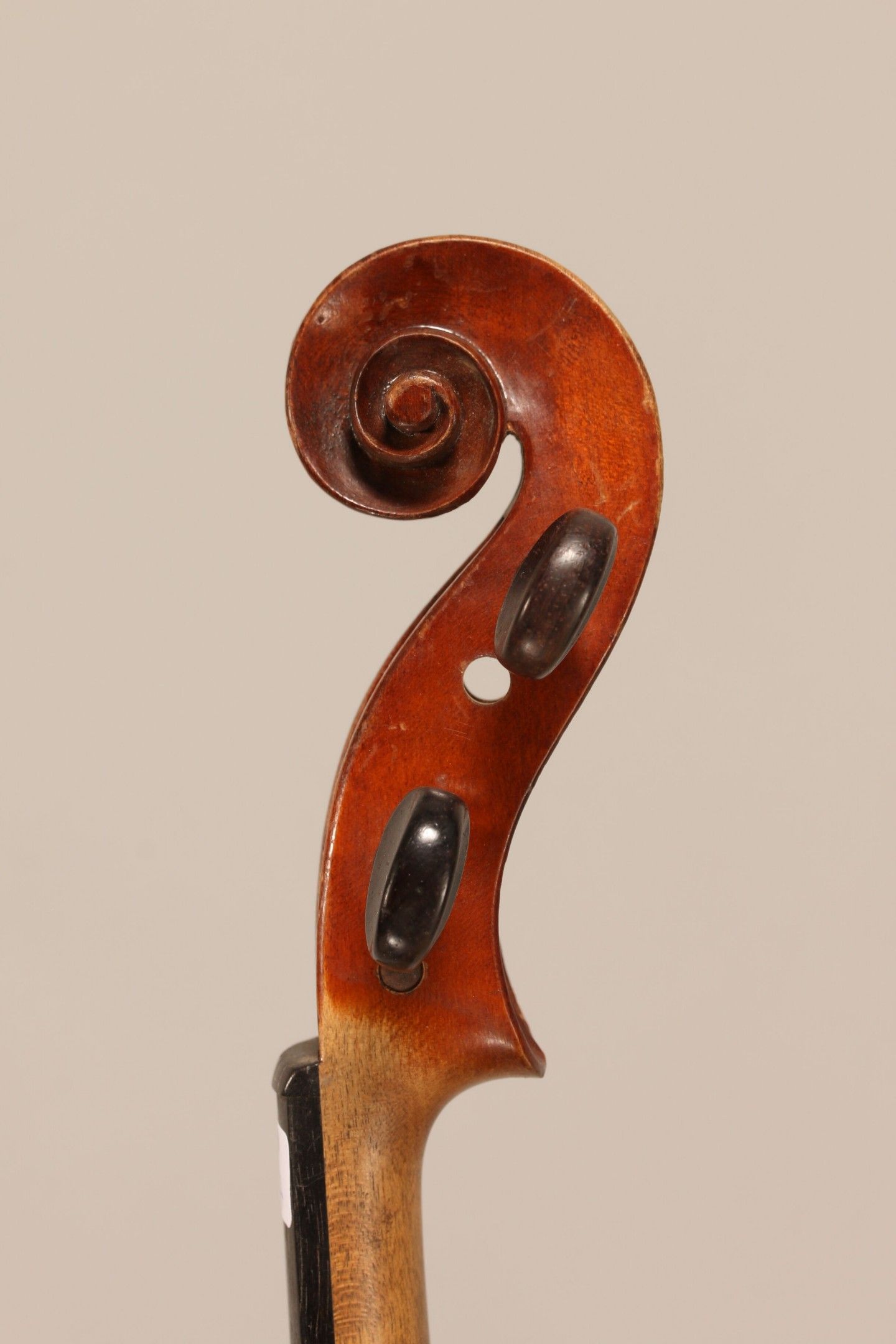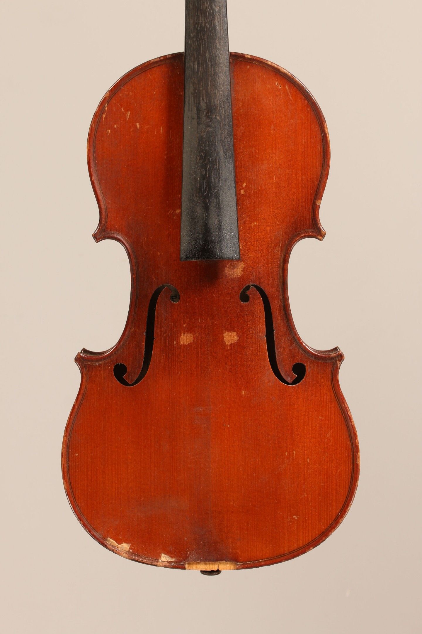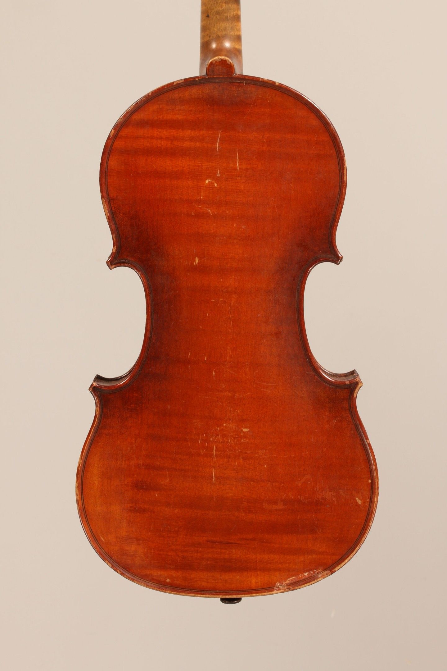 Violon Mirecourt ; portant étiquette Fait sous la direction des fils de J. Tournier. Bords de table arrachés. 358mm. [VREXP3]