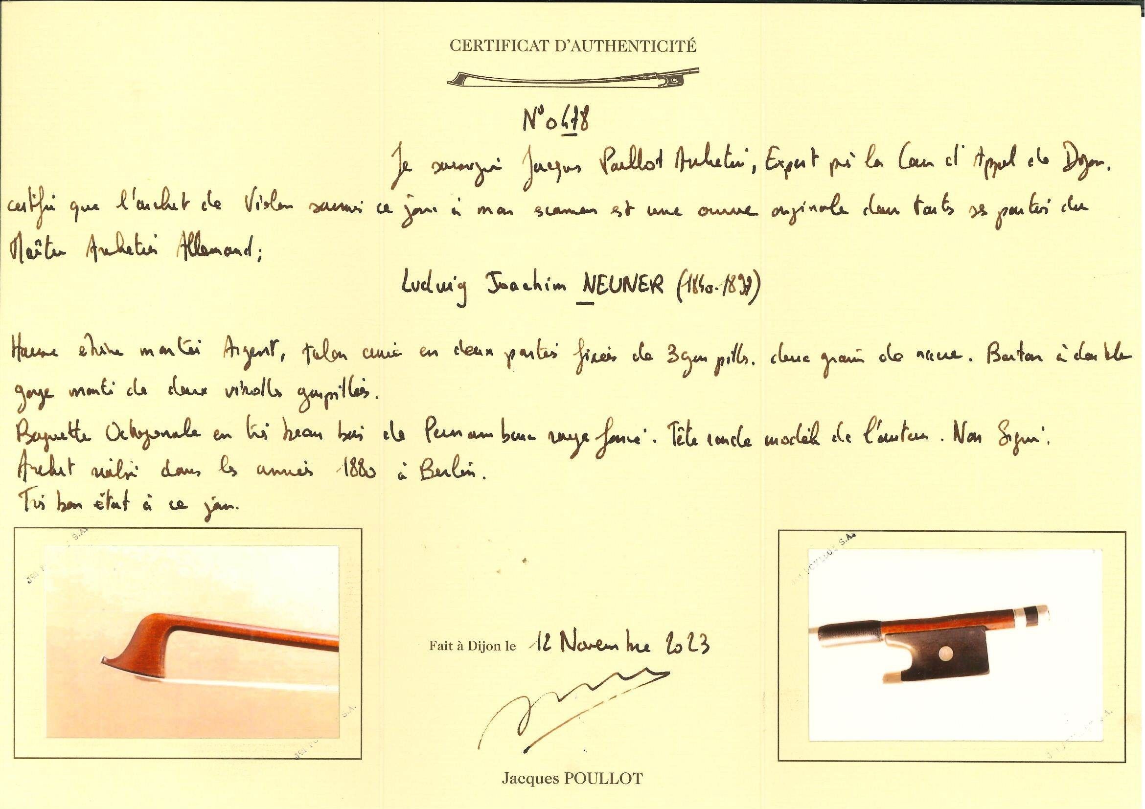 Archet de violon de Ludwig Joachim NEUNER, monté argent. 54g6. Usures arrière baguette. Accompagné de son certificat. (EAXB-CCL-3930)