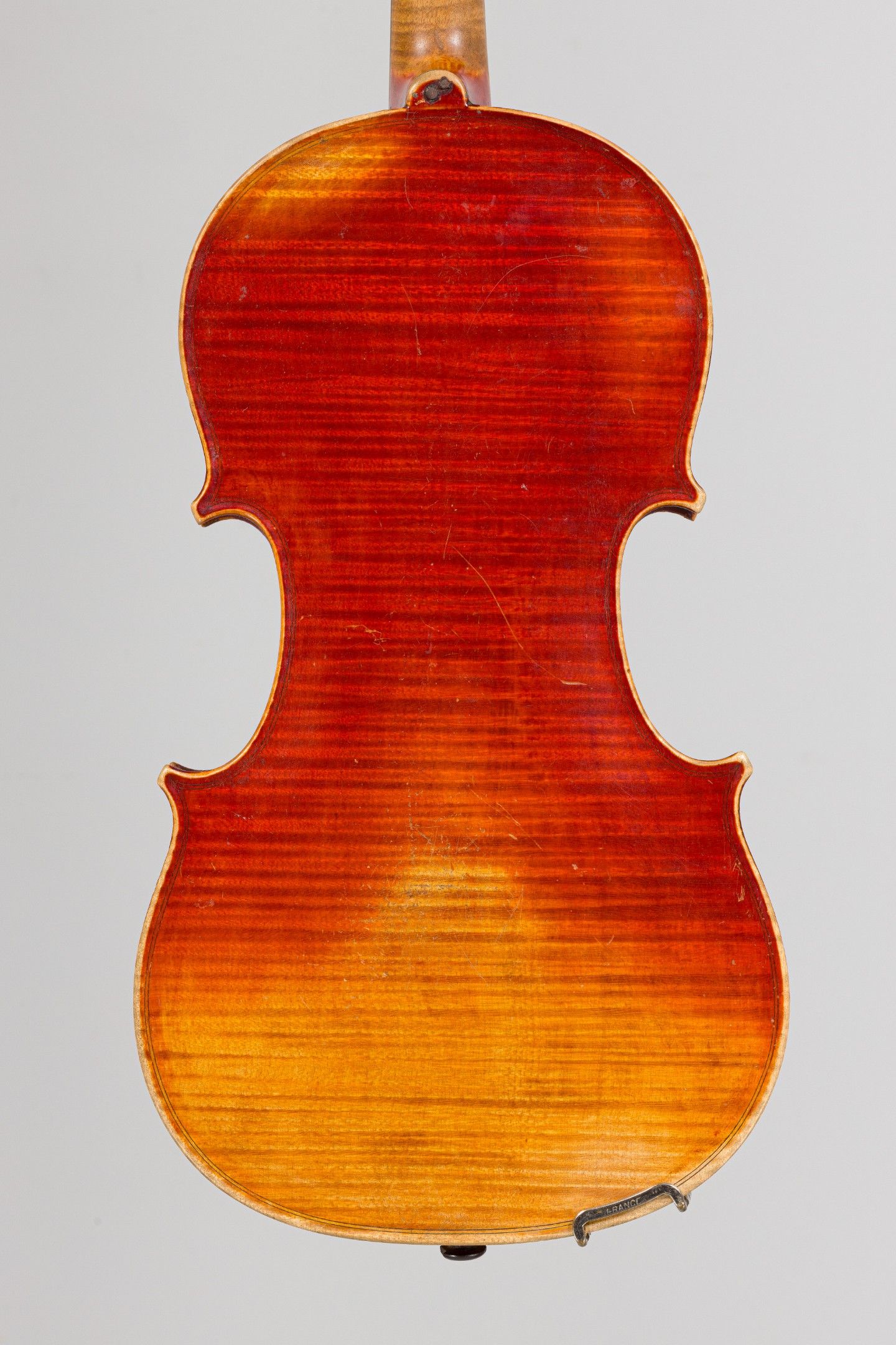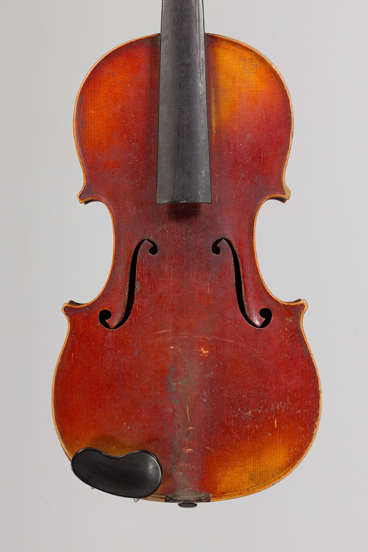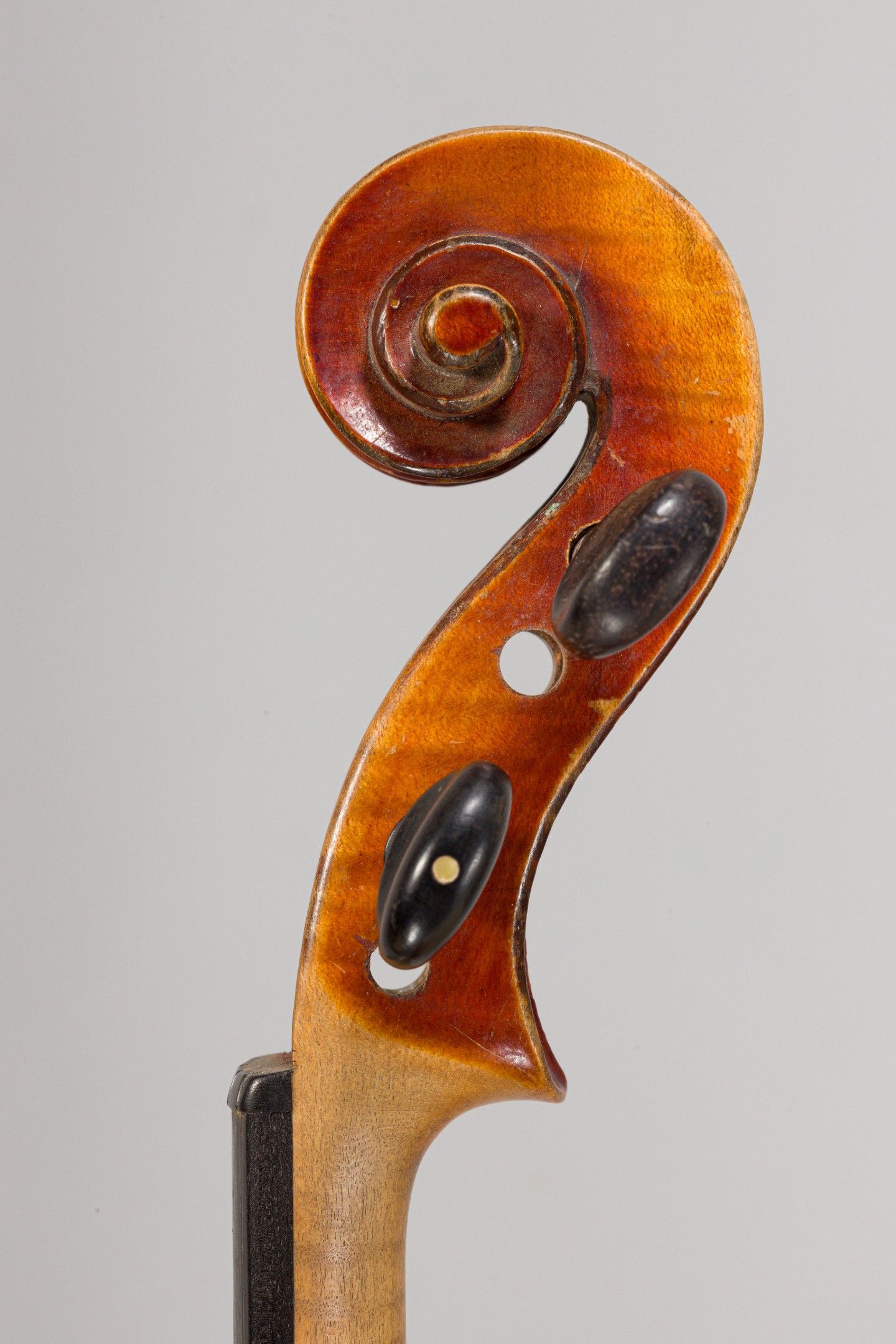 Violon Français province fait vers 1880 dans le style d'Emile Mennesson ; portant étiquette apocryphe Stradivarius. Talon cloué. Assez bon état. 357mm. This instrument is more than 100 years old. [VREXP3]