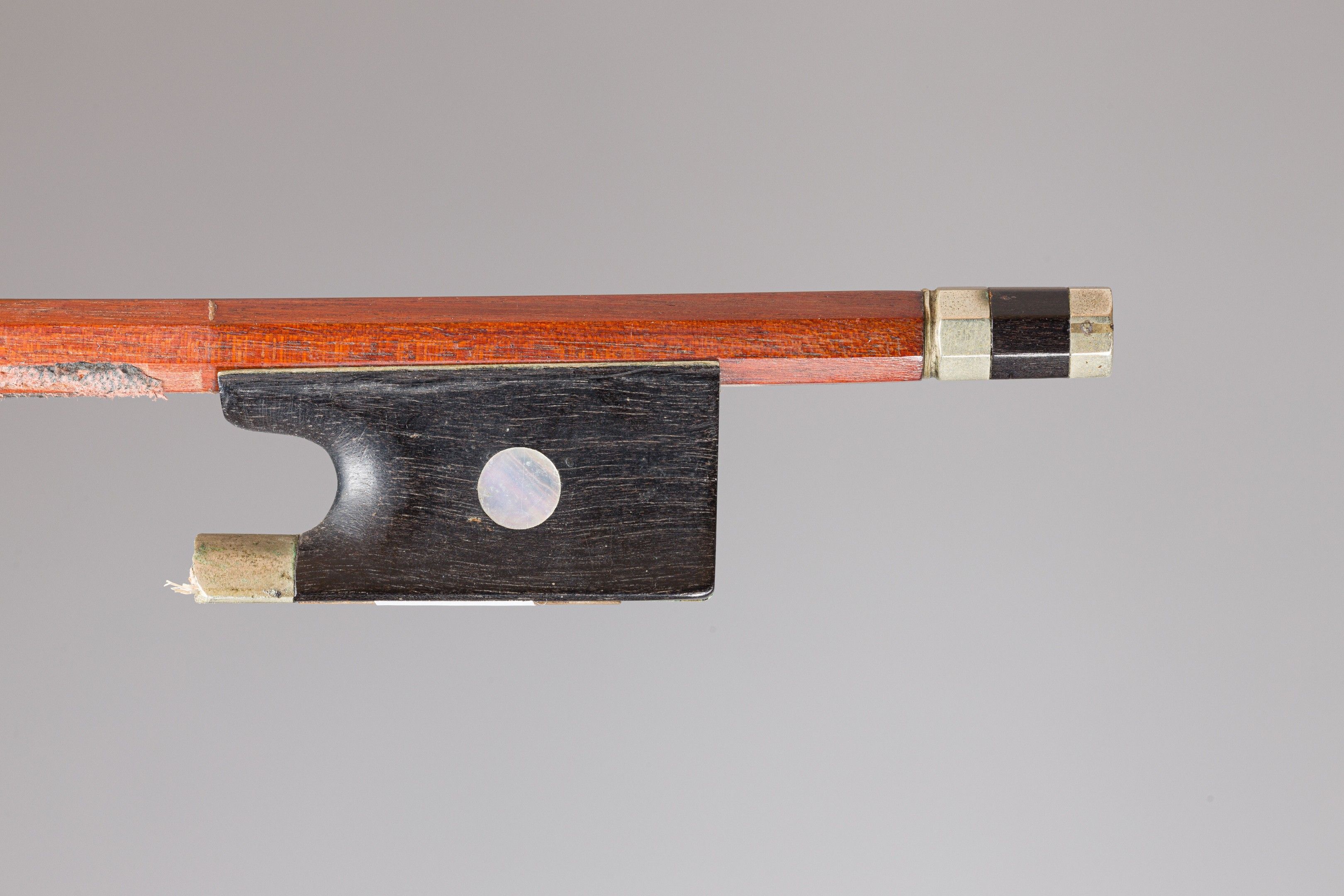 Archet de violon de François LOTTE, fait vers 1945, hausse et bouton postérieurs, monté maillechort. 52g1, sans mèche ni garniture. Petite arrachure côté tête, petite gerce baguette, petite gerce mortaise de vis et écrou. Bon état. (DZXC-BSI-2087)