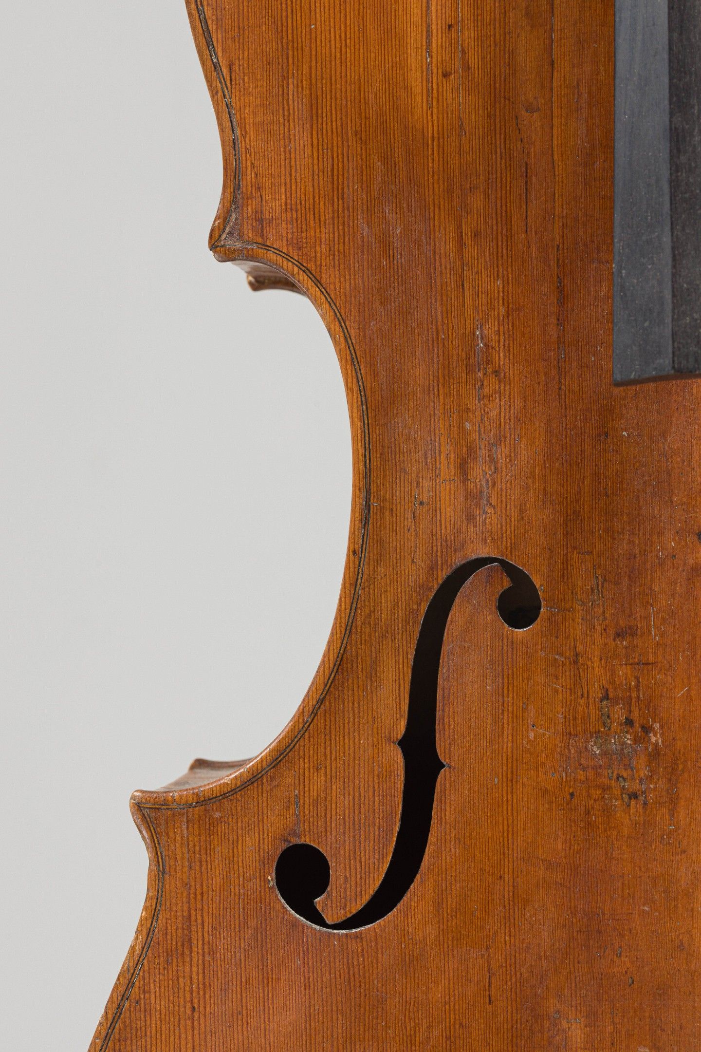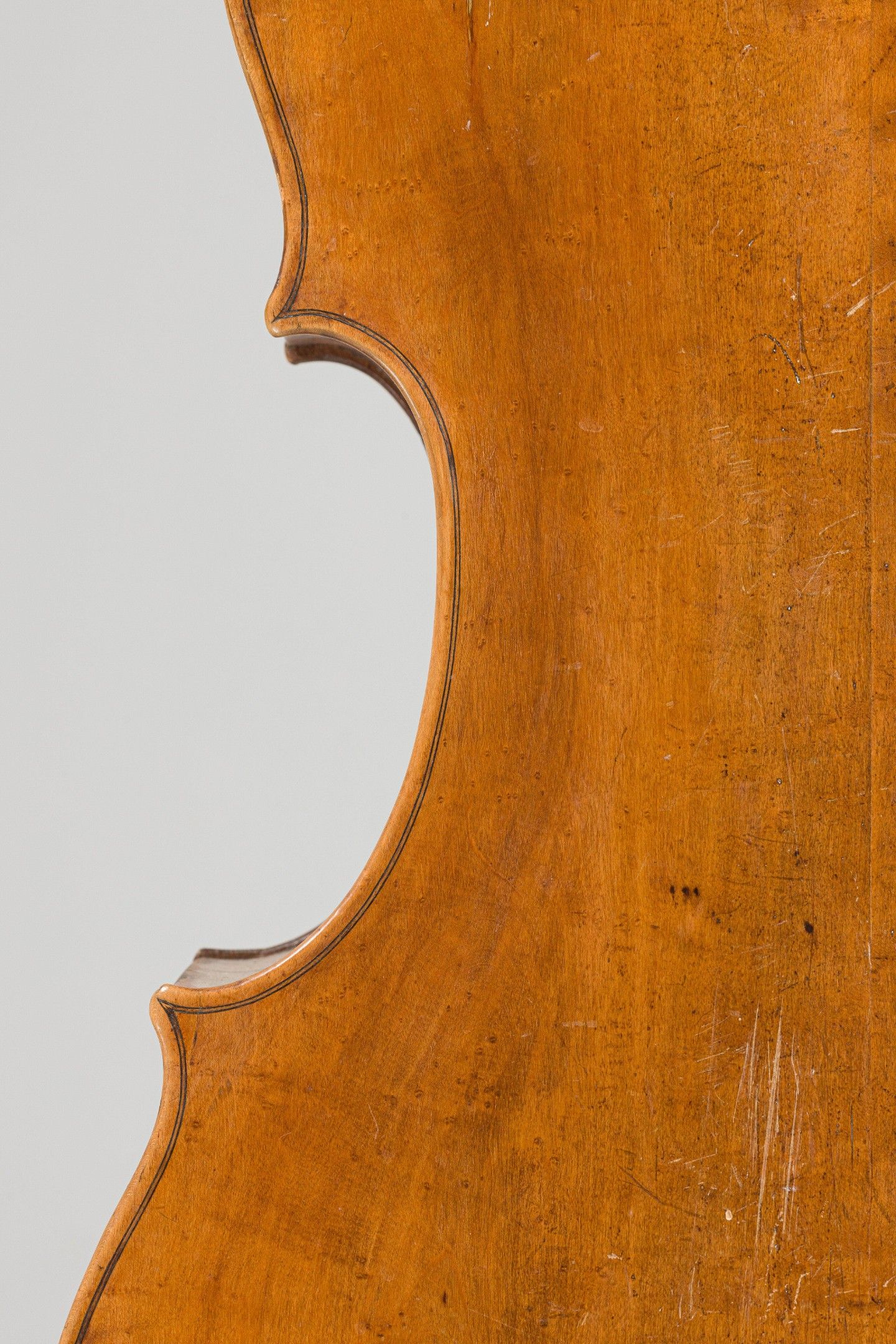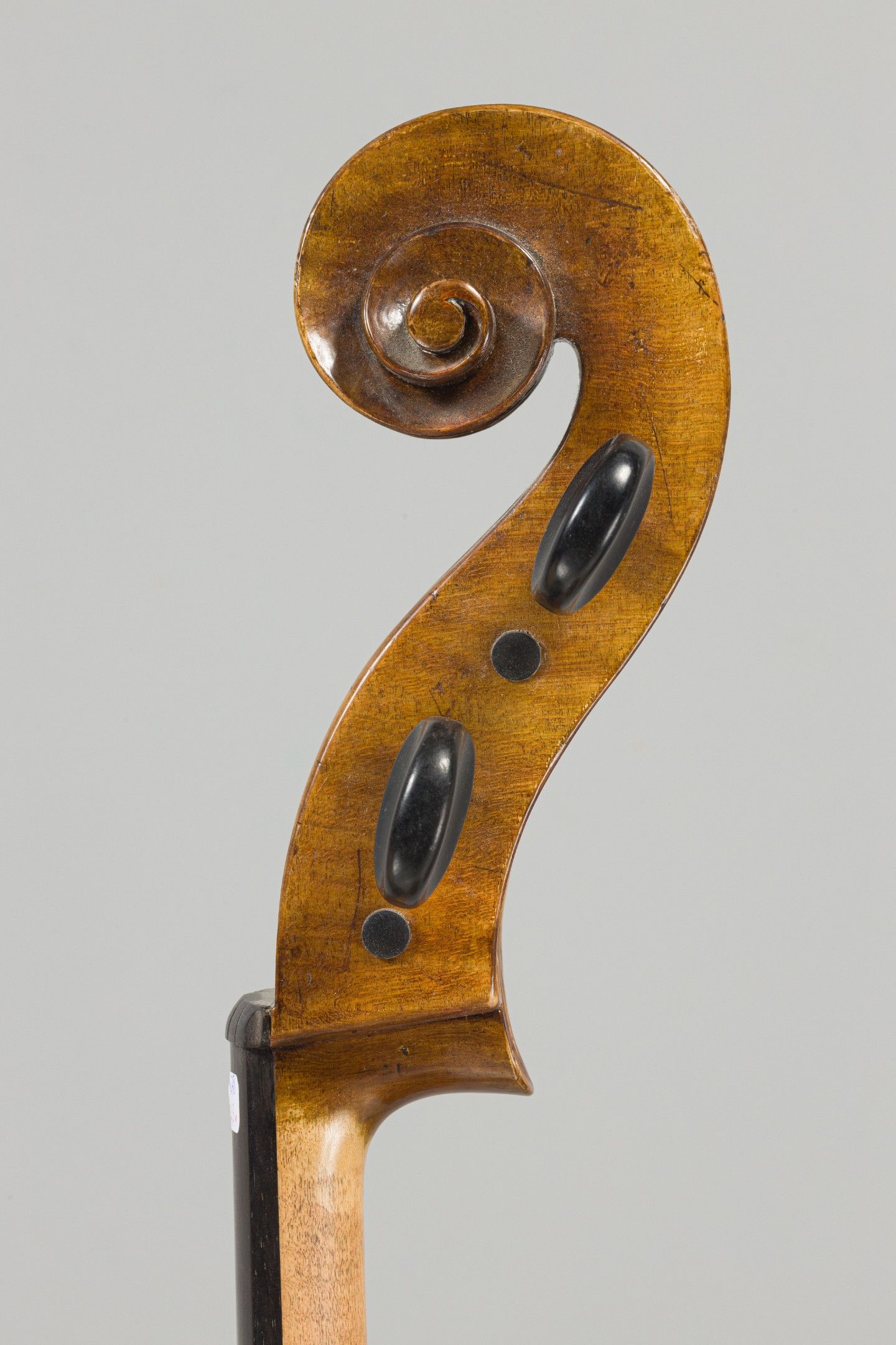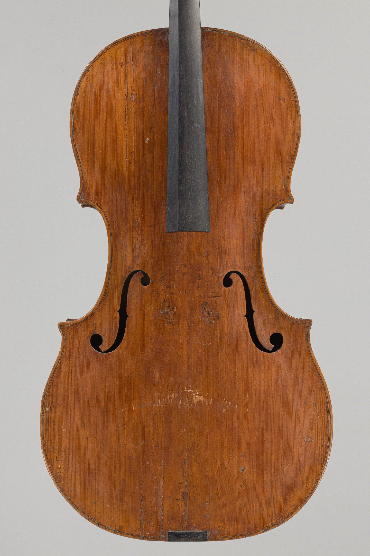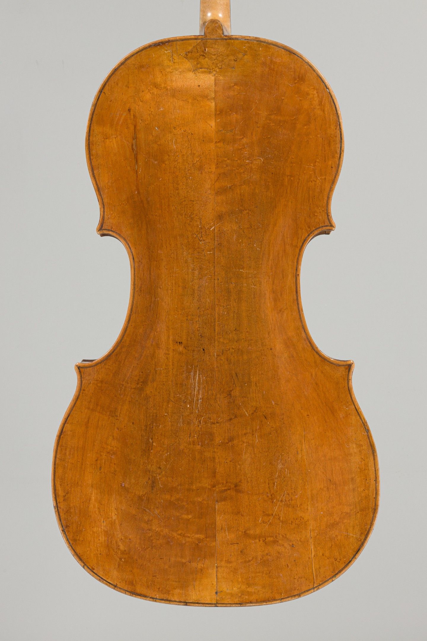 Violoncelle Allemand fait vers 1780, portant étiquette apocryphe Kloz. Différentes restaurations, éclisse avant accidentée, pièce au niveau du talon, nombreuses galeries de vers, la volute n'est pas d'origine. 750mm. This instrument is more than 100 years old.