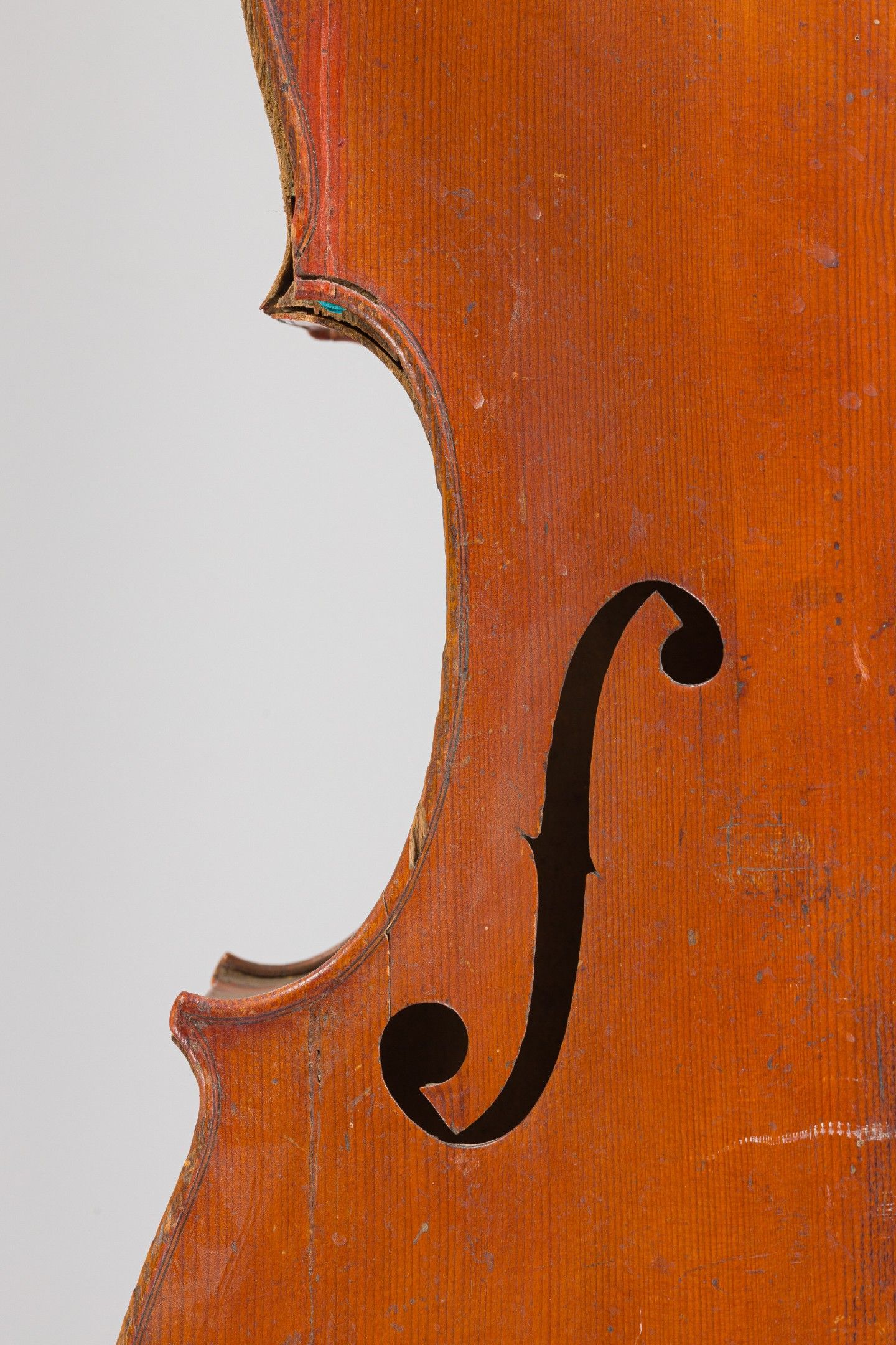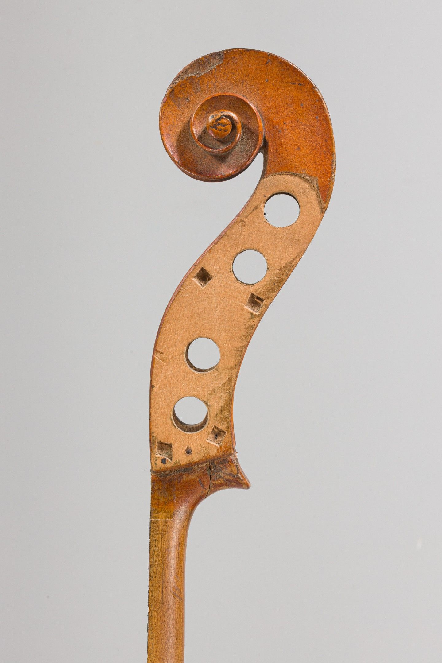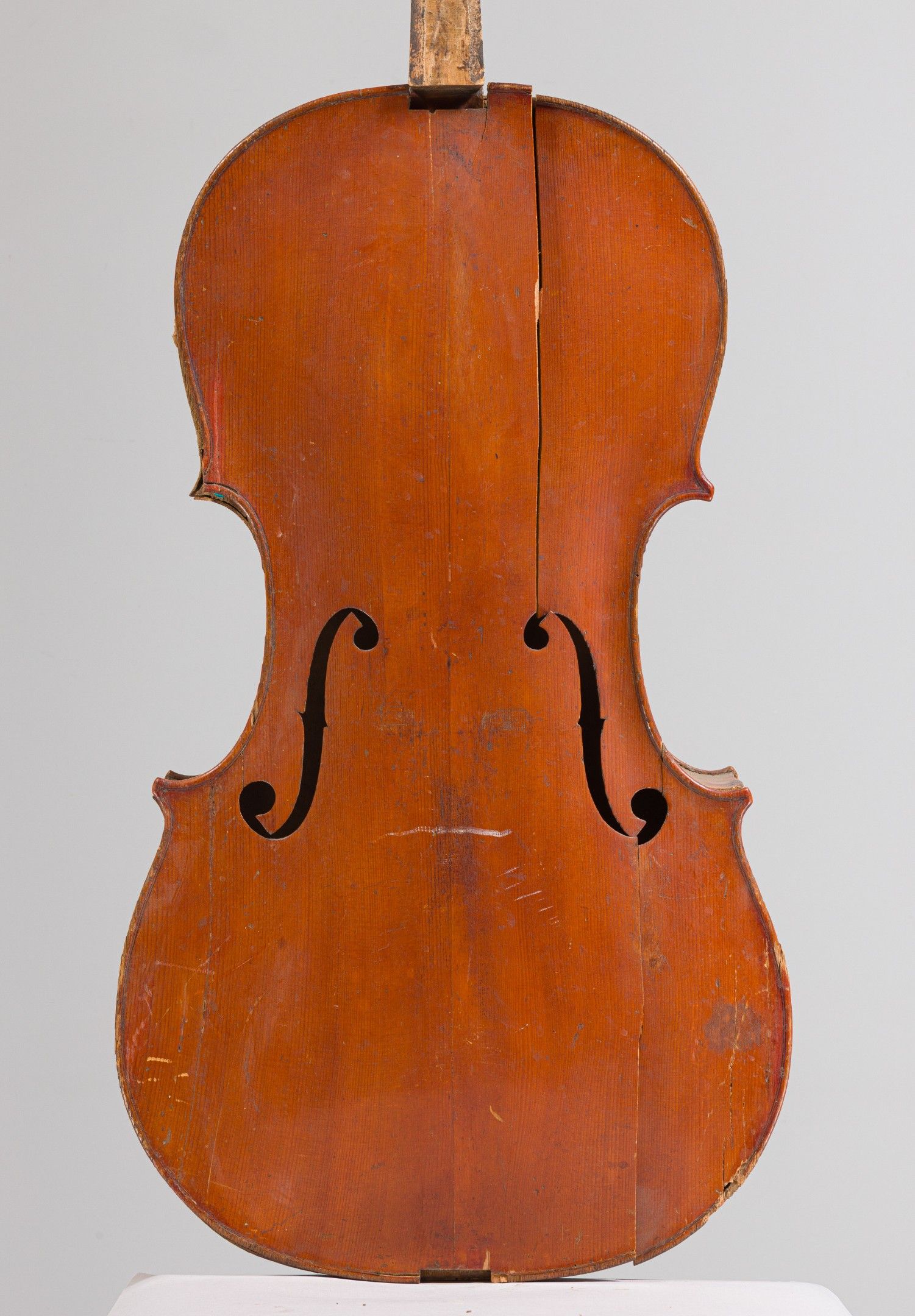Violoncelle Français XVIIIème 3/4 petite taille. Table accidentée, décollée, sans sa touche, galerie de vers, éclisses décollées, tête recollée éclat à la tête. 678mm. This instrument is more than 100 years old. [VREXP3]
