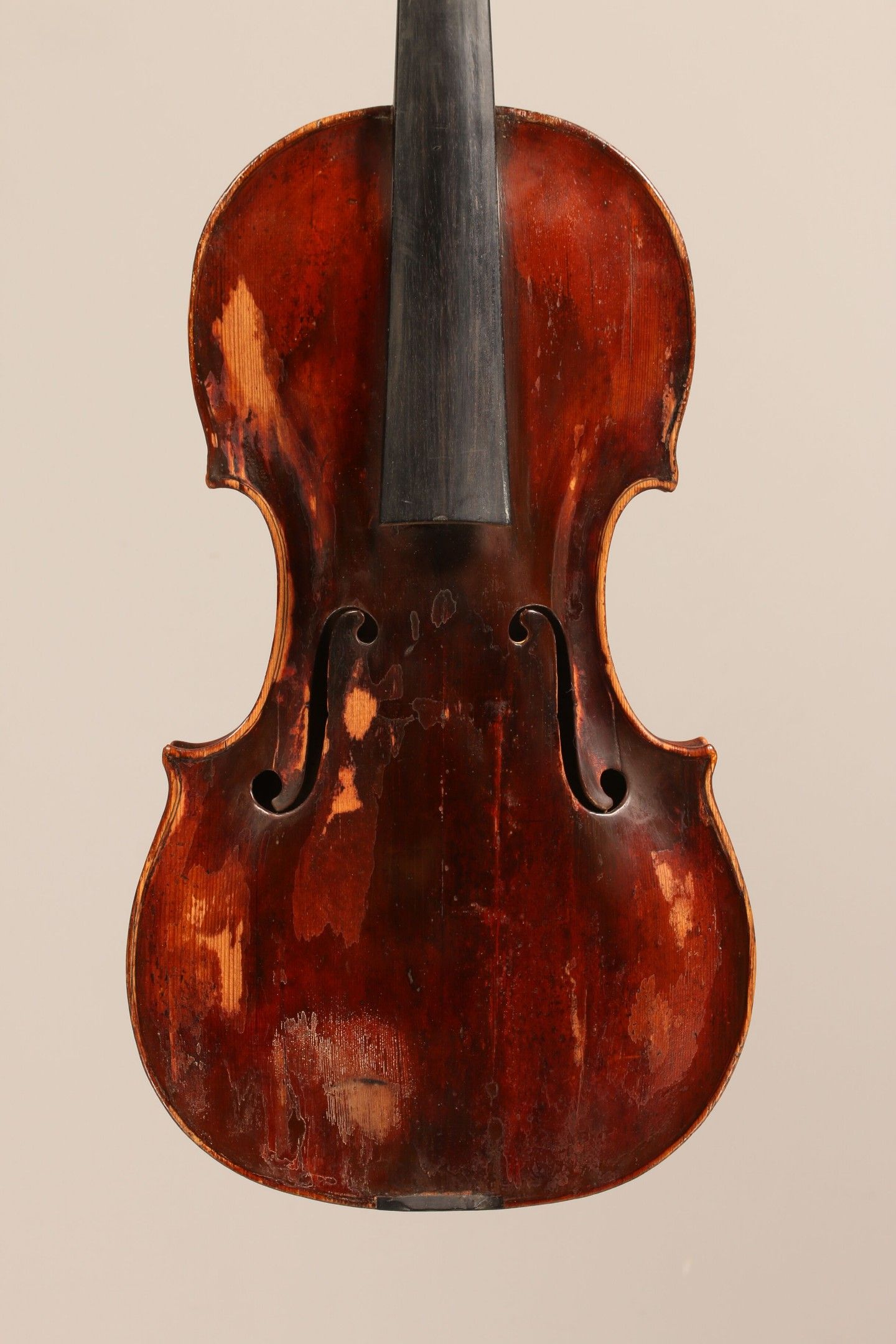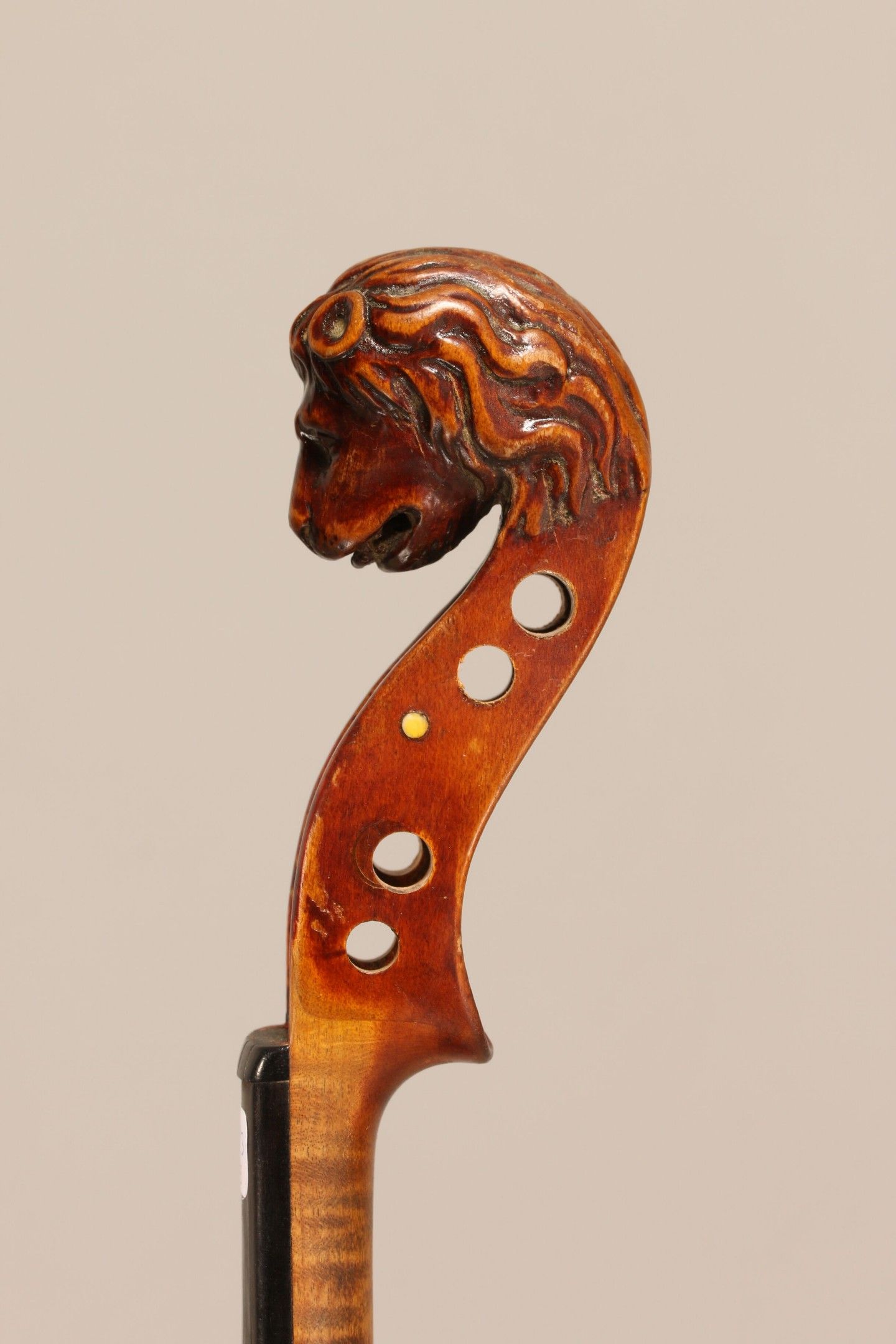 Violon Allemand seconde partie du XVIIIème ; portant étiquette apocryphe Steiner et étiquette apocryphe Dellinger. Tête de lion probablement postérieure, nombreuses restaurations sur la table. 352mm [VREXP3] This instrument is more than 100 years old.