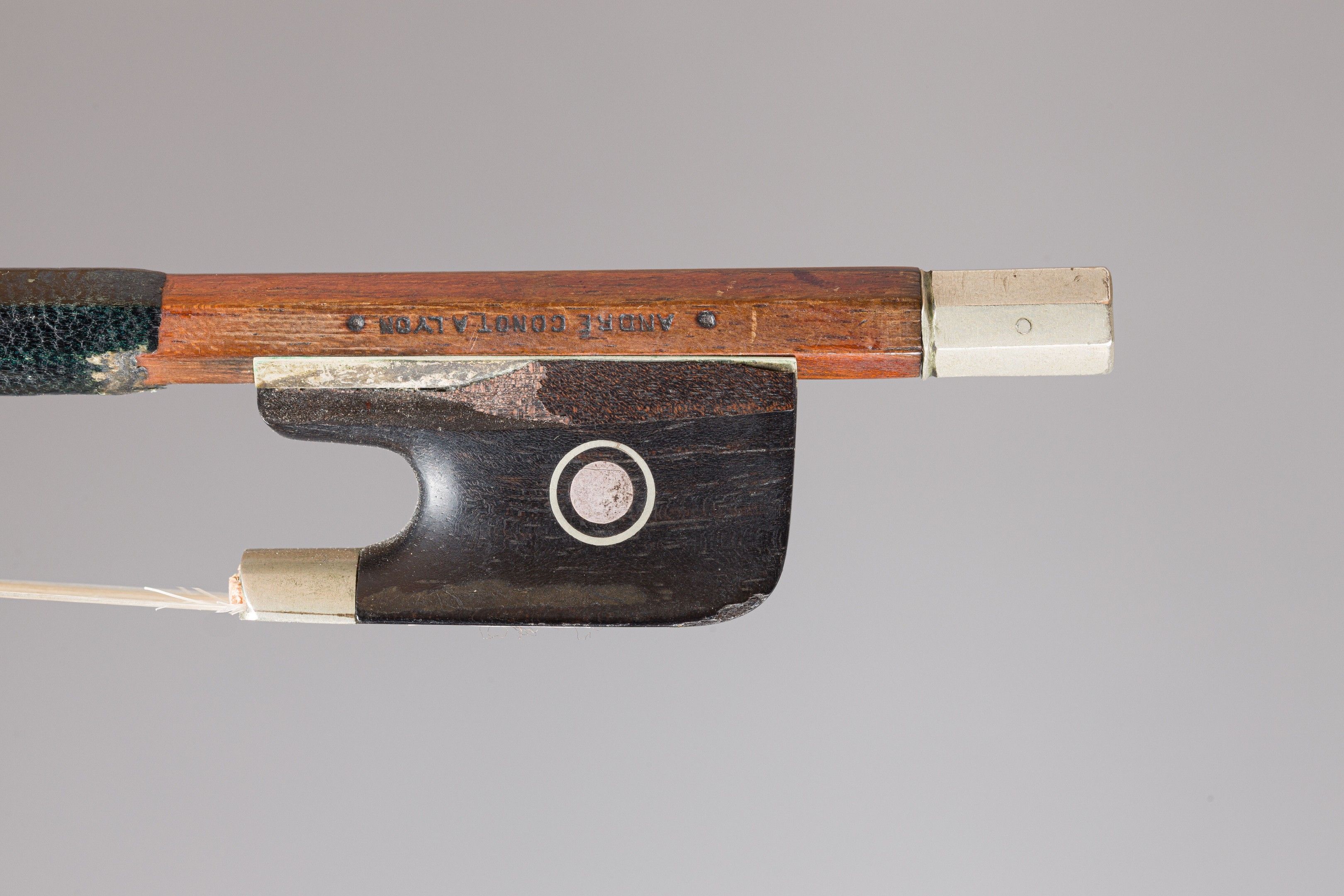 Archet de violoncelle de HUSSON MARIET, fait vers 1915/1920, en bois exotique, signé "André Conot à Lyon", monté maillechort. 61g5, mèche fine. Fente arrière tête, coups tête et baguette, fentes et éclats hausse. (EAAJ-CSV-4081). This instrument is more than 100 years old.