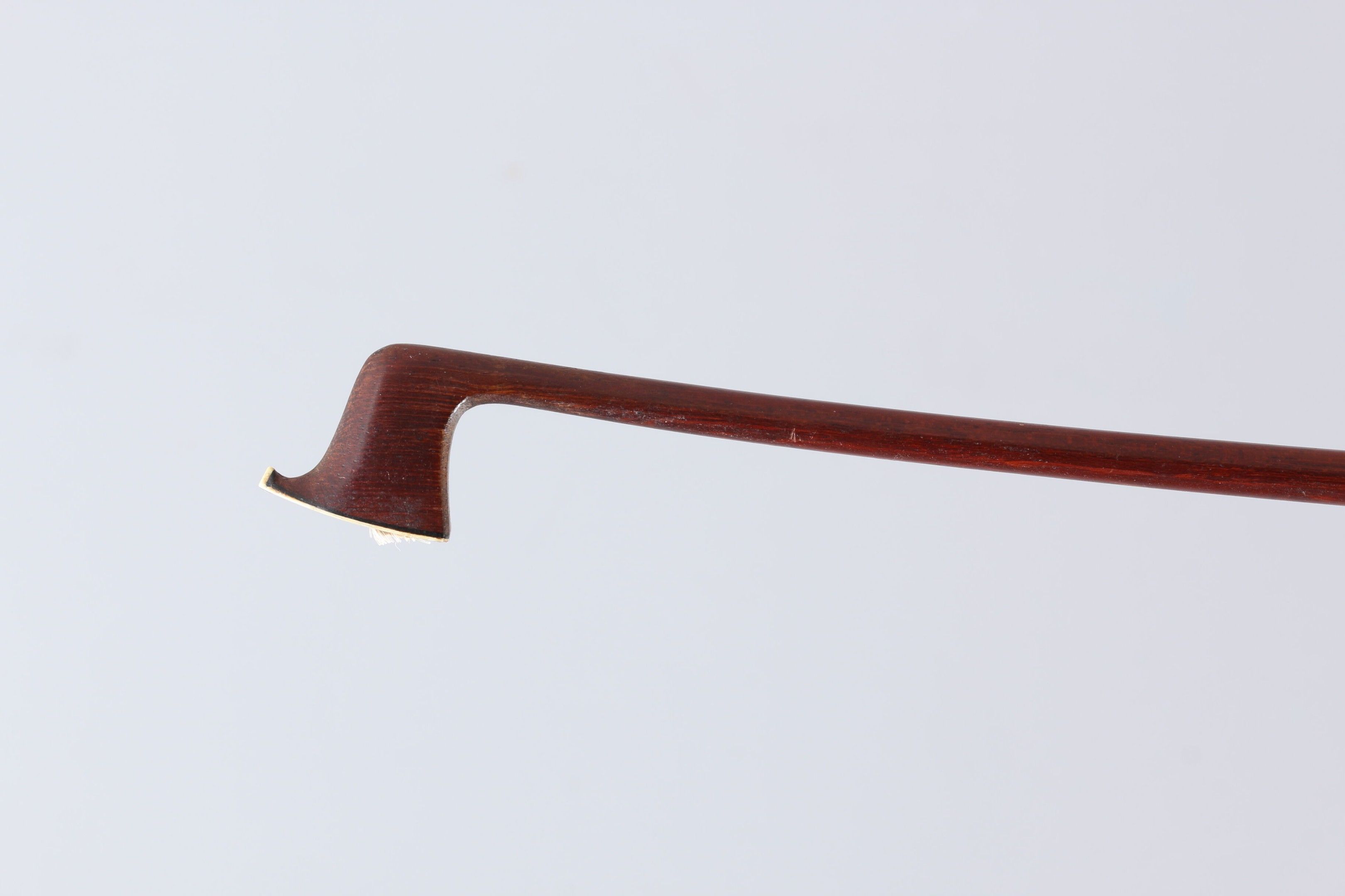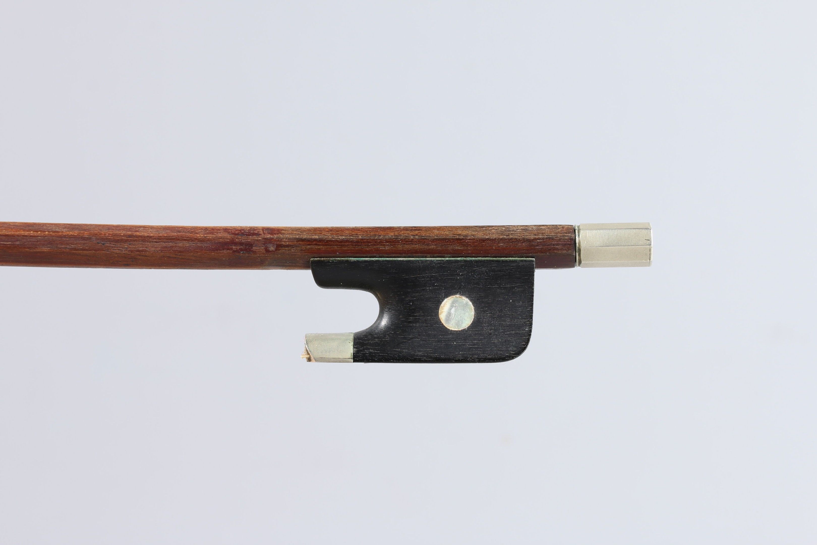 Archet de violon de HUSSON MARIET, en bois exotique, monté maillechort. 45g3, sans mèche ni garniture. Assez bon état.