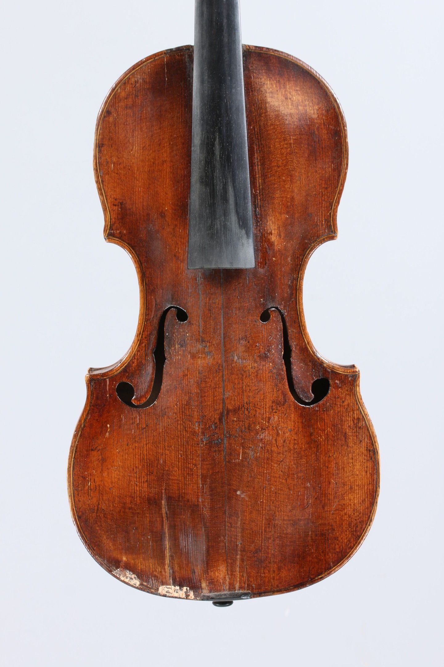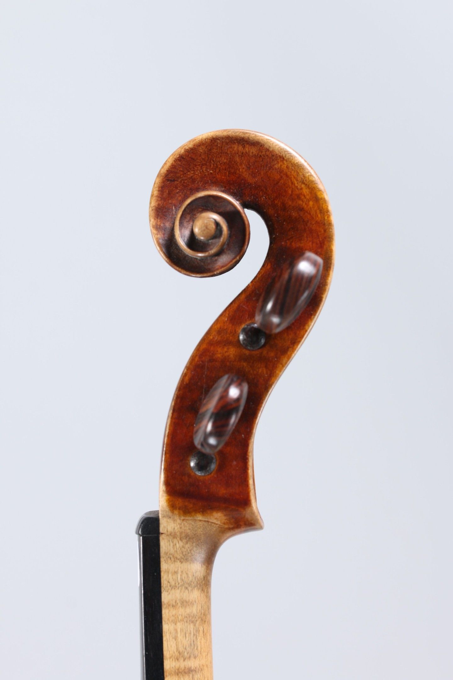 Violon Allemand seconde partie du XVIIIème, tête remplacée ; portant étiquette apocryphe Sebastien Kloz. Différentes restaurations sur la table dont cassure d'âme et de barre. 356mm. This instrument is more than 100 years old. [VREXP3]