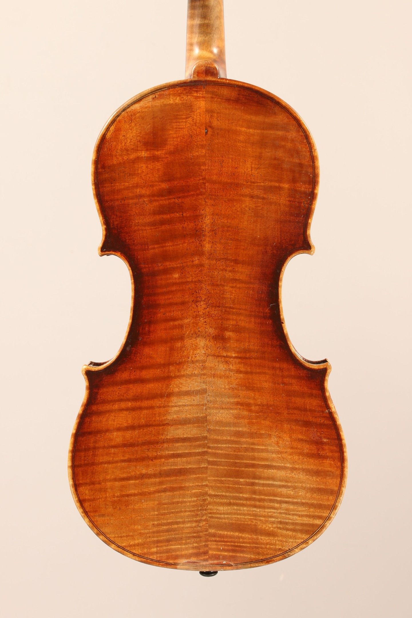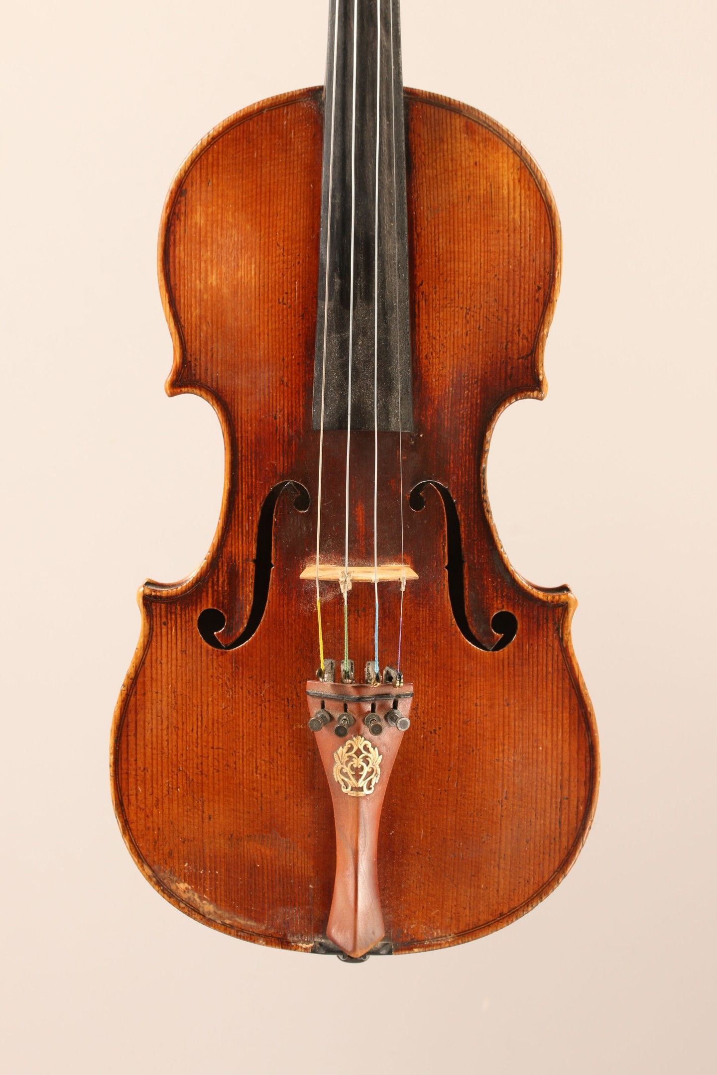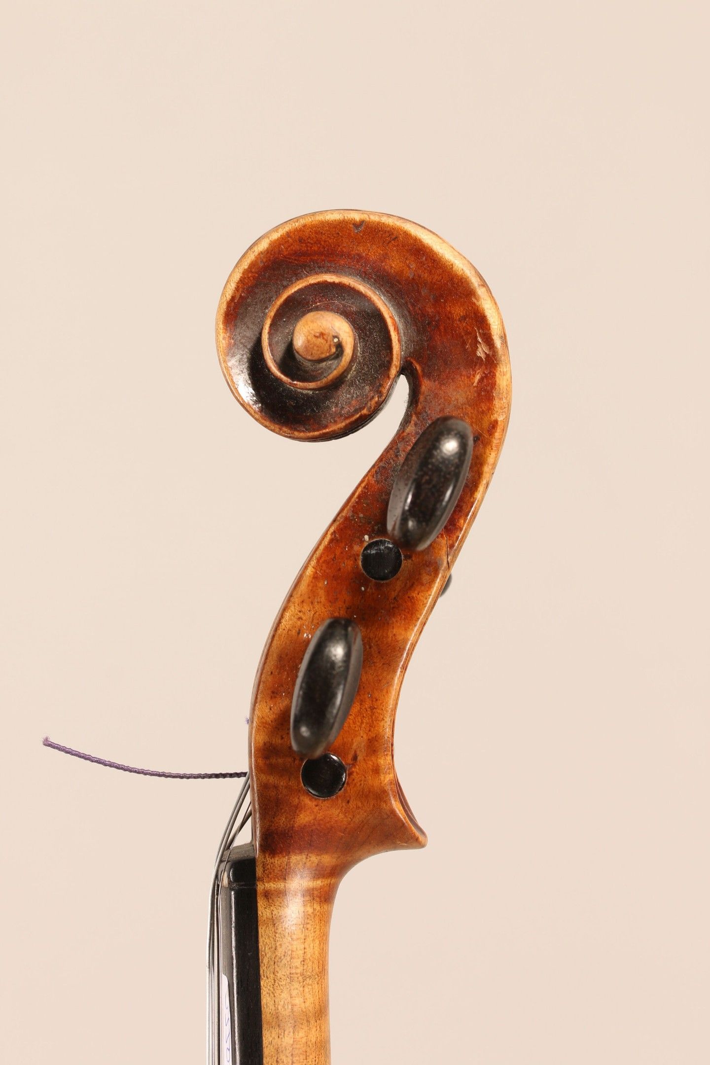 Violon de la Maison JÉRÔME THIBOUVILLE-LAMY, fait à Mirecourt début XXème ; portant étiquette Copie de Guadagnini. État : cassures sur la table et la tête. This instrument is more than 100 years old. [VREXP2]