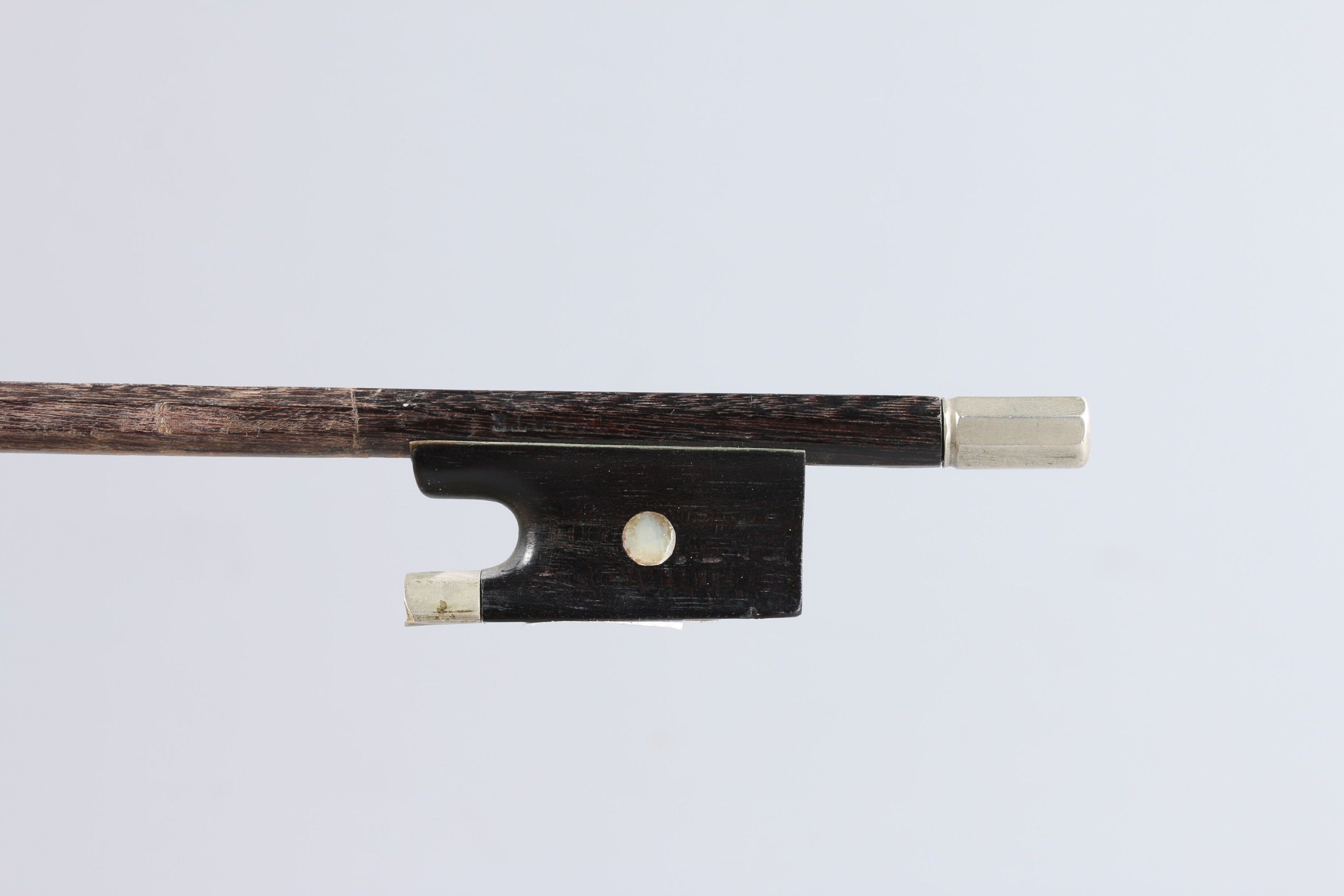 Baguette d'archet de violon d'Emile François OUCHARD, signée "Tourte", hausse et bouton postérieurs, montés maillechort. 48g7, sans mèche ni garniture. Éclat hausse.
