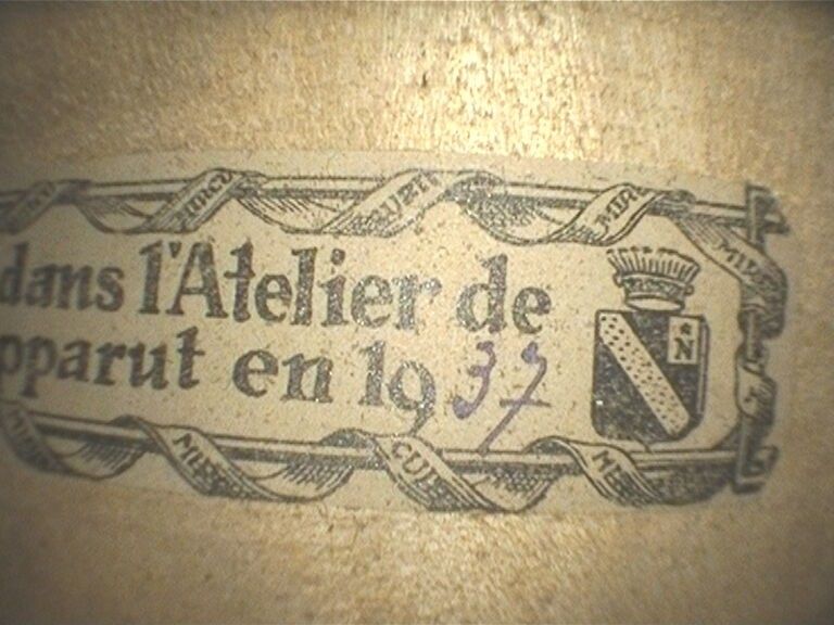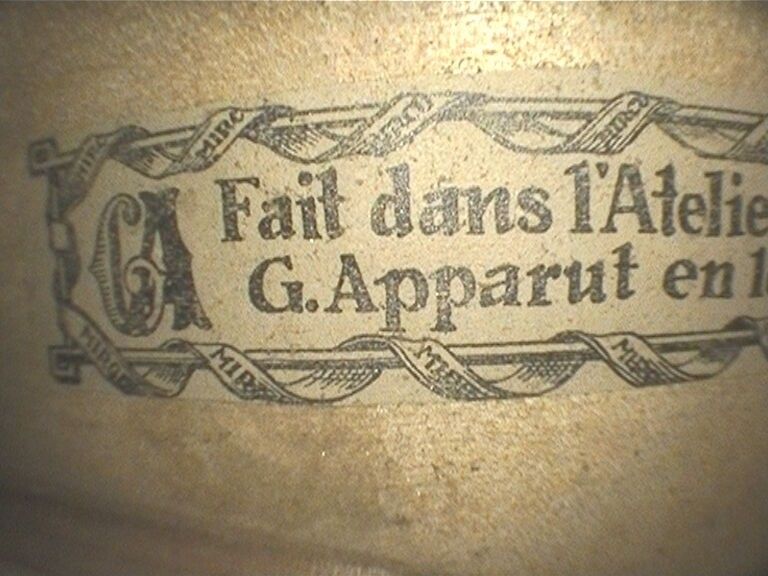 Violon de l'atelier de Georges APPARUT, fait à Mirecourt, en 1937 ; portant étiquette Fait dans l'atelier de G. Apparut en 1937. Petite cassure sur la table. 356mm. [VREXP2]. Accompagné de son certificat d'origine.