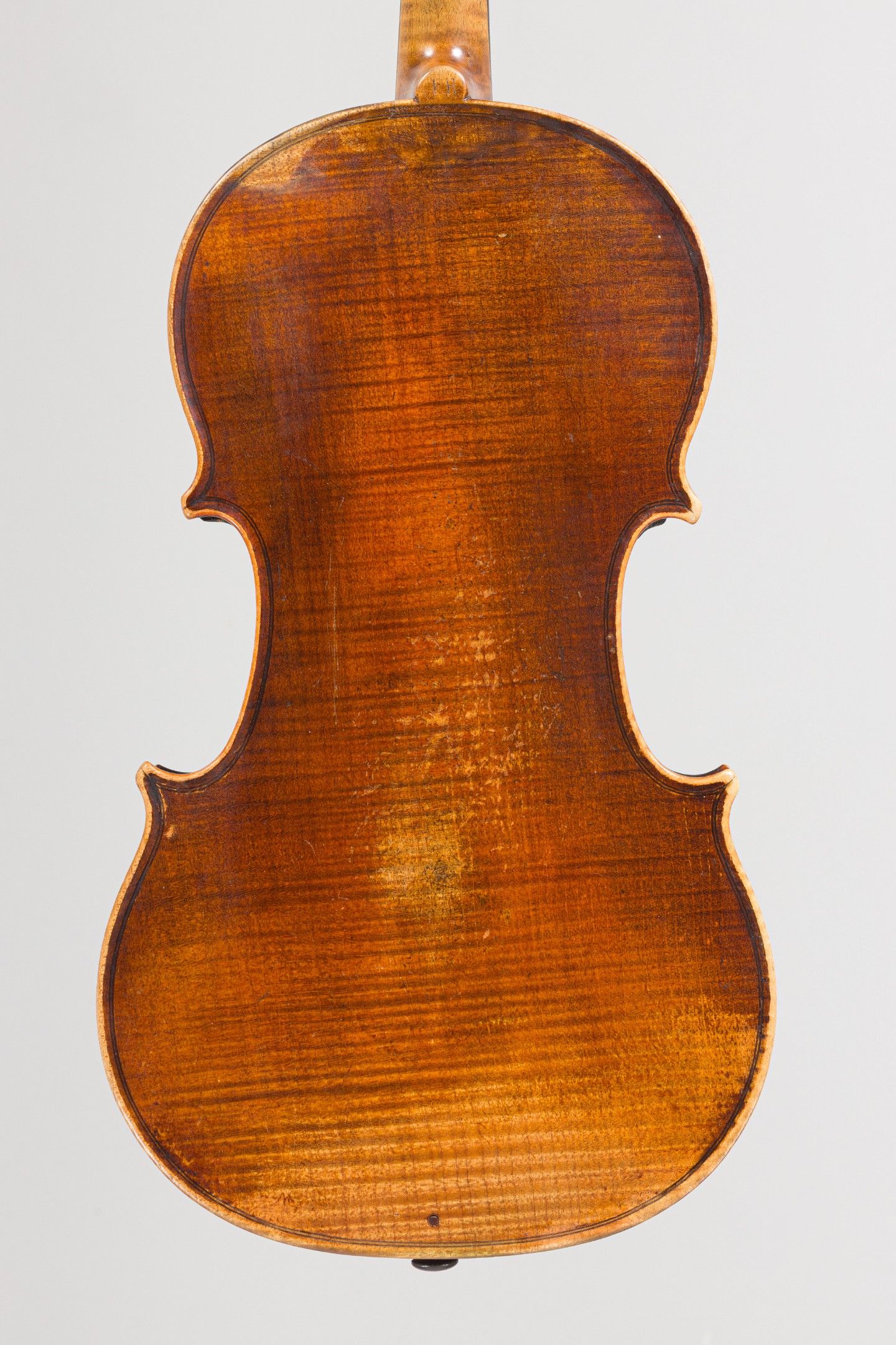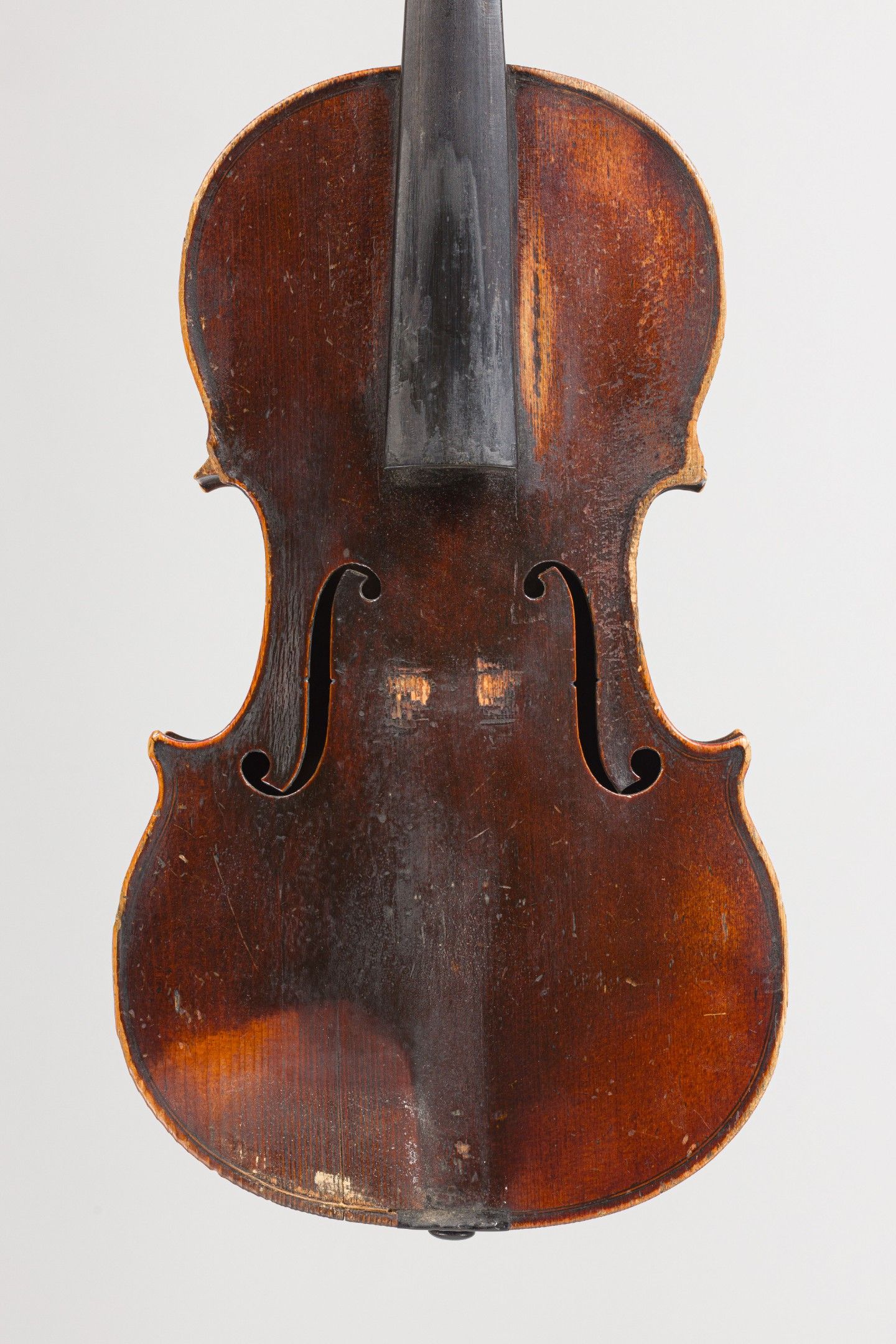 Violon de Nicolas MORLOT, fait à Mirecourt vers 1820 - 1830 ; portant marque au fer Nicolas Morlot. Cassures sur la table, coins de table manquants. 361mm. [VREXP1]