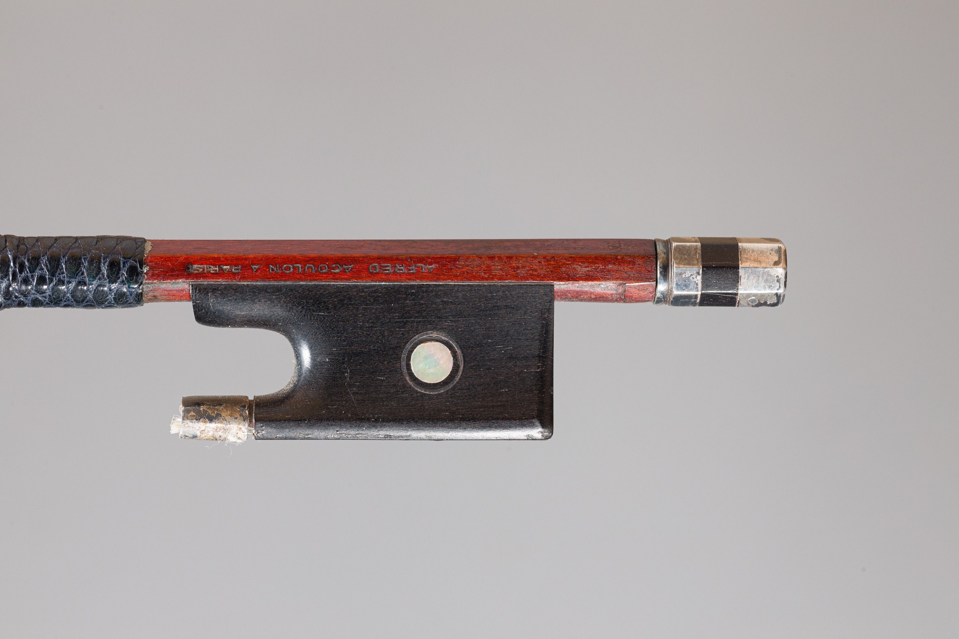 Archet de violon JÉRÔME THIBOUVILLE-LAMY, fait vers 1950, signé "Alfred Acoulon à Paris", monté argent. 53g5, sans mèche et garniture fine. Coups dessus tête, hausse bloquée, virole arrière légèrement dessoudée. Très bon état. (EBBH-BZZ-4330).