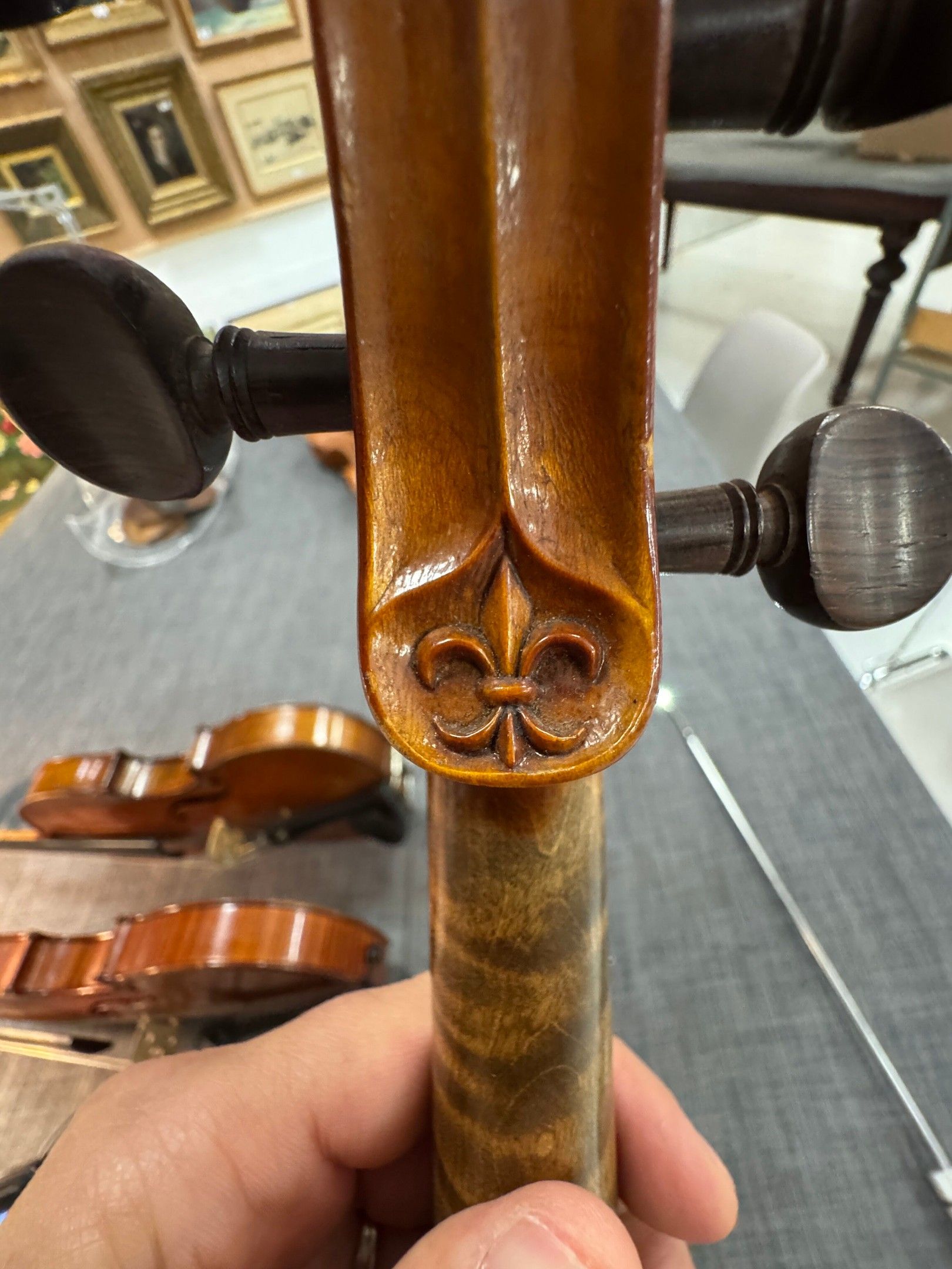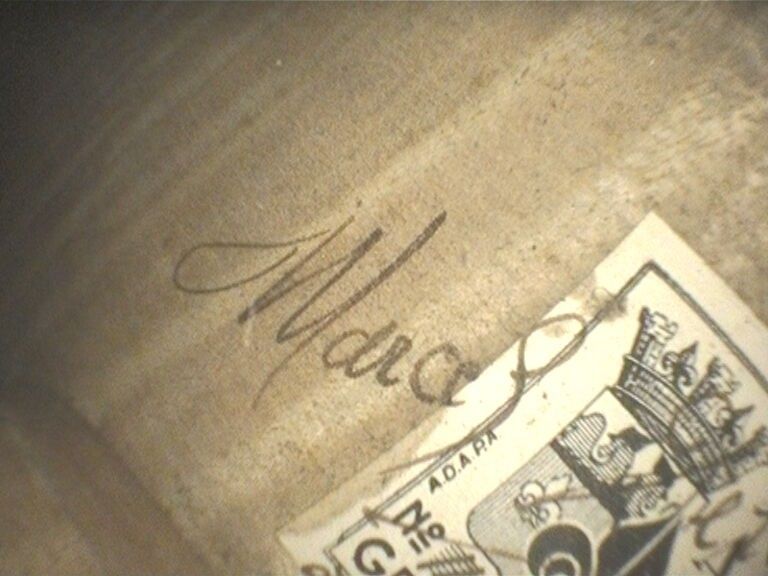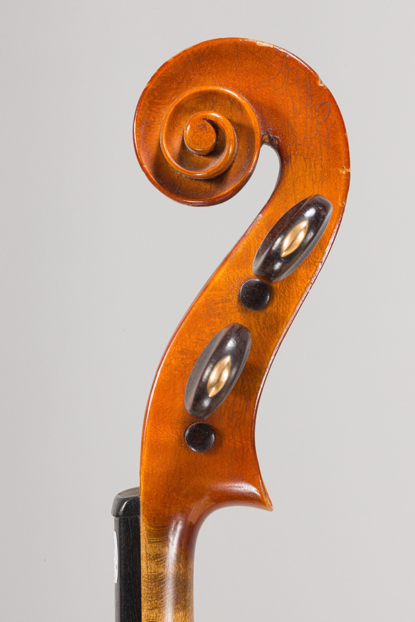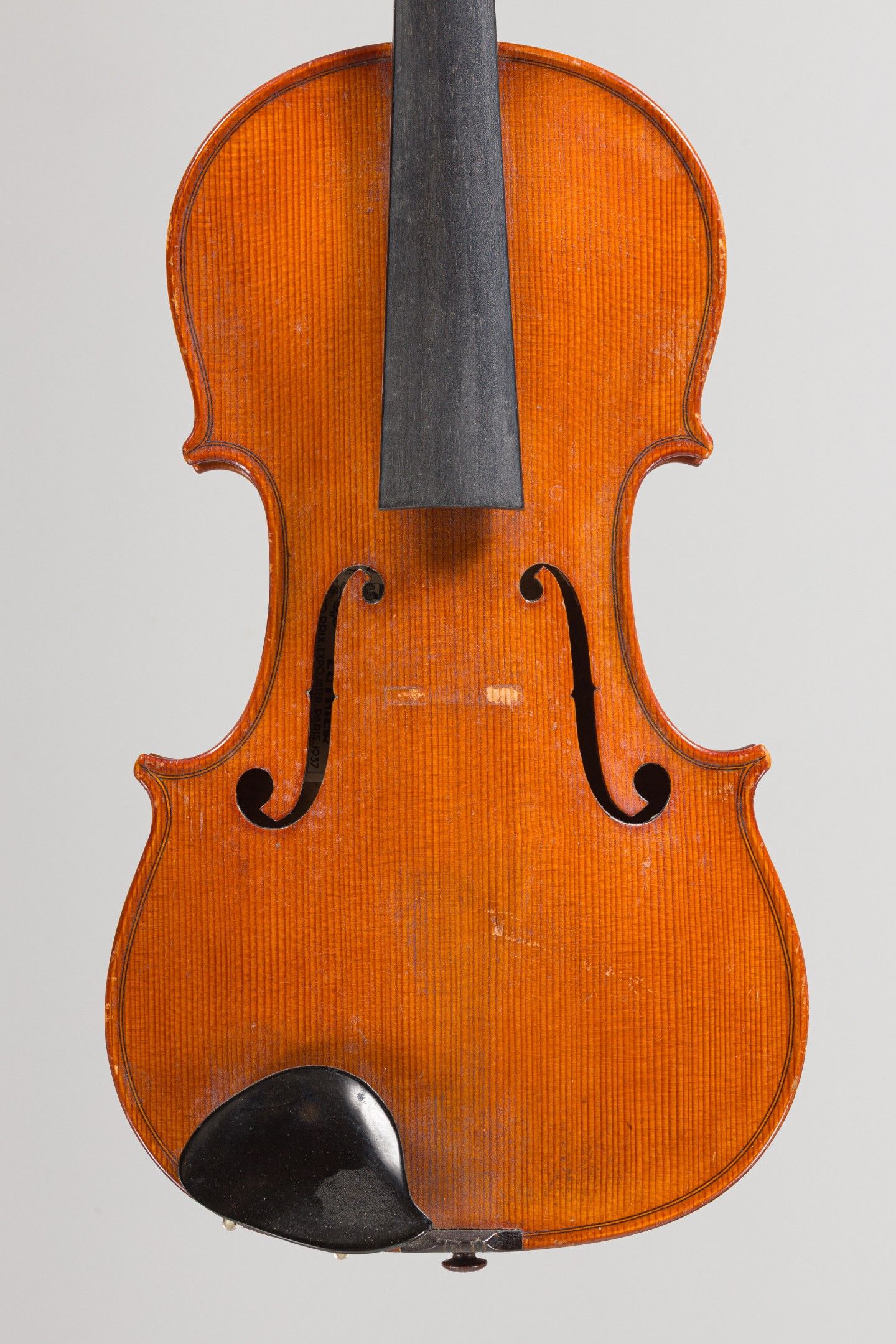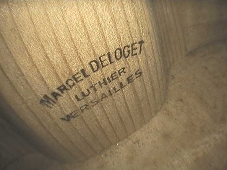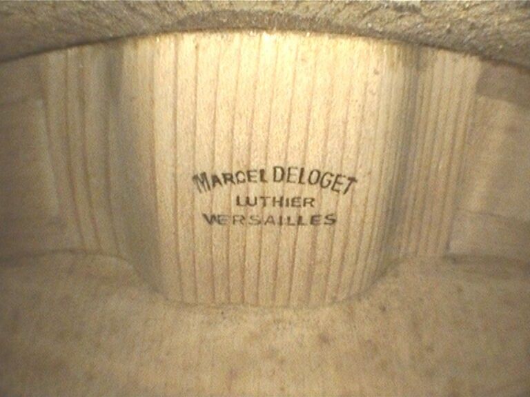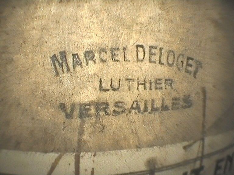 Violon de Marcel DELOGET, fait à Versailles en 1939 ; portant étiquette Fait en 1939 à Versailles par Marcel Deloget luthier, et marque au fer sur le tasseau de devant. Début de petite cassure de talon. 360mm [VREXP1]