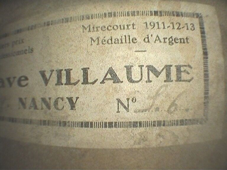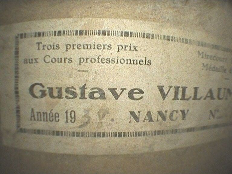 Violon de Gustave VILLAUME, fait à Nancy en 1938 ; portant étiquette Gustave Villaume année 1938 Nancy et marque au fer sur le fond et sous le talon. Cassure sur la table. 358mm [VREXP1]