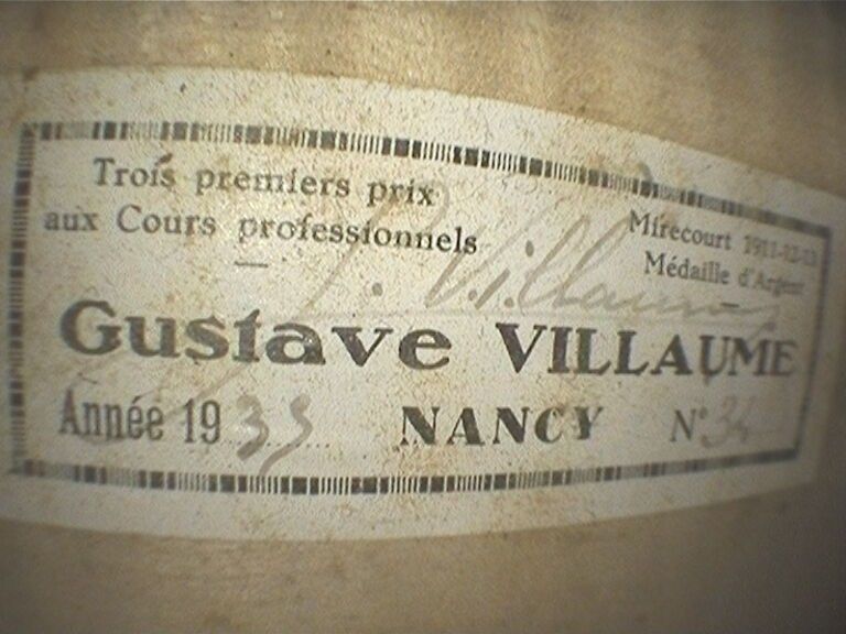 Violon de Gustave VILLAUME, fait à Nancy en 1935, numéroté 34 ; portant étiquette de Gustave Villaume, signature, et marque au fer sous le talon. Bon état. 357mm [VREXP1]