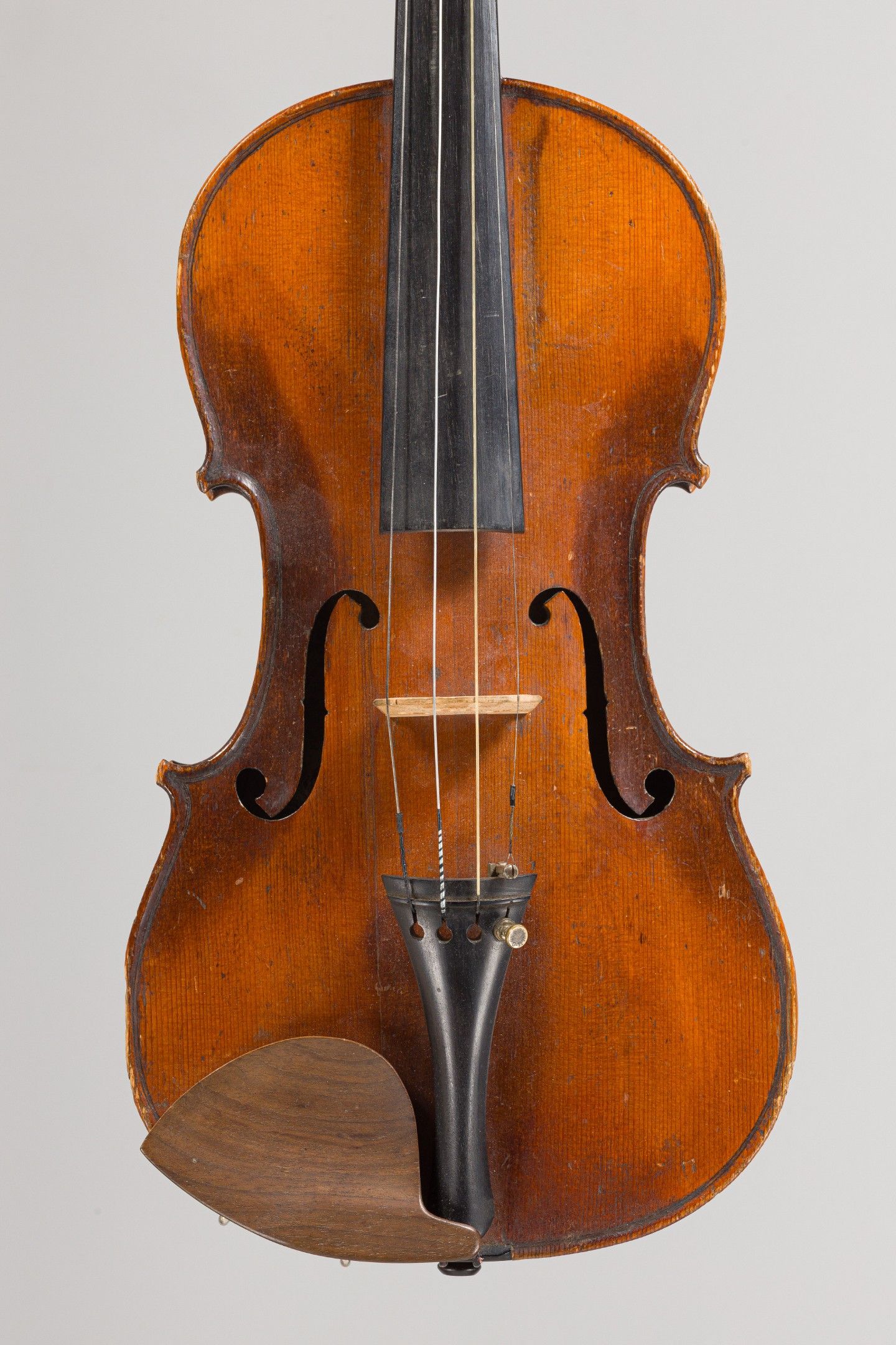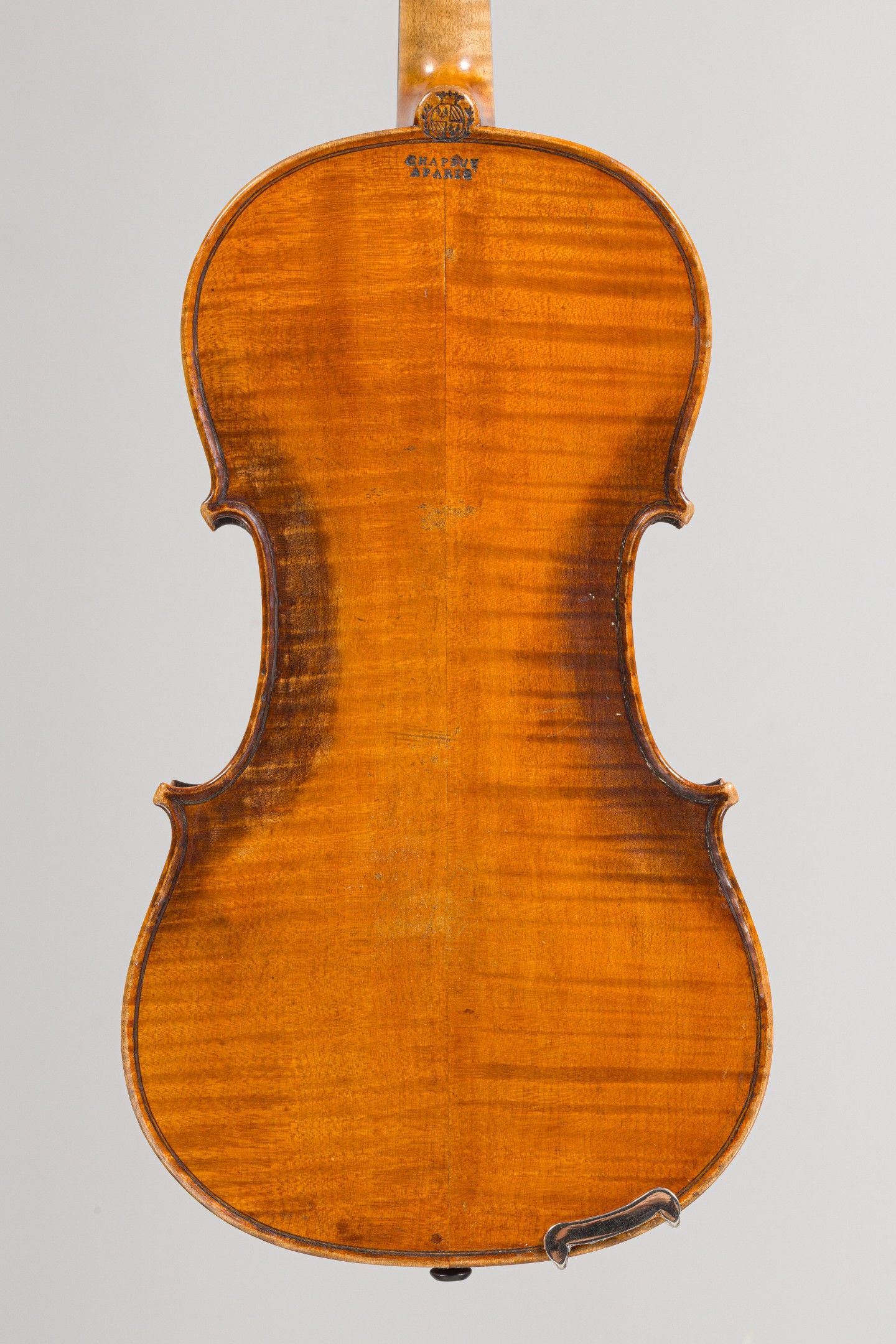 Violon de Nicolas CHAPPUY, fait à Mirecourt en 1774 ; portant étiquette Augustinus Chappuy et marque au fer sous le talon de Chappuy. Cassures sur la table, pièce sur l'éclisse avant gauche, traces de vers sur les éclisses. 358mm [VREXP1]