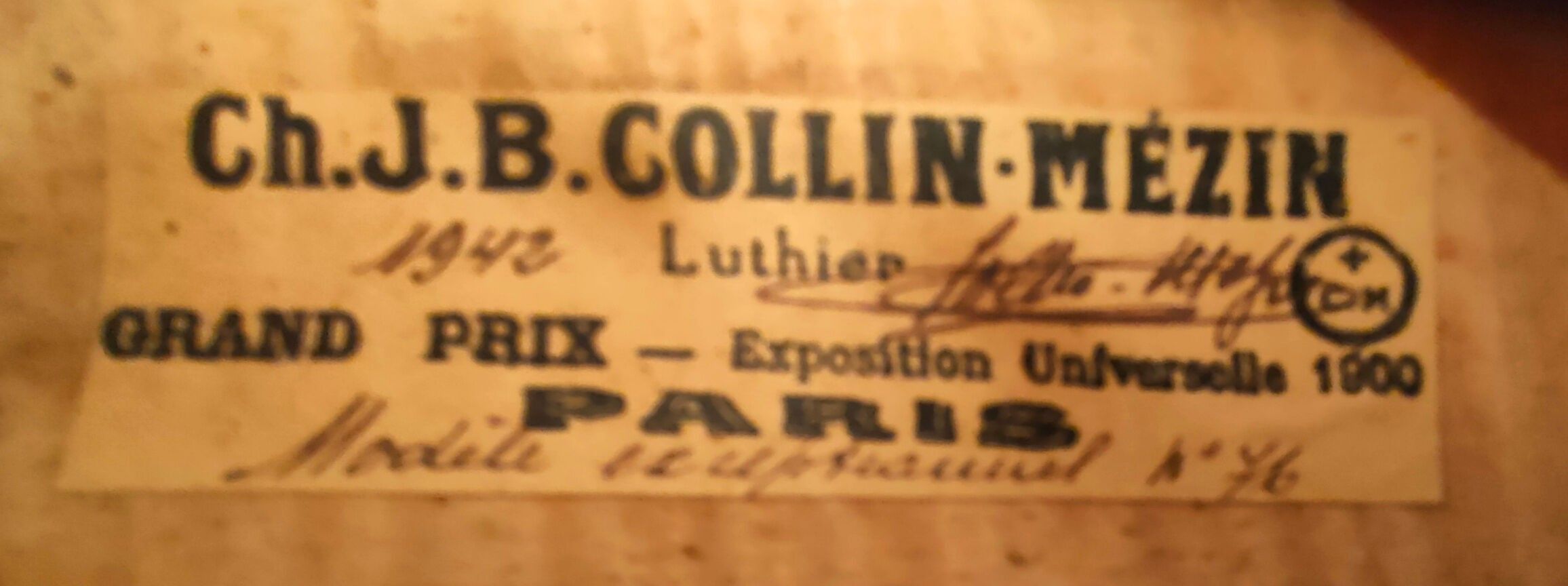Violon de Charles Jean-Baptiste Léon COLLIN-MÉZIN, fait à Mirecourt en 1942 ; portant étiquette de Collin Mézin, signature(s) de l'auteur. Assez bon état. 362mm. [VRVI2512_081-VREXP1]