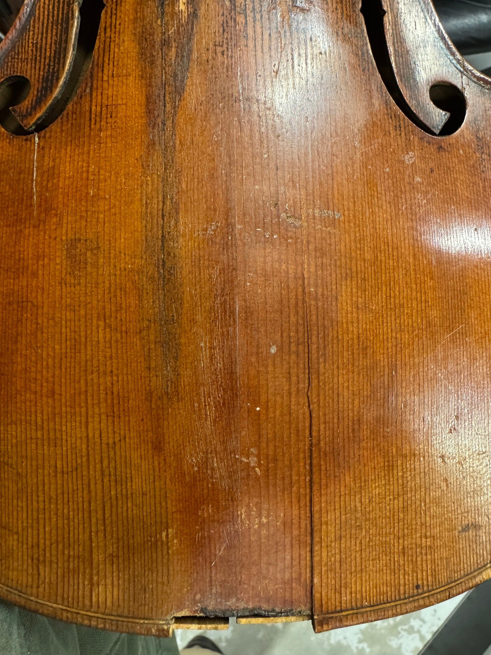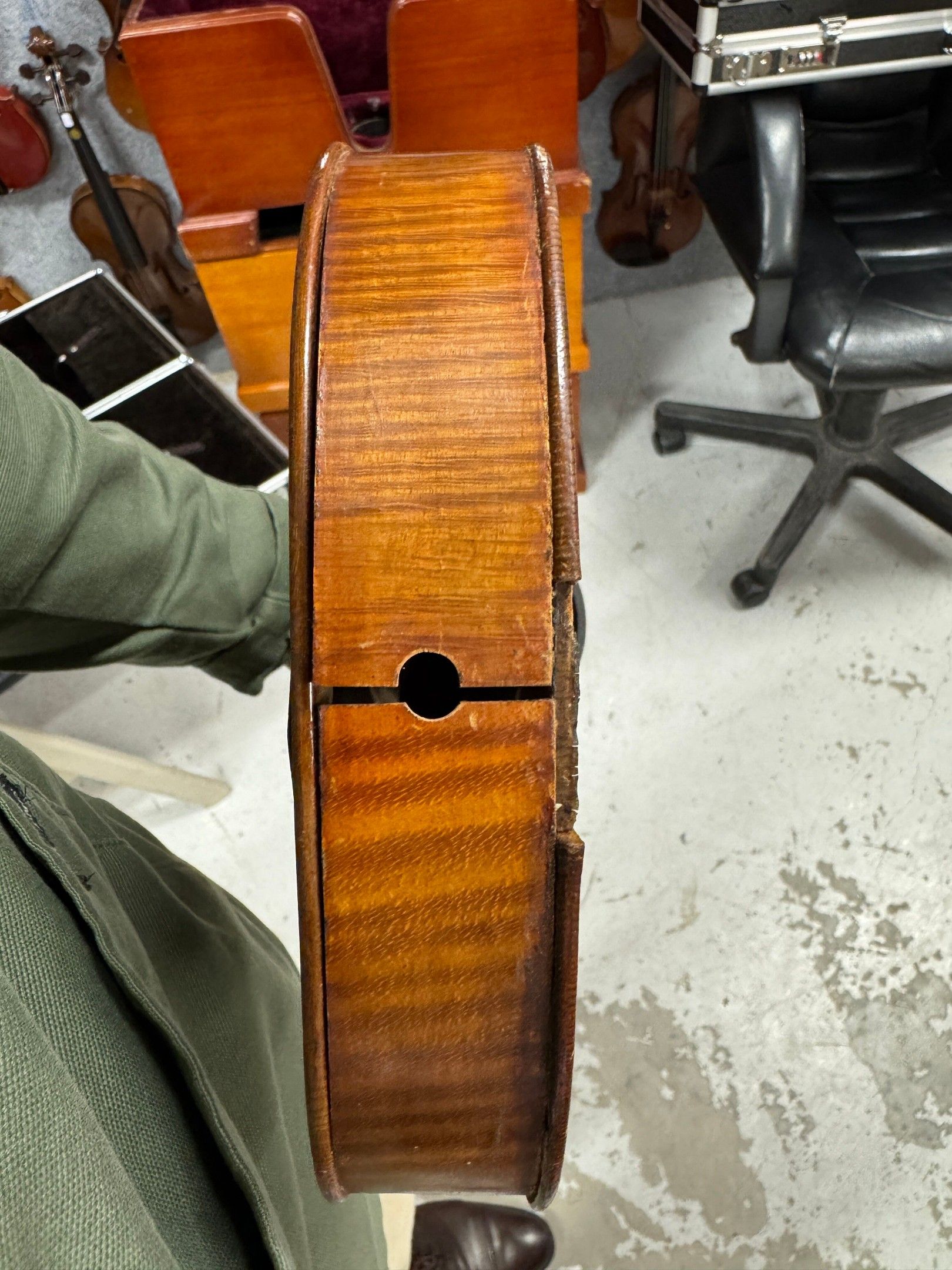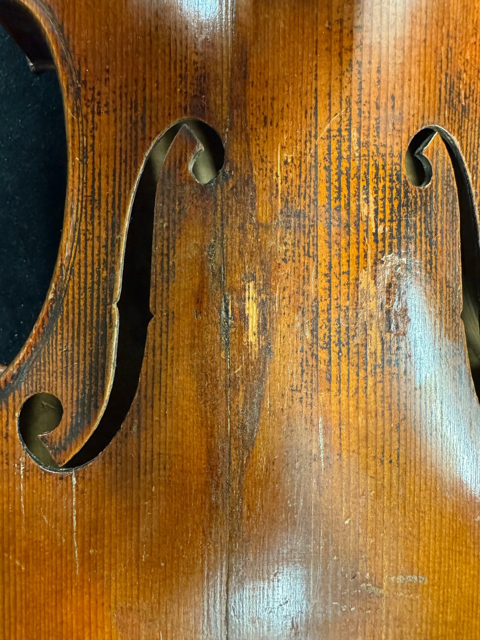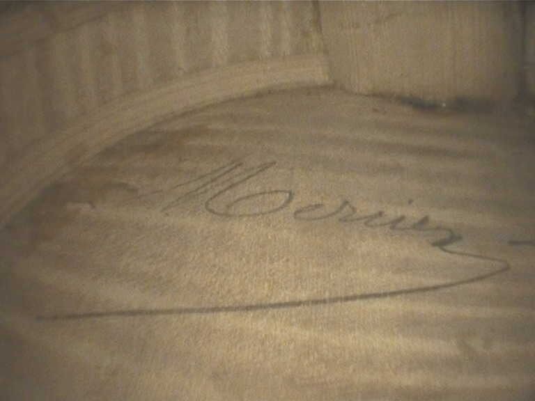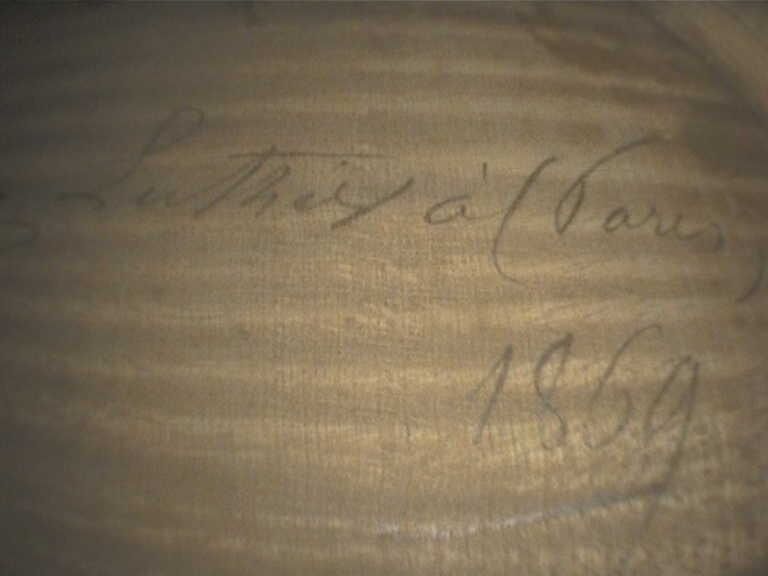 Violon de Louis Constant MERCIER, fait à Paris en 1869, portant étiquette apocryphe Guarnerius et signature Mercier à Paris sur la table. Quelques restaurations, dont cassure près de la barre, éclisse et tasseau arrière décollés, restaurations sur l'éclisse avant. 357mm. This instrument is more than 100 years old.